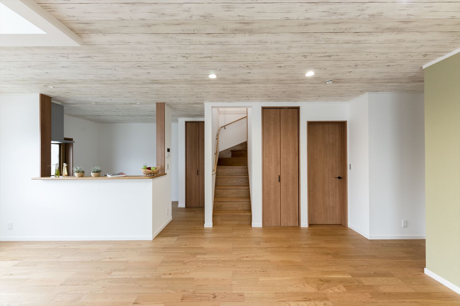 「玄関→リビング→階段→2階へ」リビングを必ずと通って2階へ。家族が自然と顔を合わせるリビングイン階段を採用。