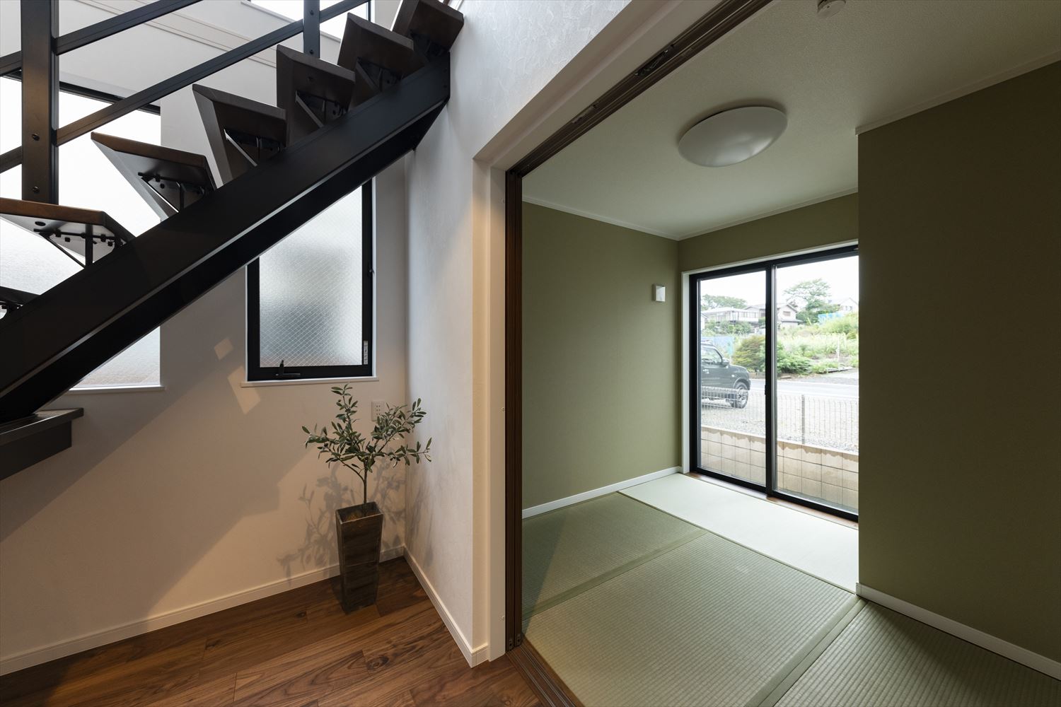 畳と壁のさわやかな緑が空間を彩る1階畳敷スペース。
