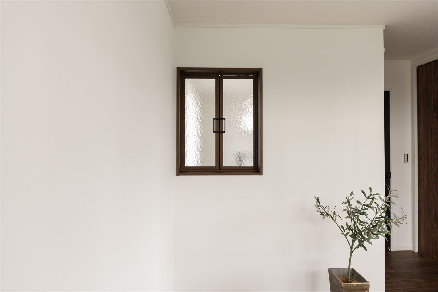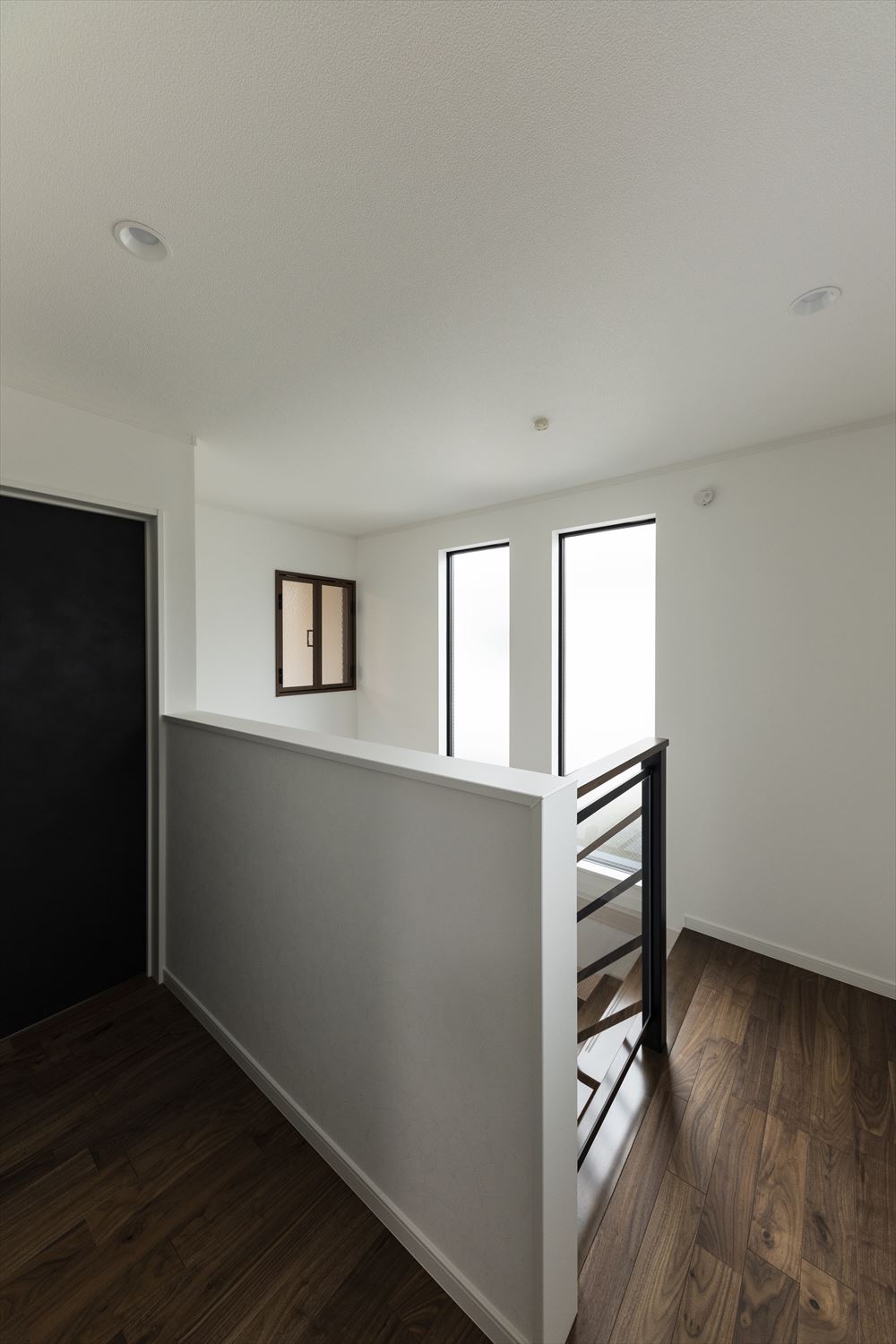 リビングと玄関、二階を繋ぐスペースにはスリット階段&吹き抜けを採用。二階主寝室には風や光を取り込む「室内窓」を設置しました。