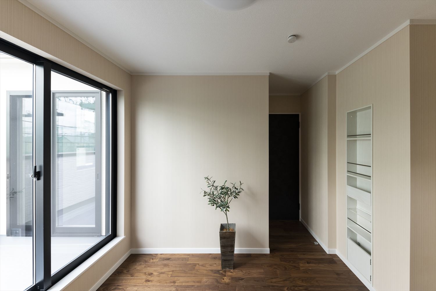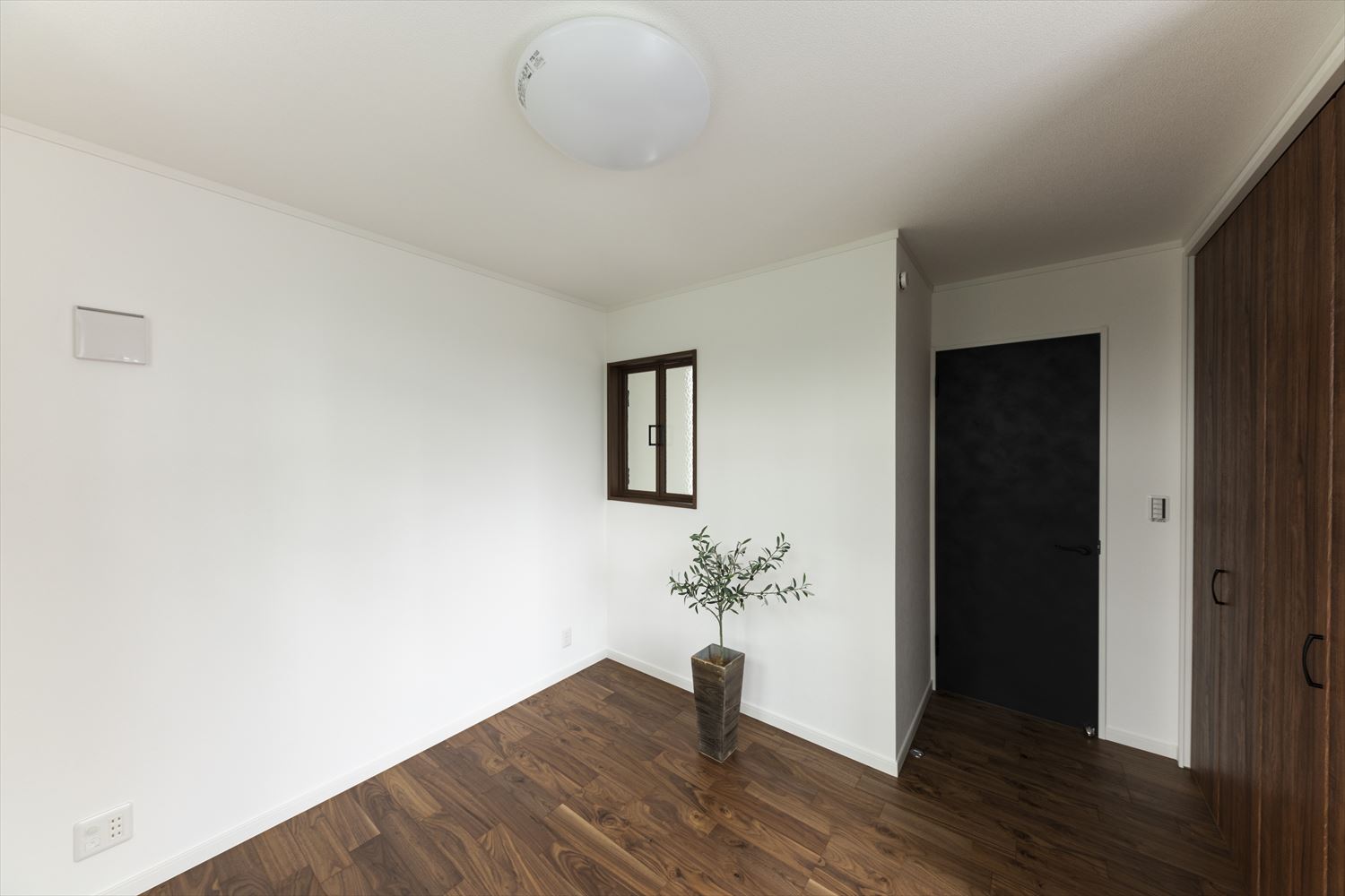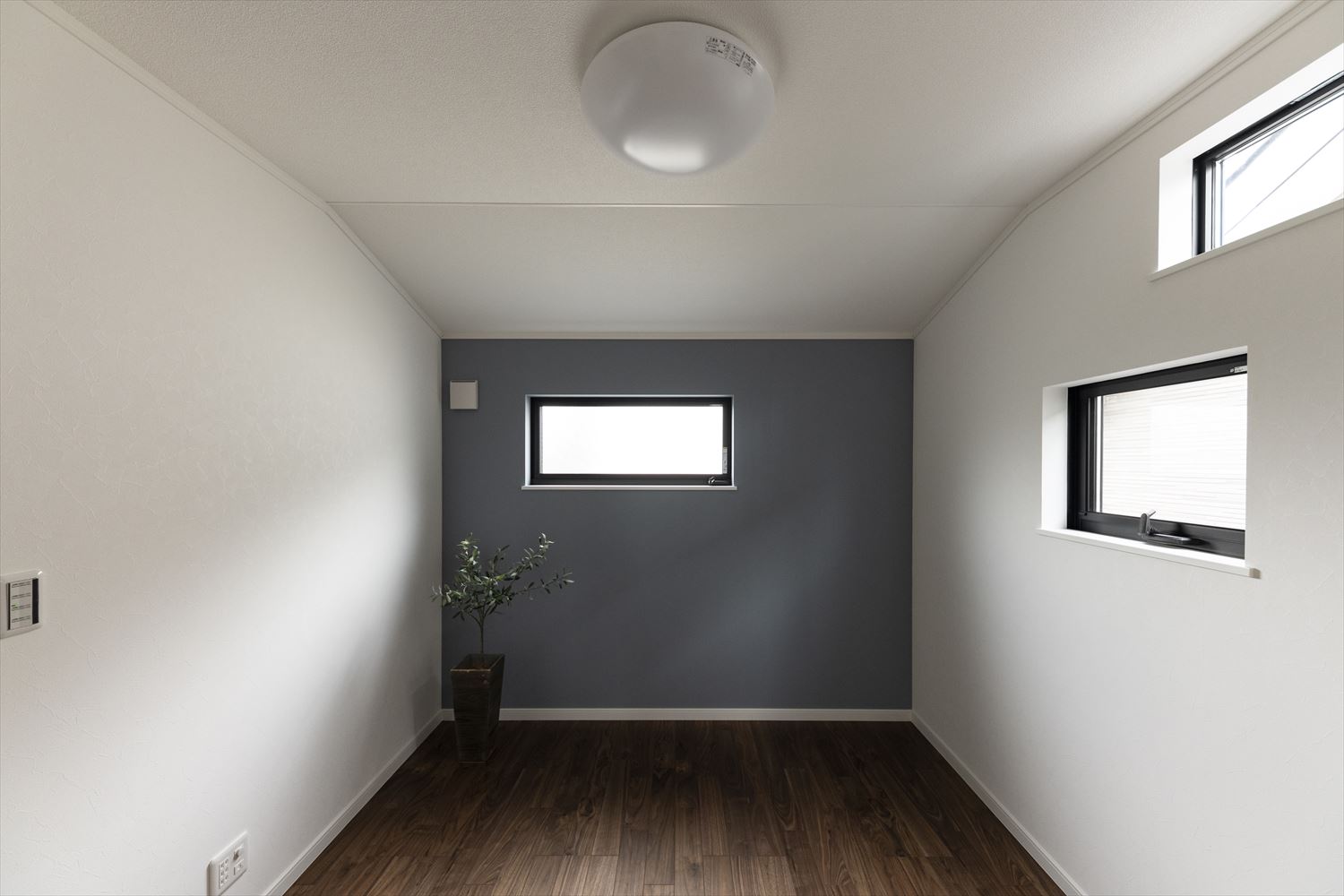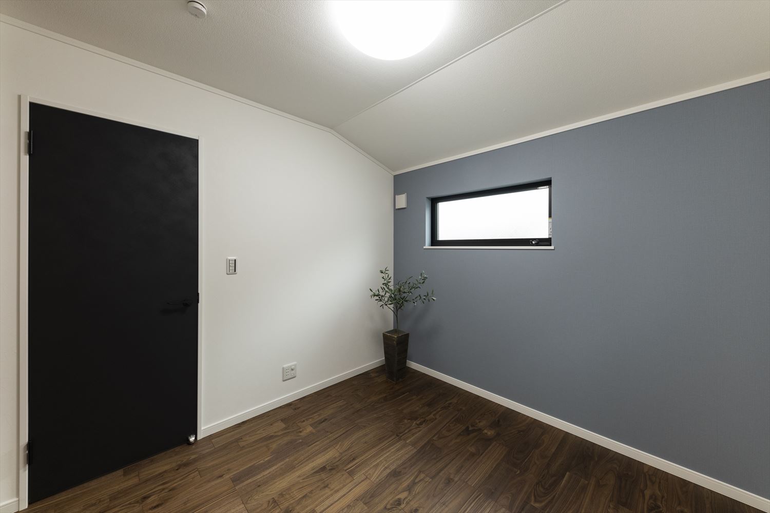 モノトーンカラーの壁紙がモダンな雰囲気を演出する二階洋室。
