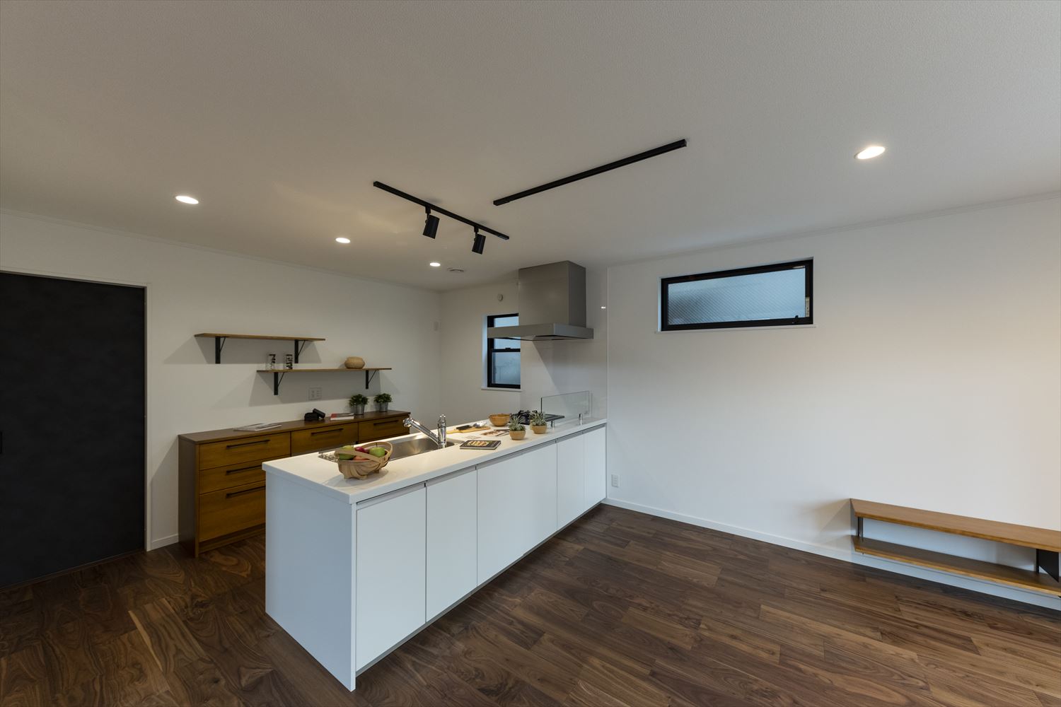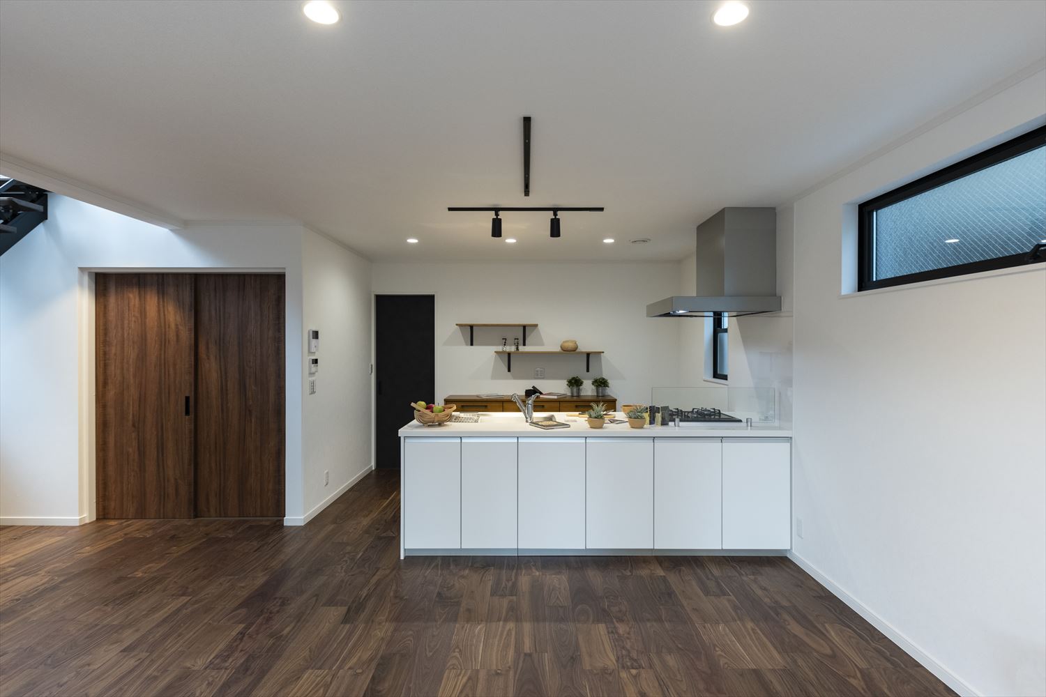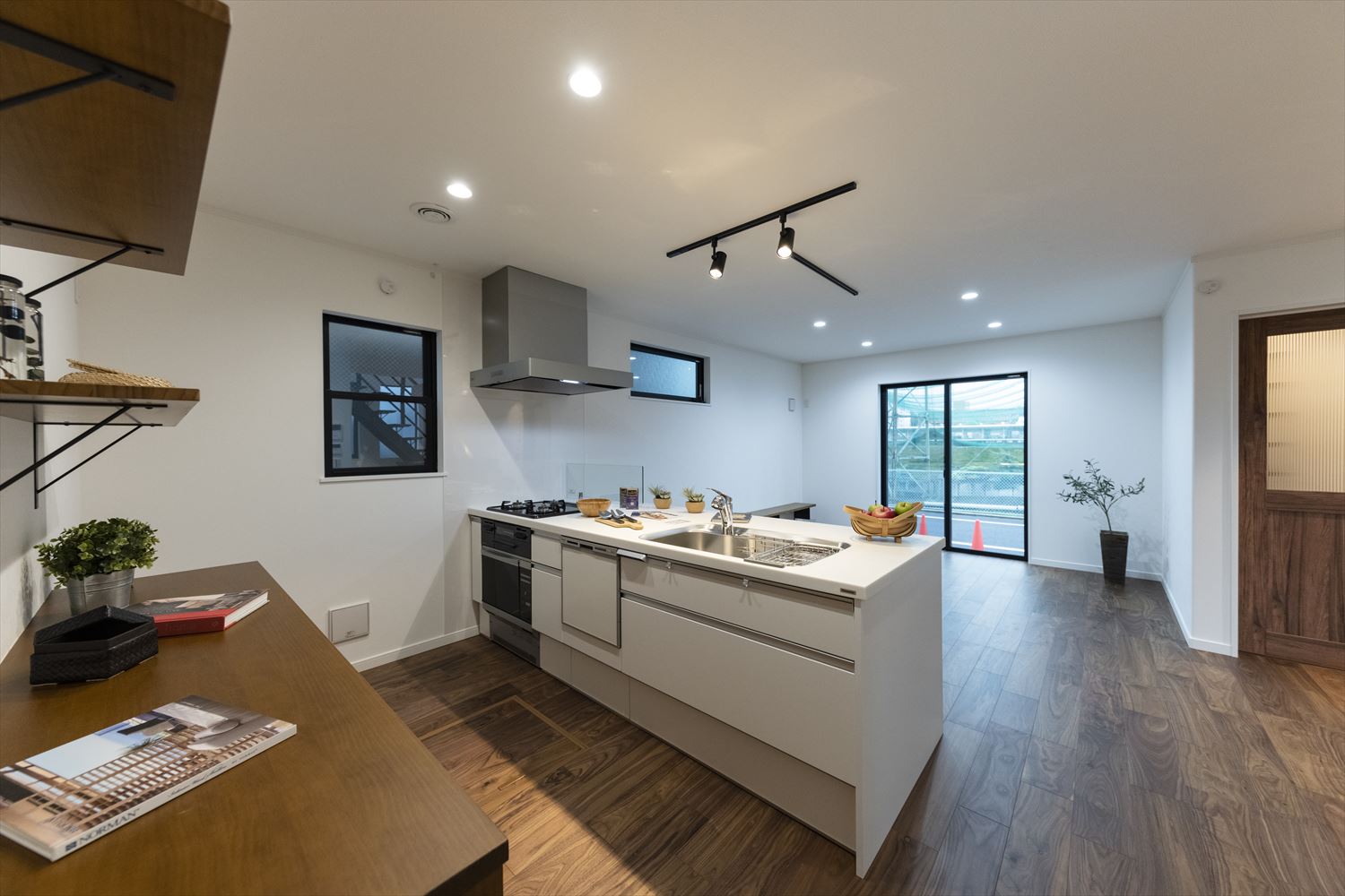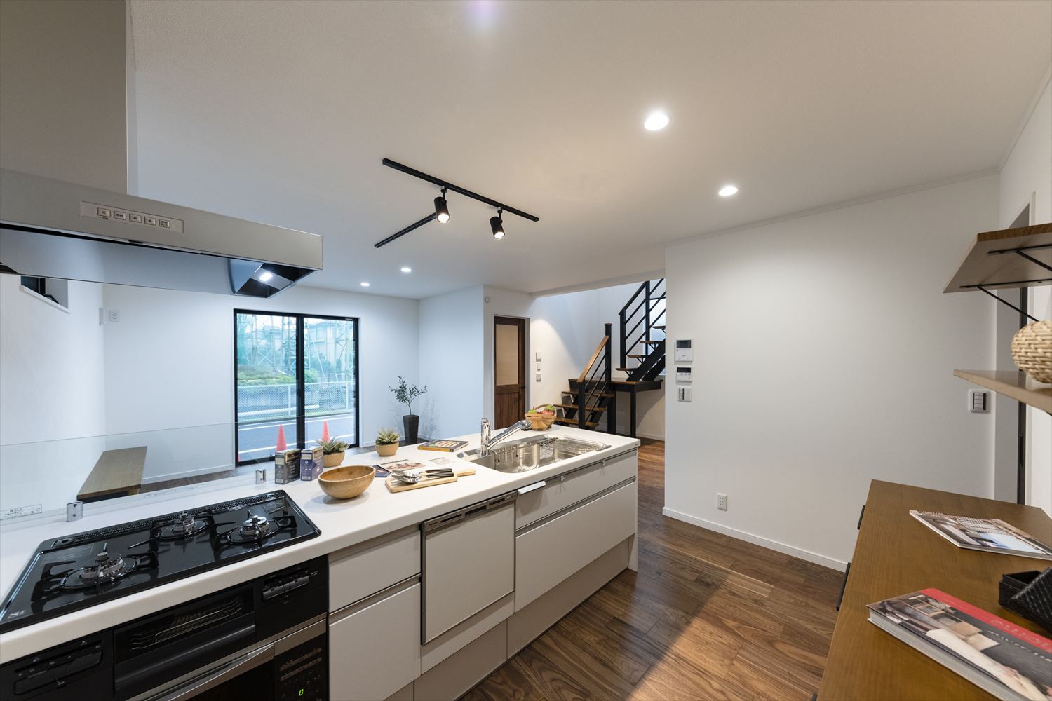 ビルトインオーブンレンジ、食器洗い乾燥機機、おしゃれな背面収納やダイニング側収納など、見た目と使いやすさに拘ったキッチンスペース