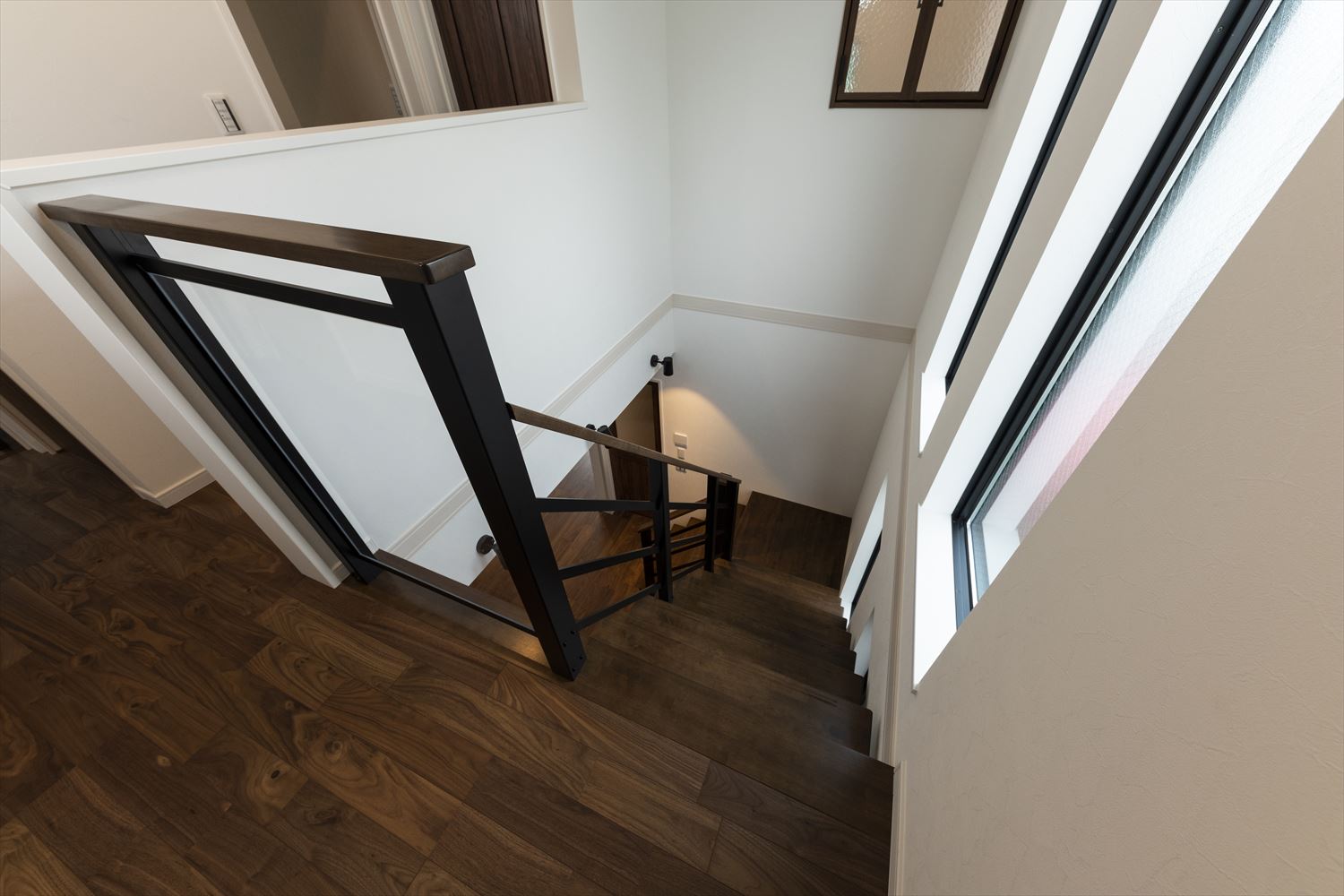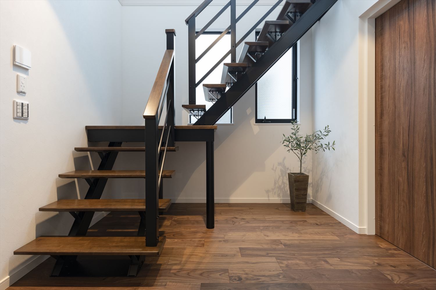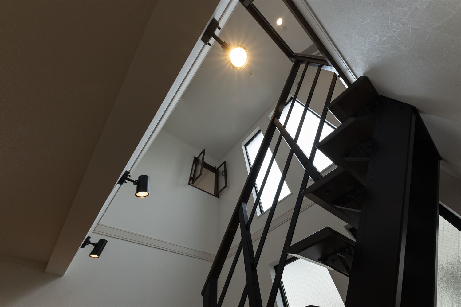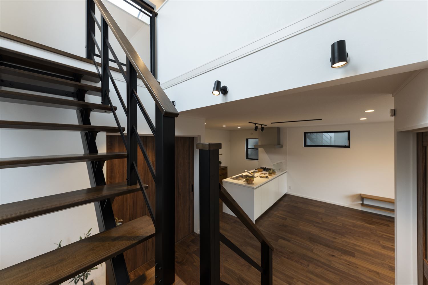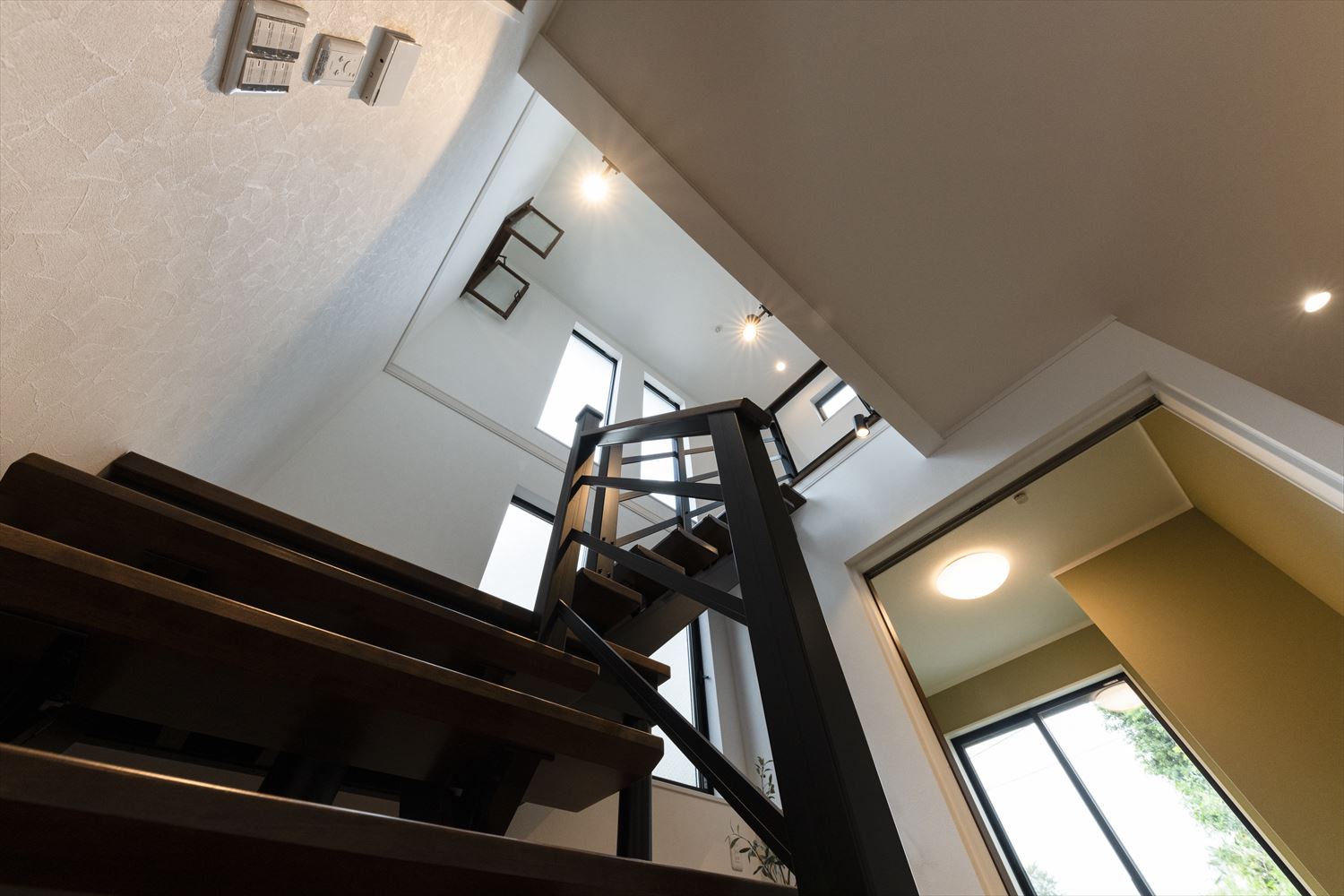 リビングと玄関、二階を繋ぐスペースにはスリット階段&吹き抜けを採用。