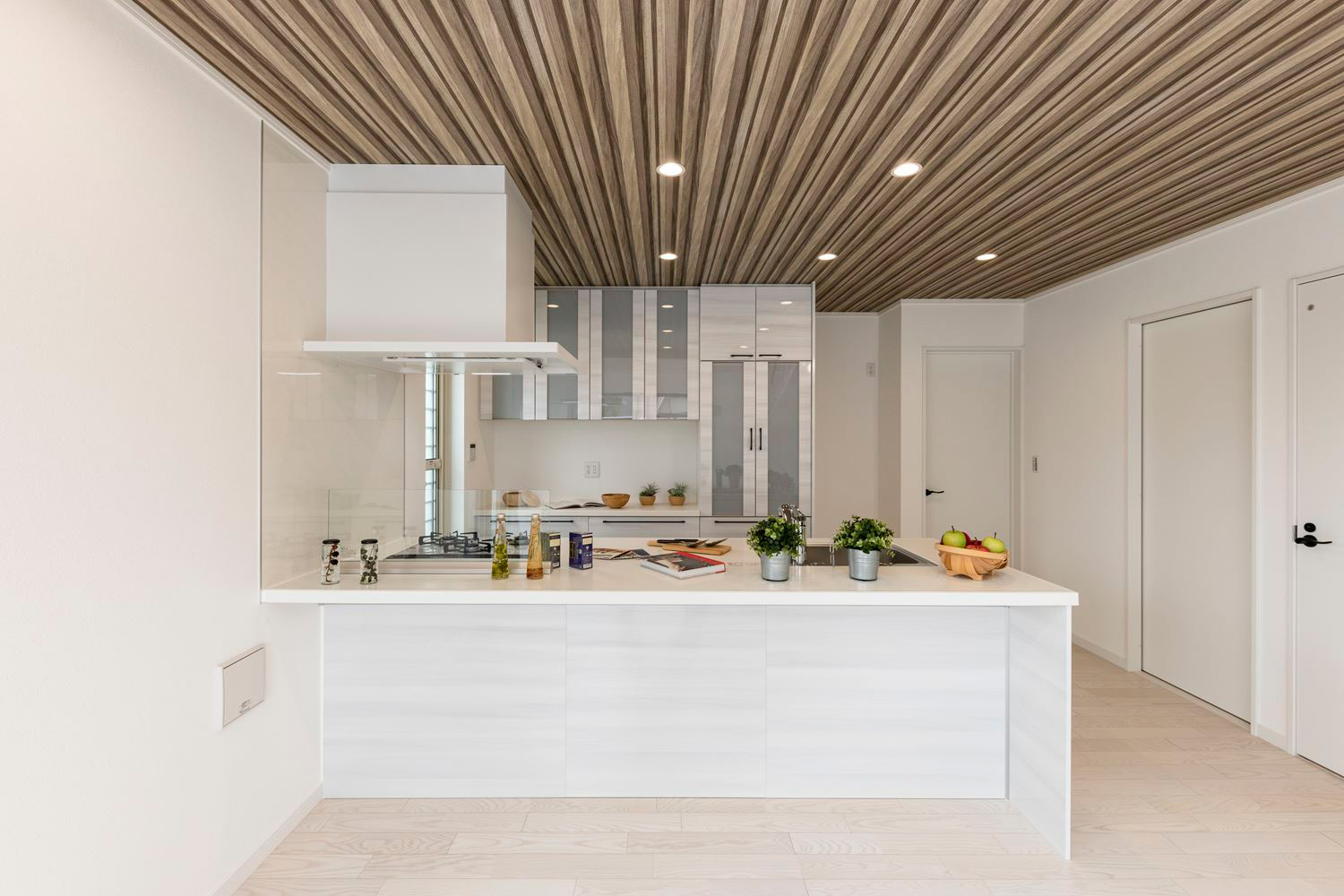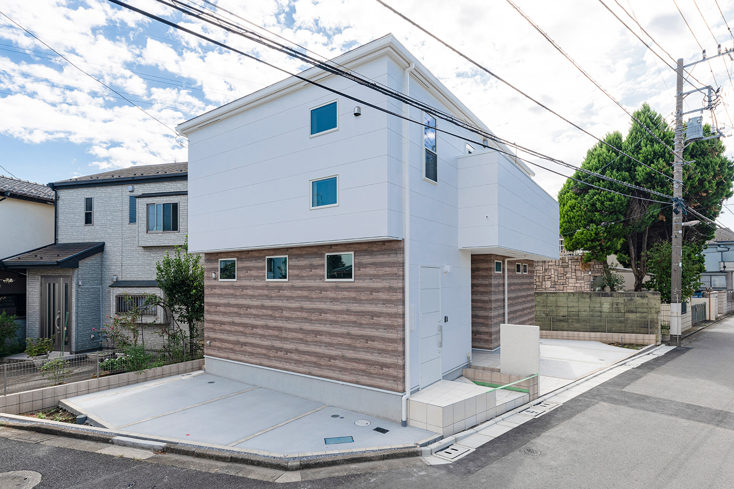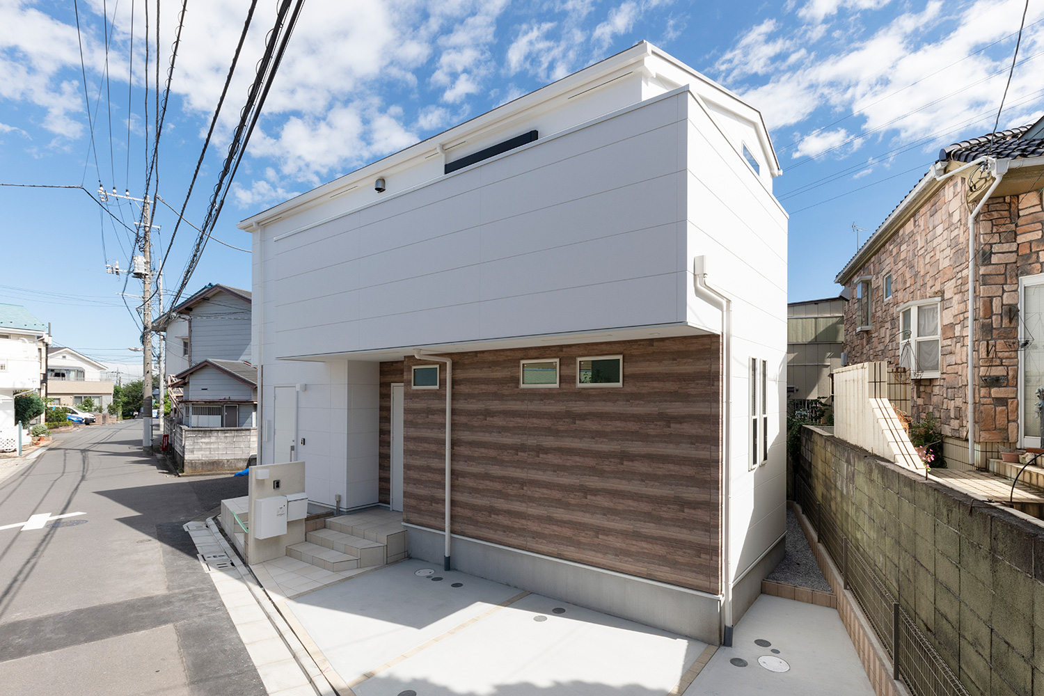 青空に映える白×木目 爽やかな印象を与えるモダンな家