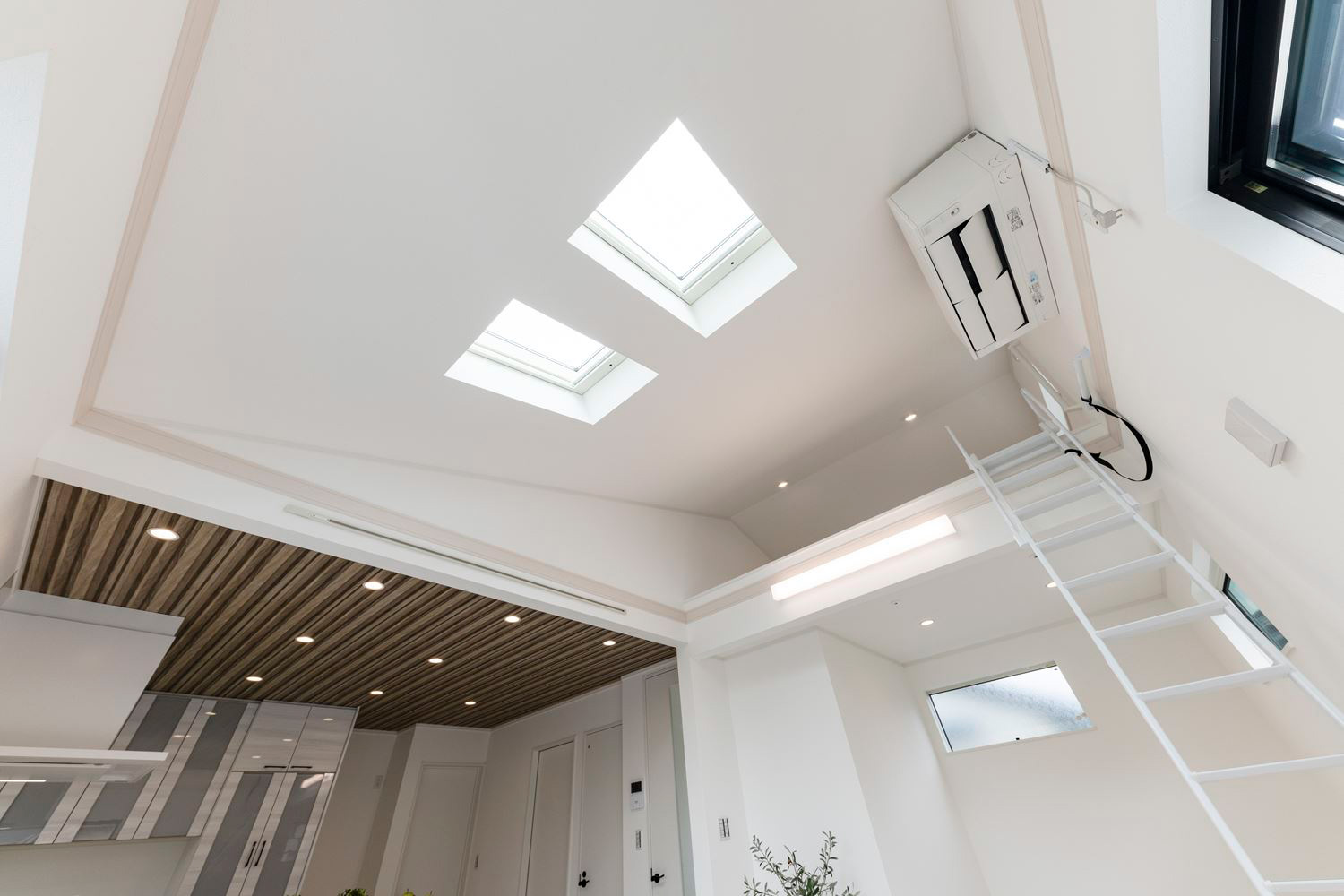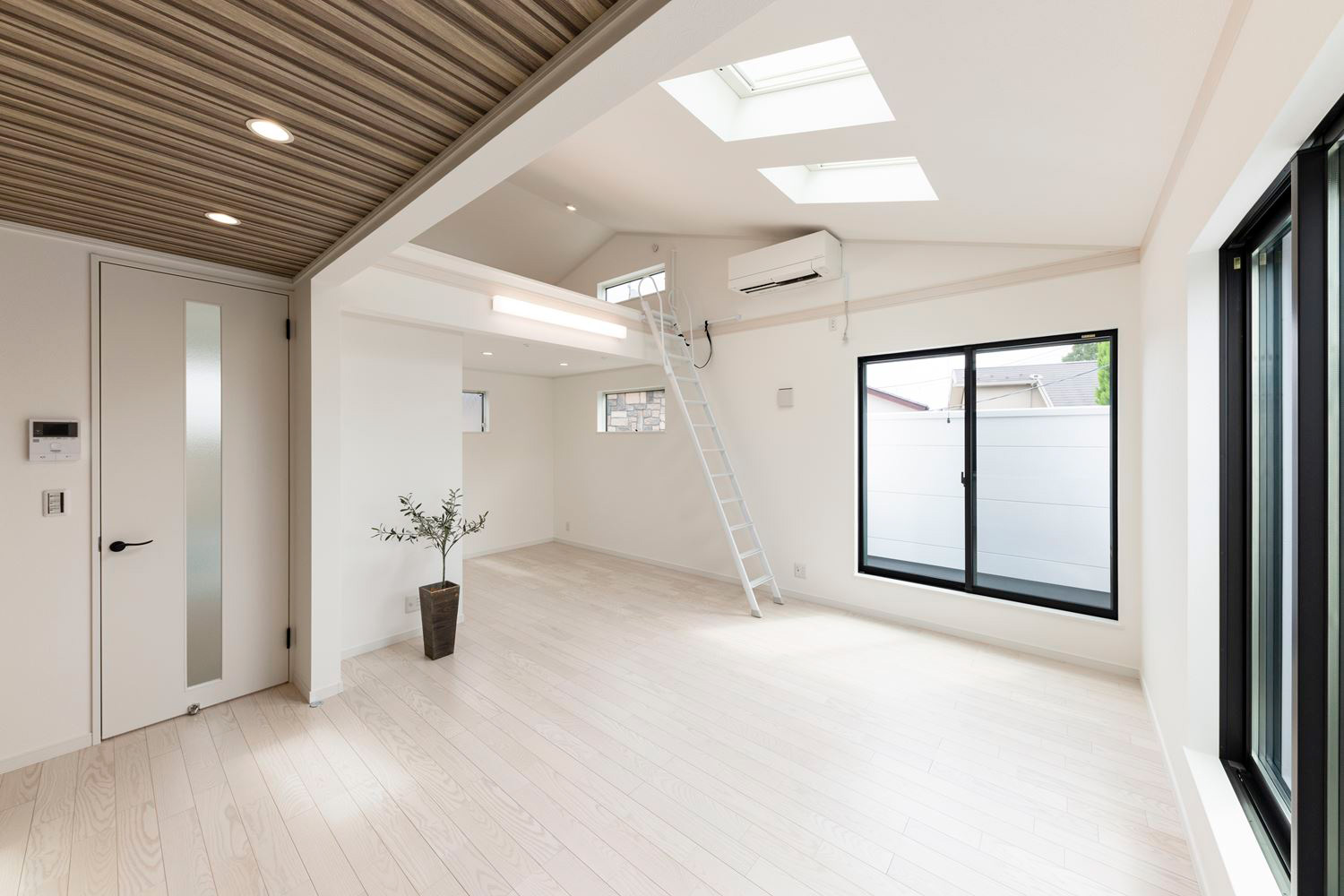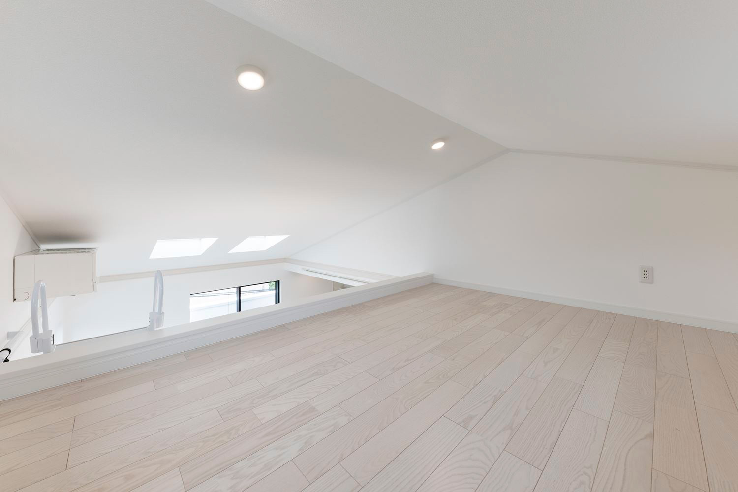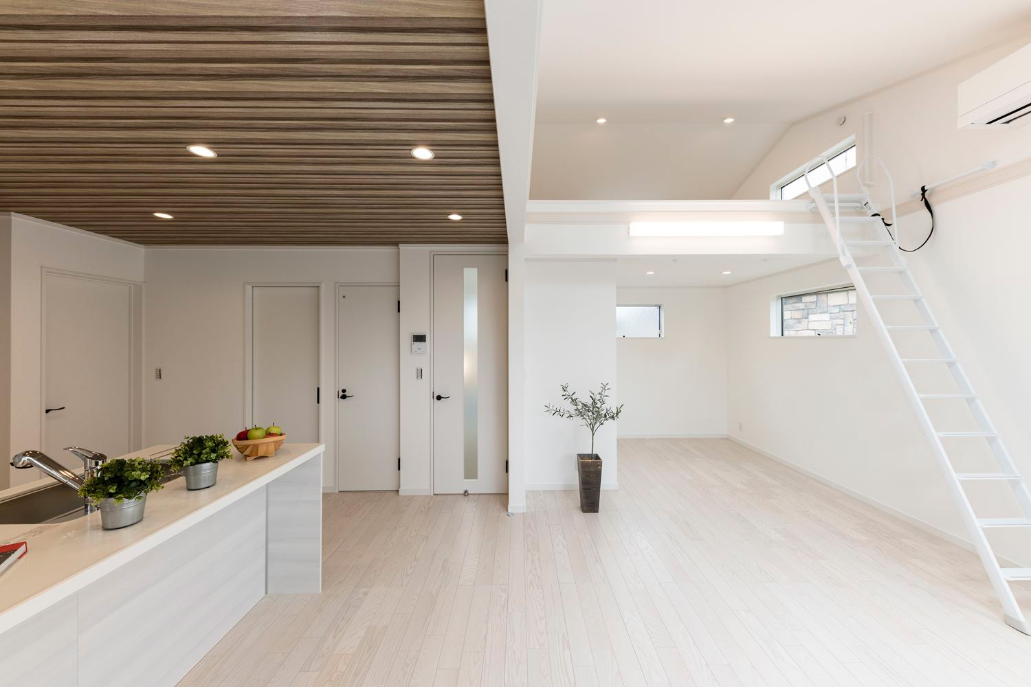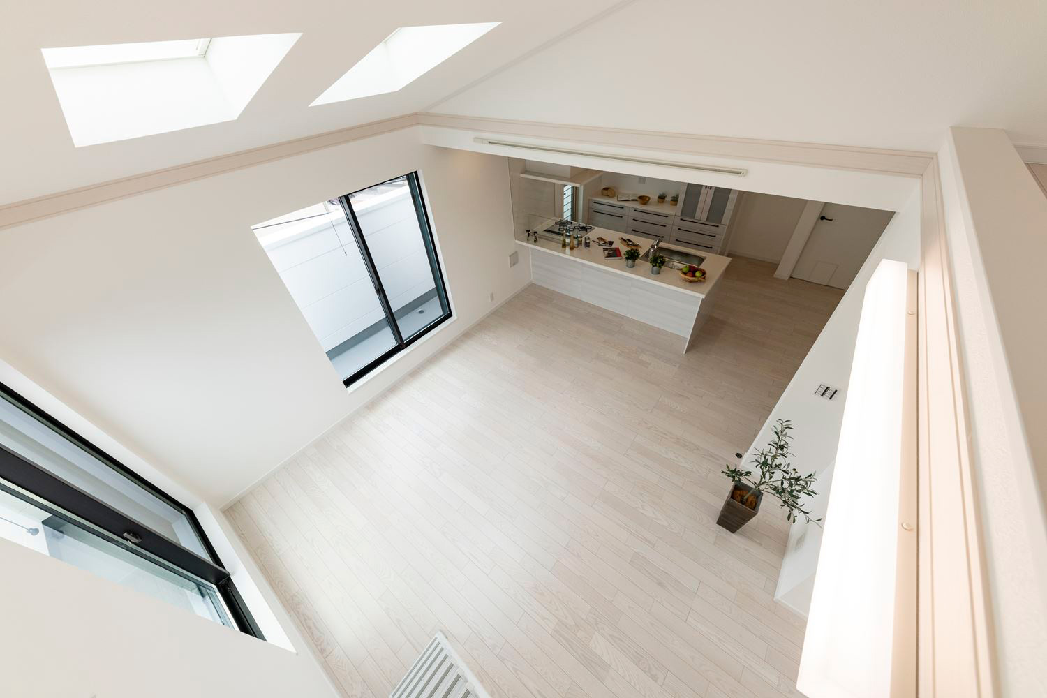 床やクロス等様々な「白」を主役とし、開放感に溢れたモダンな室内が印象的なお家。2階リビングはロフト+トップライトで明るく開放的な空間になり、ワンちゃんやネコちゃんにも嬉しい団らんの場になりました。