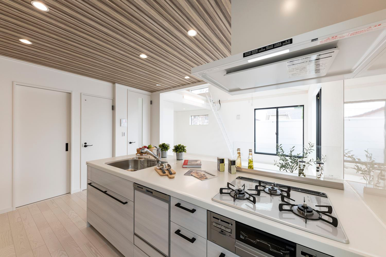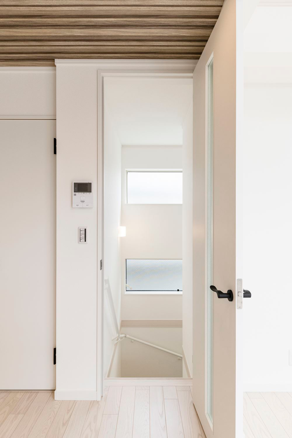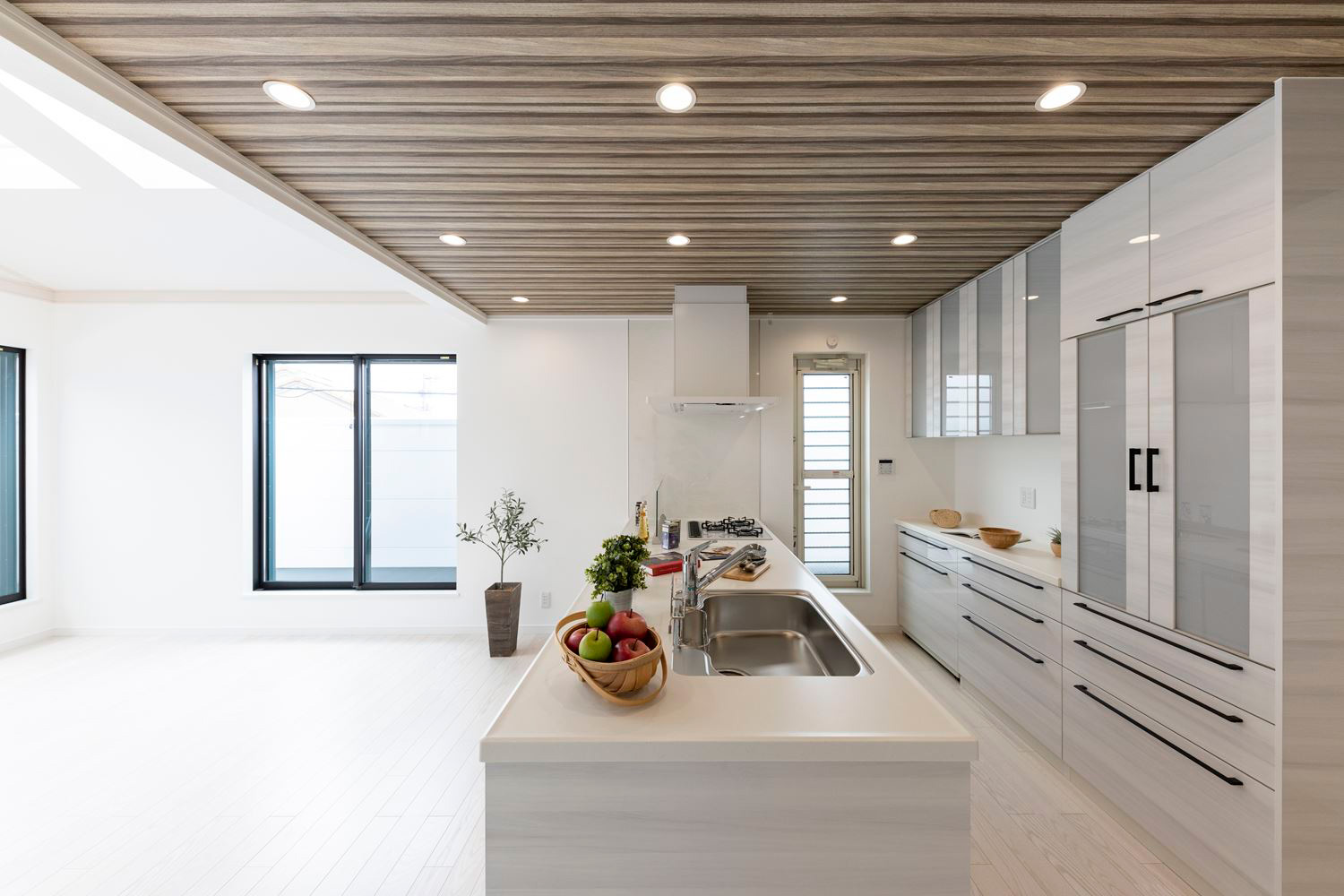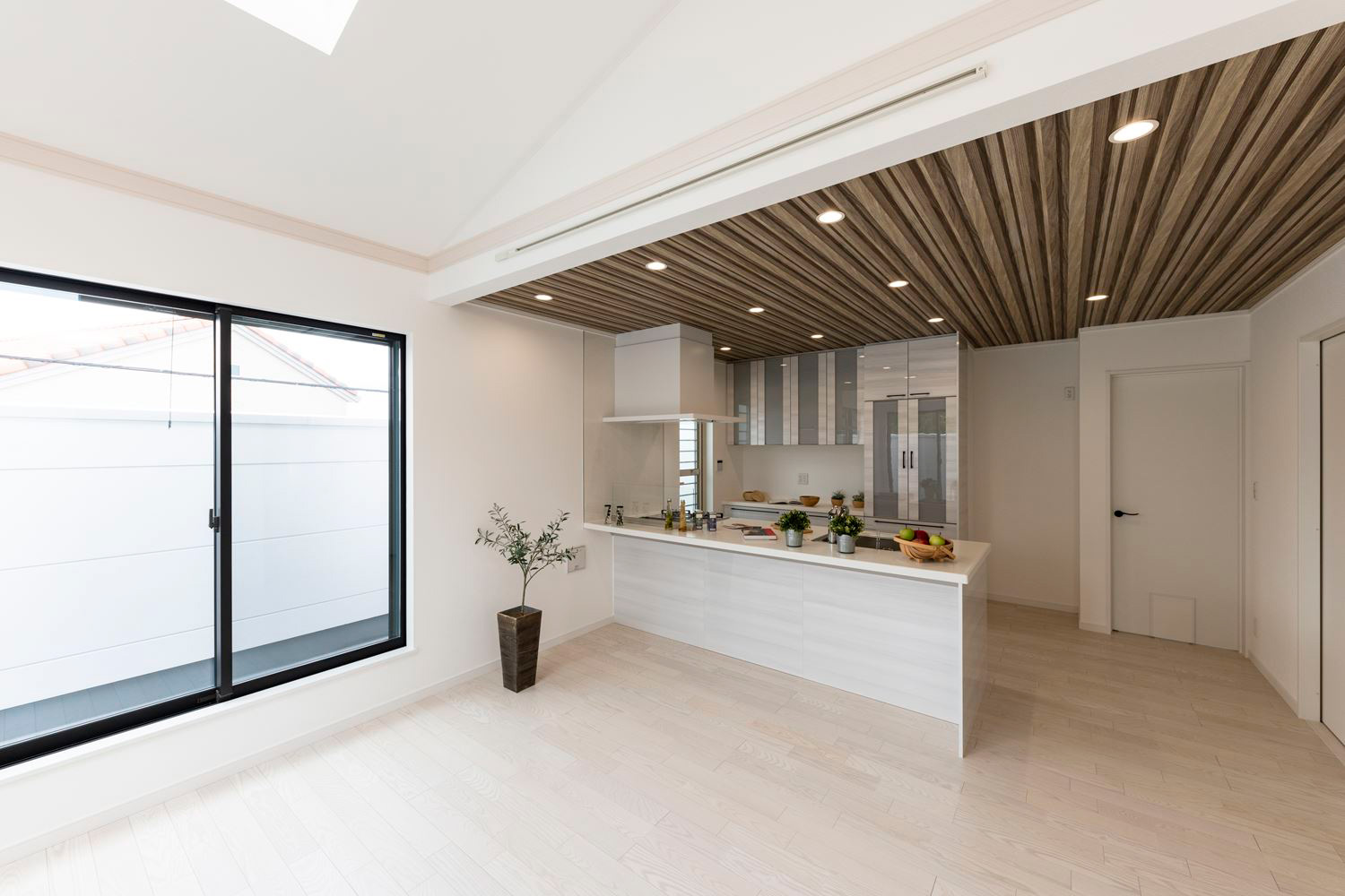 床やクロス等様々な「白」を主役とし、開放感に溢れたモダンな室内が印象的なお家。2階リビングはロフト+トップライトで明るく開放的な空間になり、ワンちゃんやネコちゃんにも嬉しい団らんの場になりました。