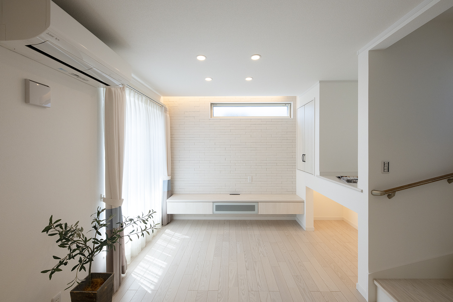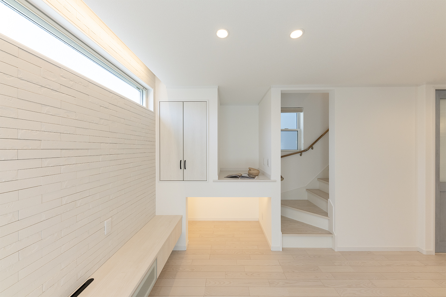 空気を美しく整えるインテリア壁材「エコカラット」をあしらったリビングステージ。
