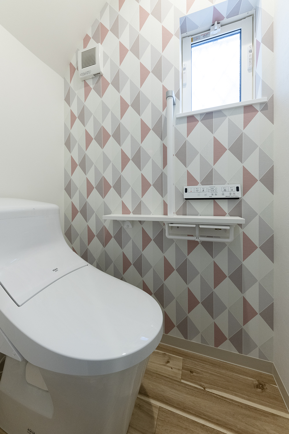ラメ入りの幾何学柄クロスがおしゃれな1階トイレ。