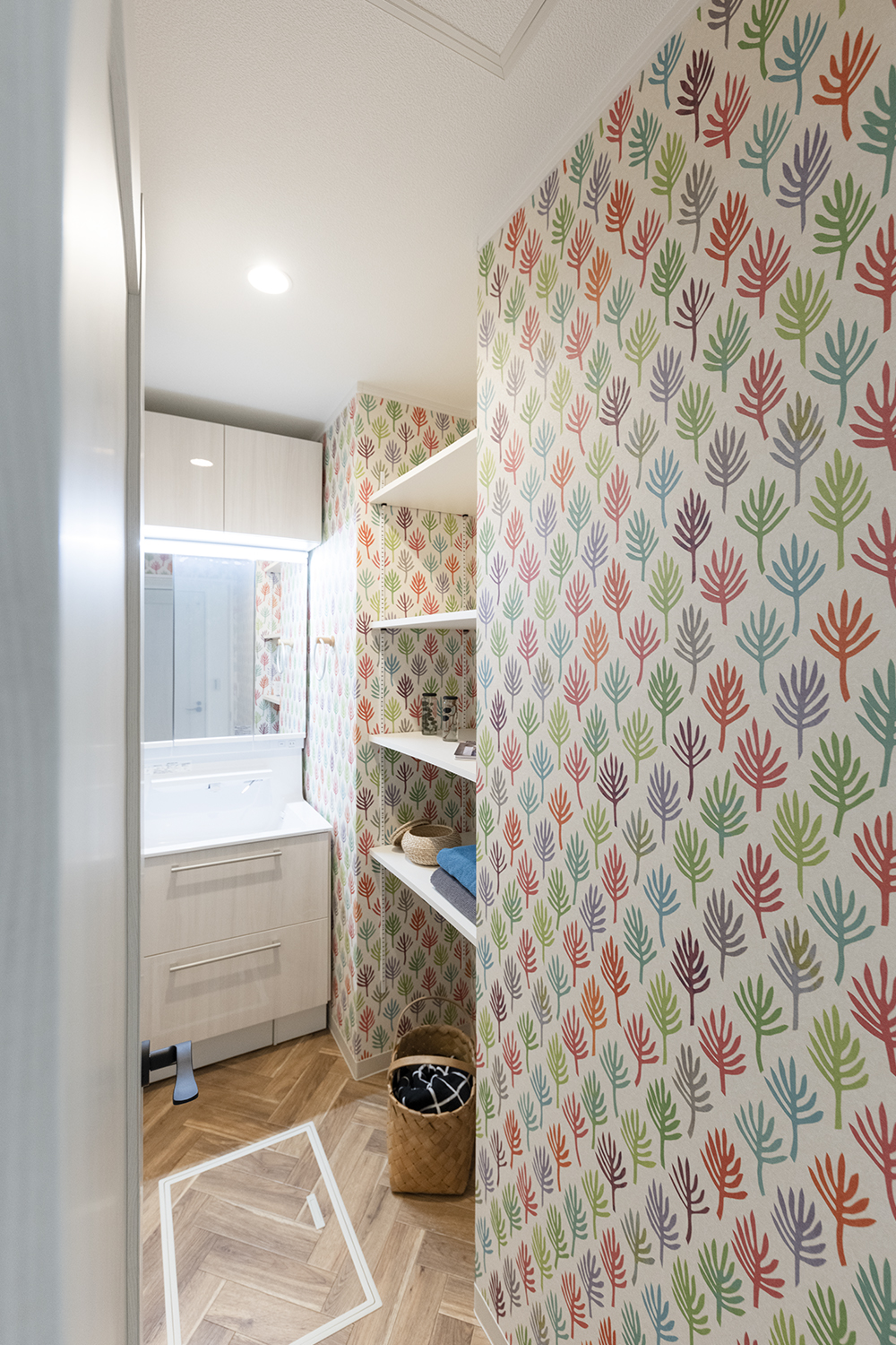 ホワイトカラーでまとめがちなサニタリールームも柄のクロスで個性的に演出して華やかな空間に。