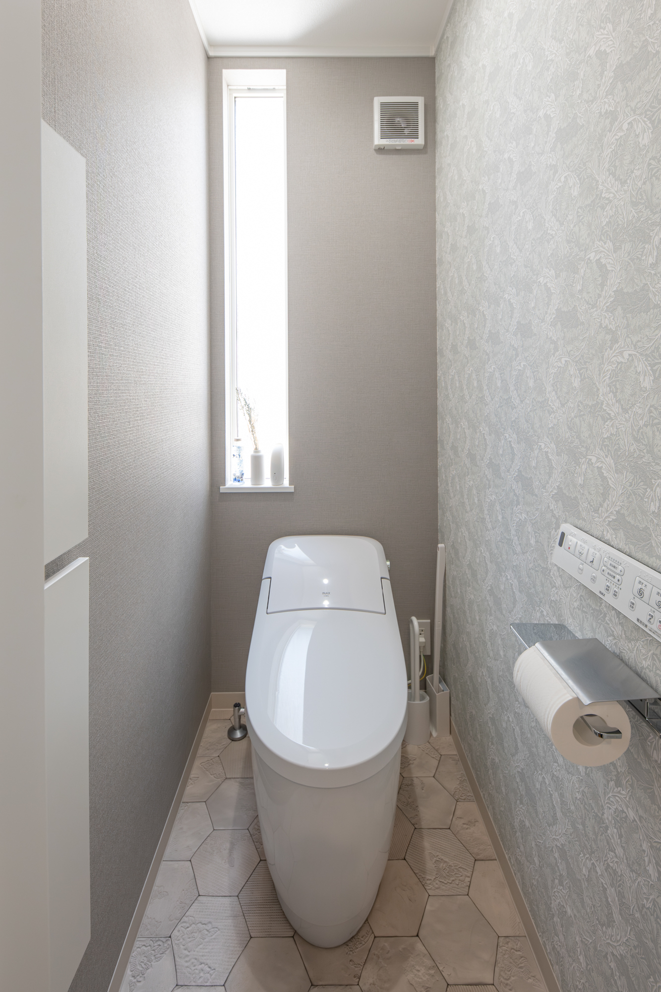 1階トイレ。コンパクトなタンクレストイレを採用してすっきりとした快適な空間を創りました。