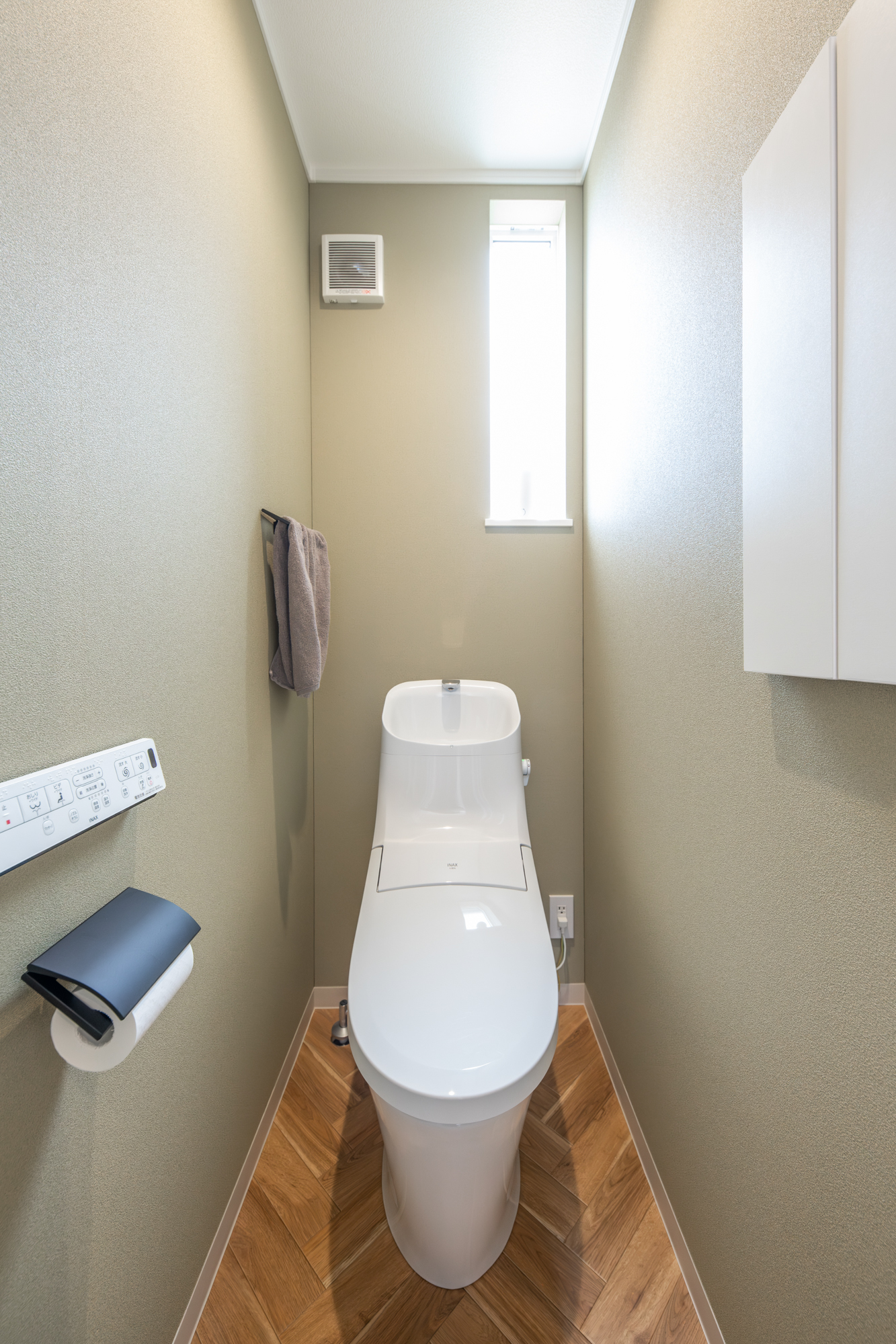 2階トイレ。キャビネットを設置して機能的でスッキリとした空間に。