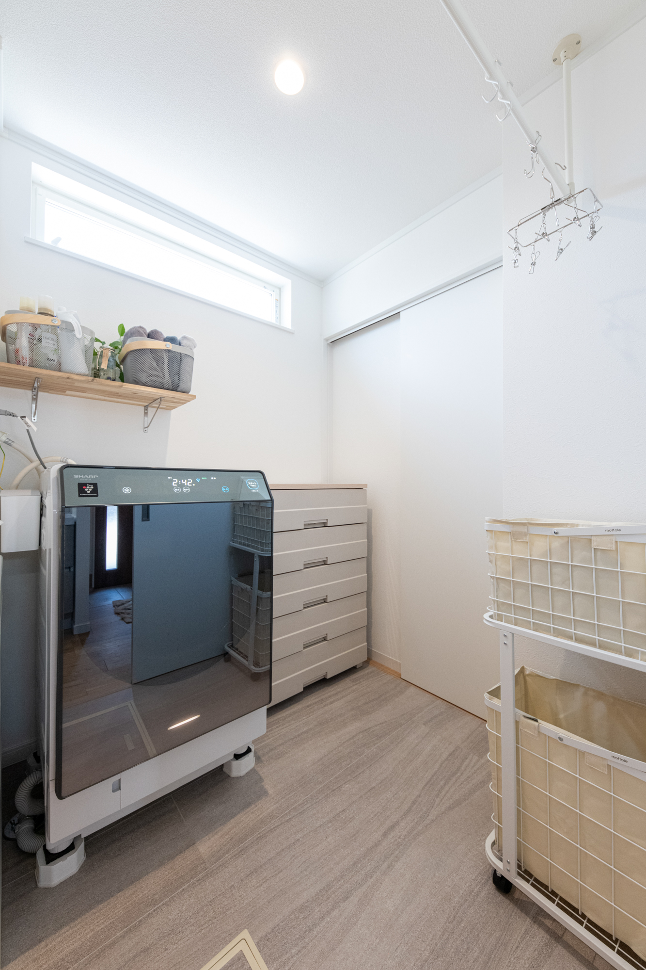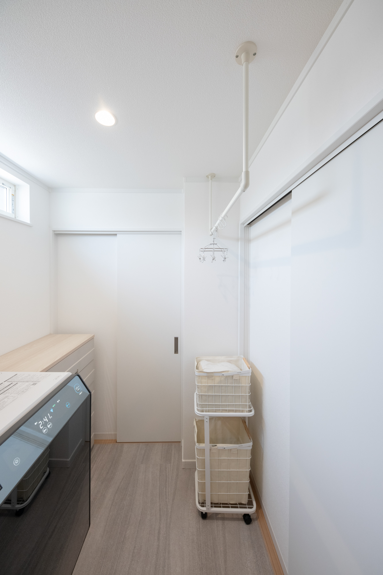脱衣・ランドリールーム。明るく爽やかな印象の空間。室内物干しを設え雨の日でも安心して洗濯物を干すことが可能です。