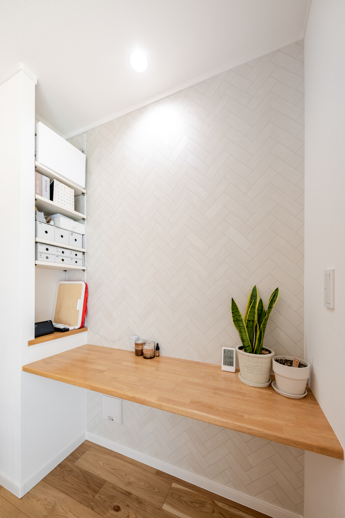 キッチン横には勉強やPC作業をするのに丁度良い広さのスタディカウンターを設えました。文房具などがしまえる便利な収納スペース付き。