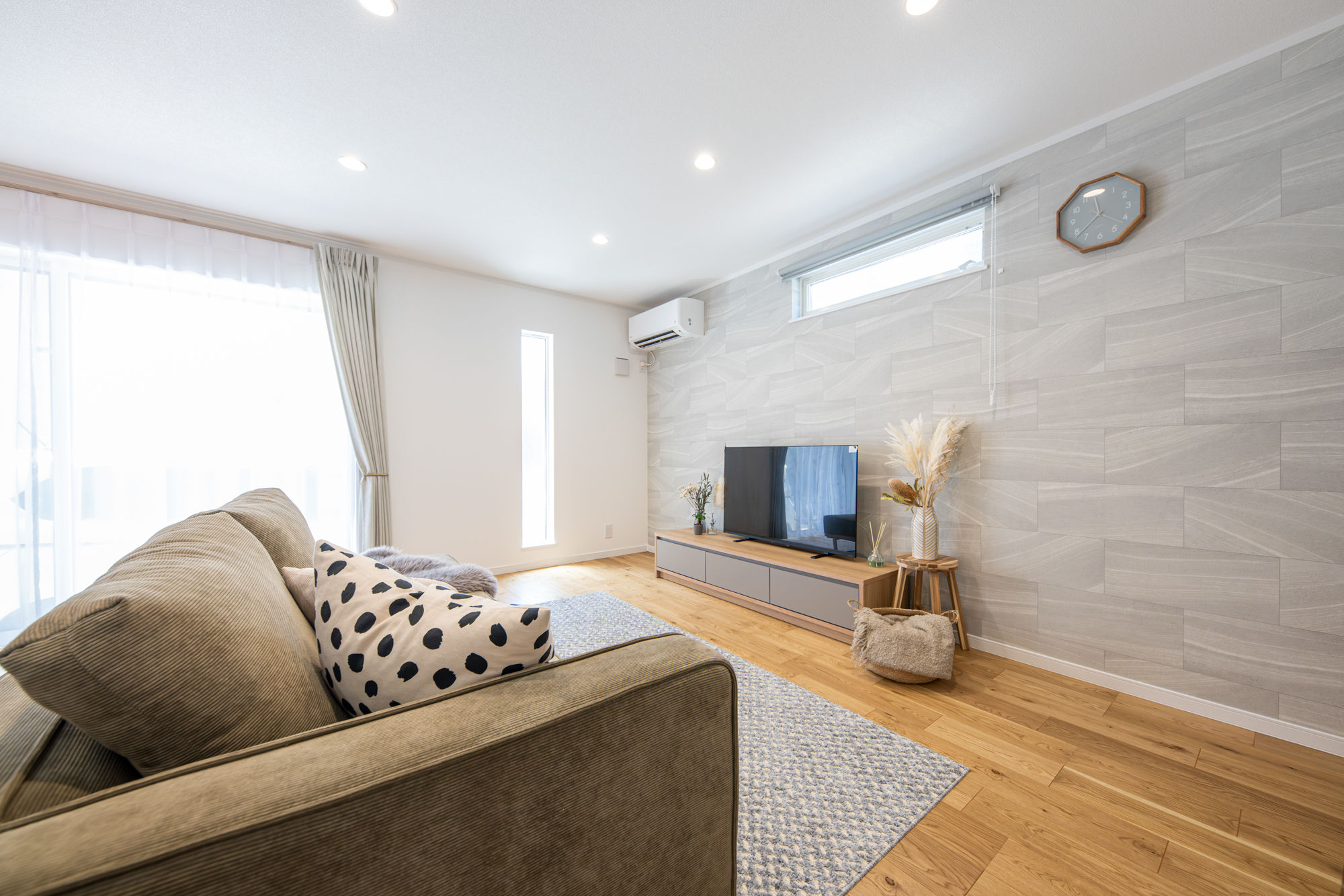 フローリングの木目とアクセントクロスの石目調が自然を感じるナチュラルテイストな空間を演出するLDK。