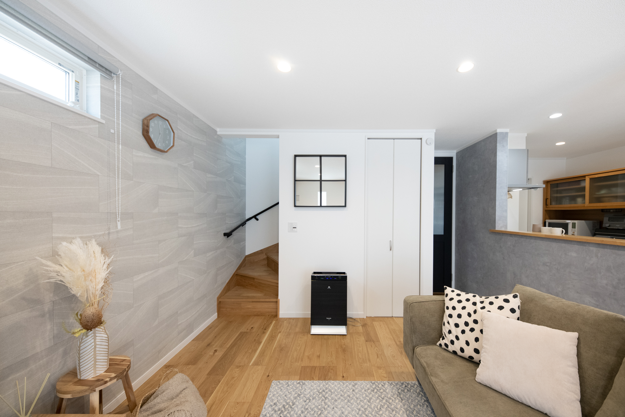 リビングイン階段を取り入れることで、ご家族が自然と顔を合わせる機会が増えます。室内窓風のおしゃれな鏡が空間のアクセントに。