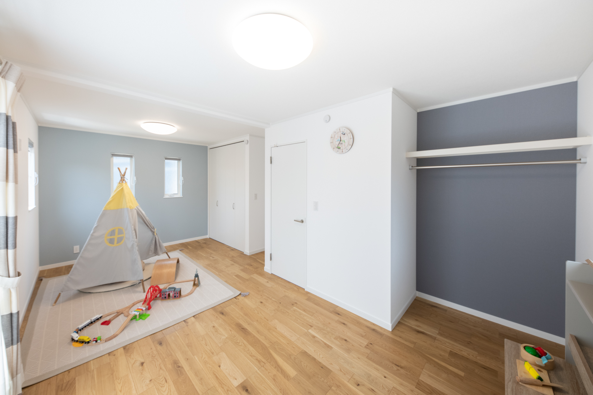 2階、10.5帖の2ドア1ルームの洋室。将来的に壁を設けて仕切れるのでご家族の成長に合わせてフレキシブルにご利用できます。