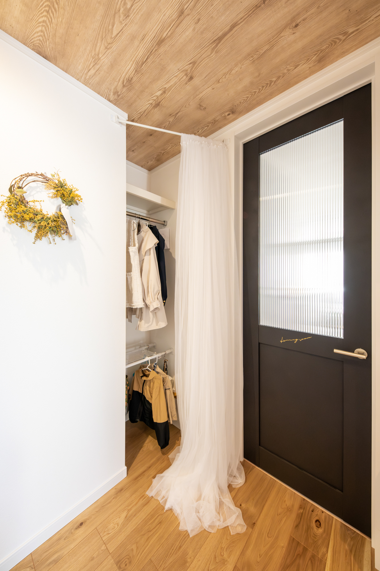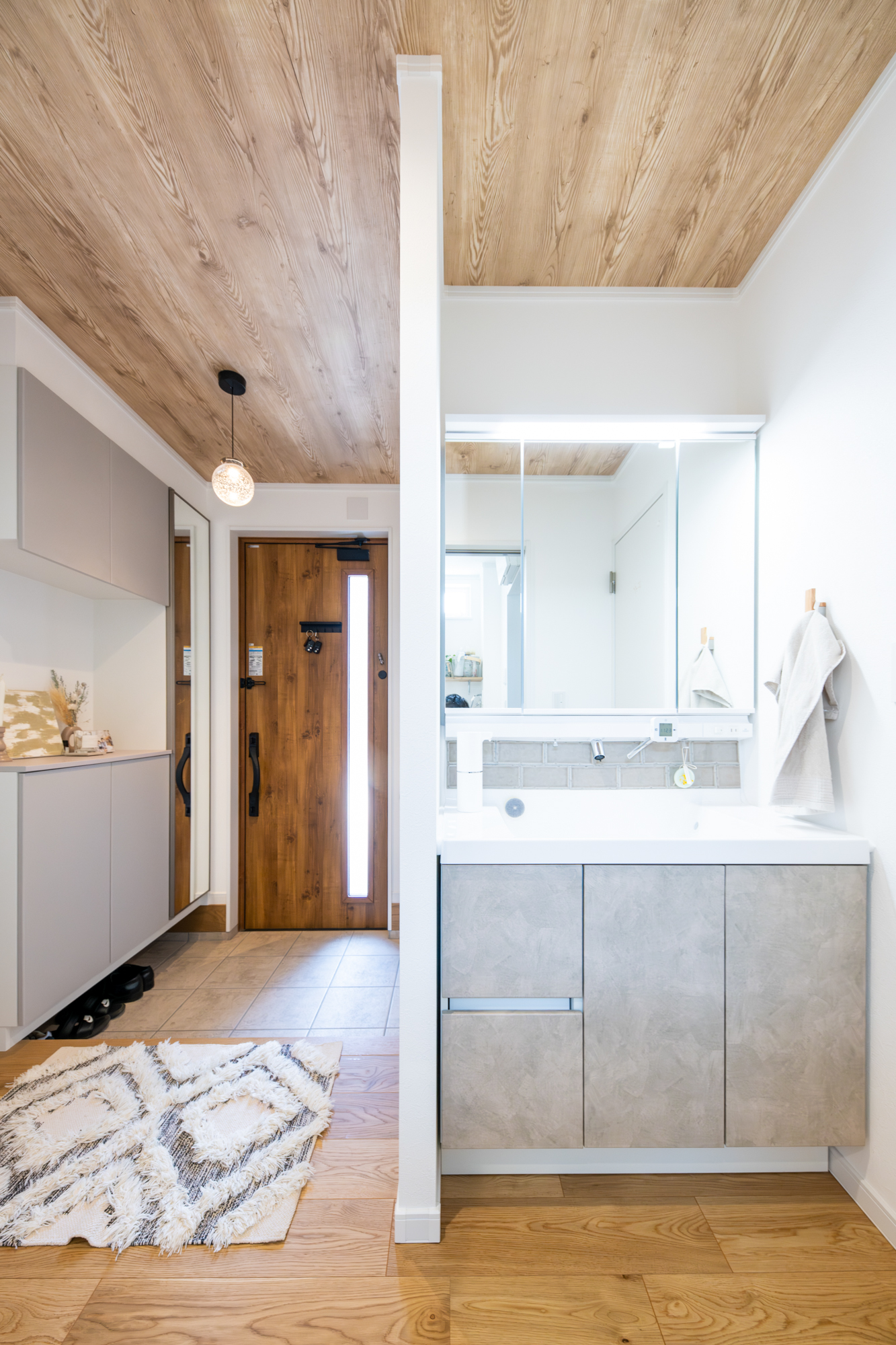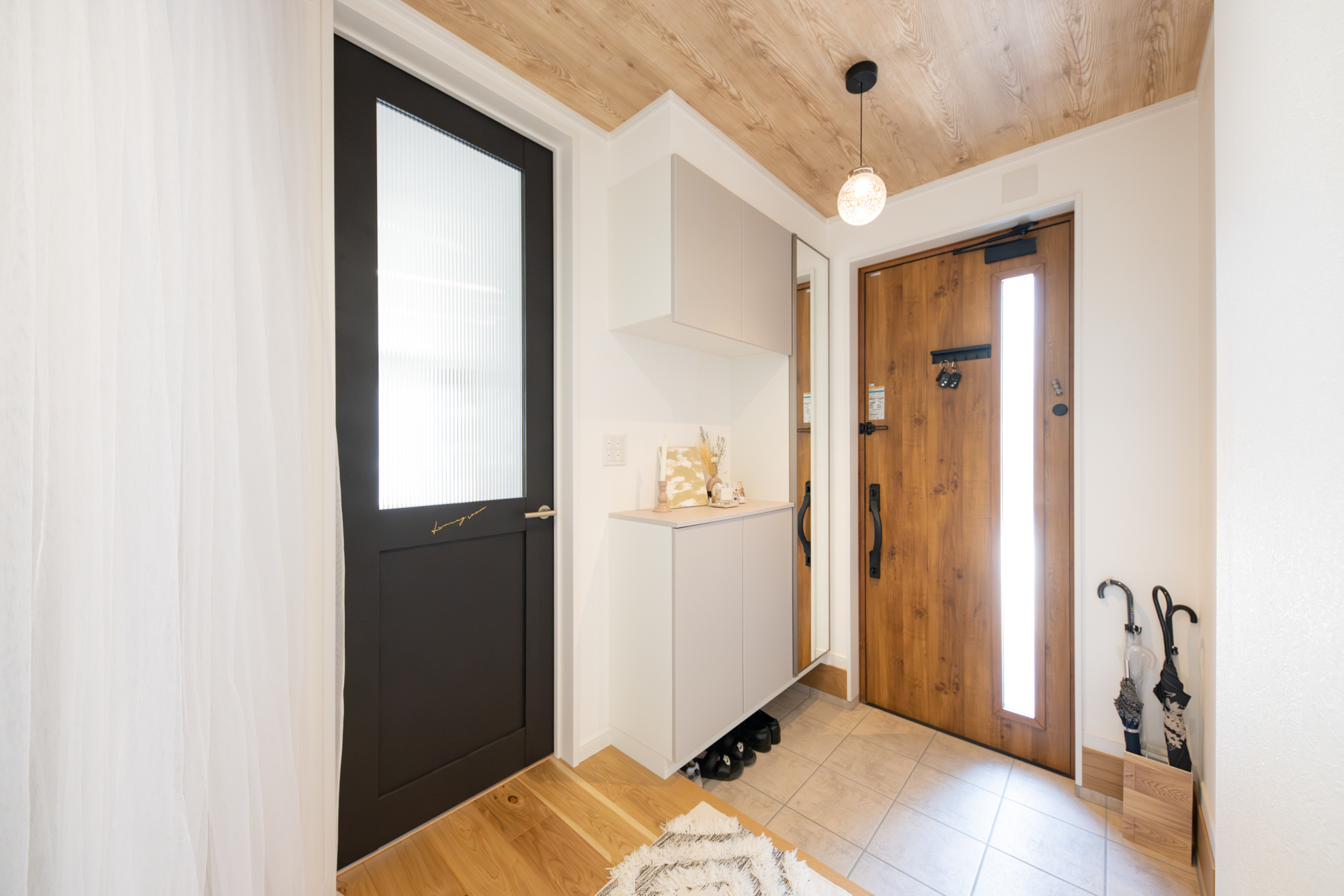 木目の天井クロスを設え、自然の温かみが感じられる空間になった玄関スペース。