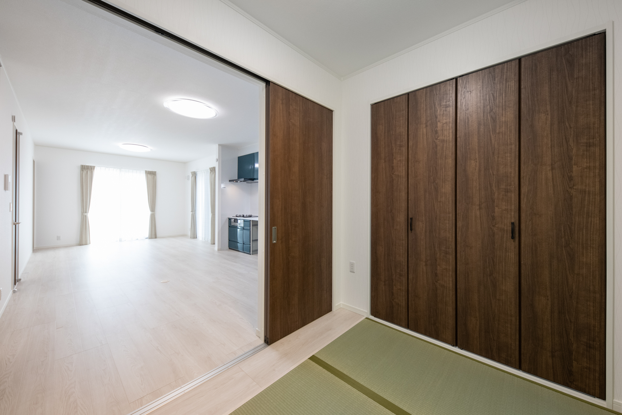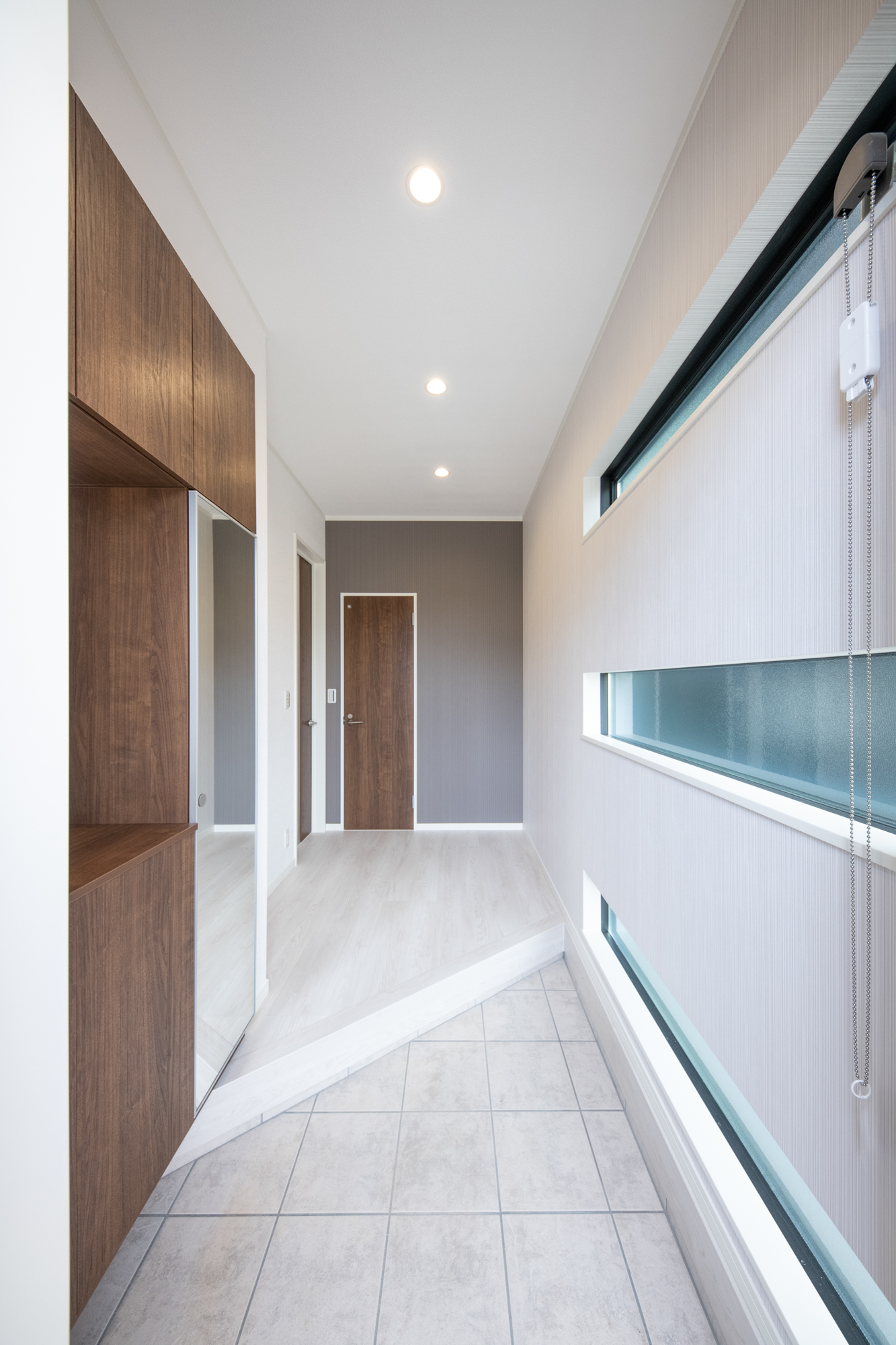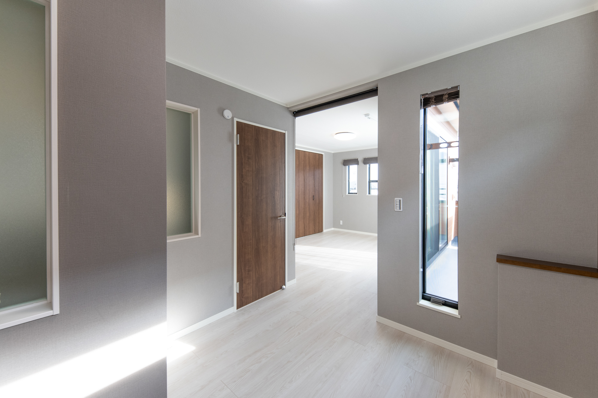 ハイスタッドで開放感のあるLDK。壁付けキッチンを採用し、スペースを最大限に活かせる空間に仕上がりました。 また、リビング階段・洋室はロールスクリーンで仕切れる様になっているので、つながりを大切にしつつプライベートな時間も過ごせる間取となっています。