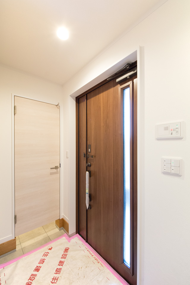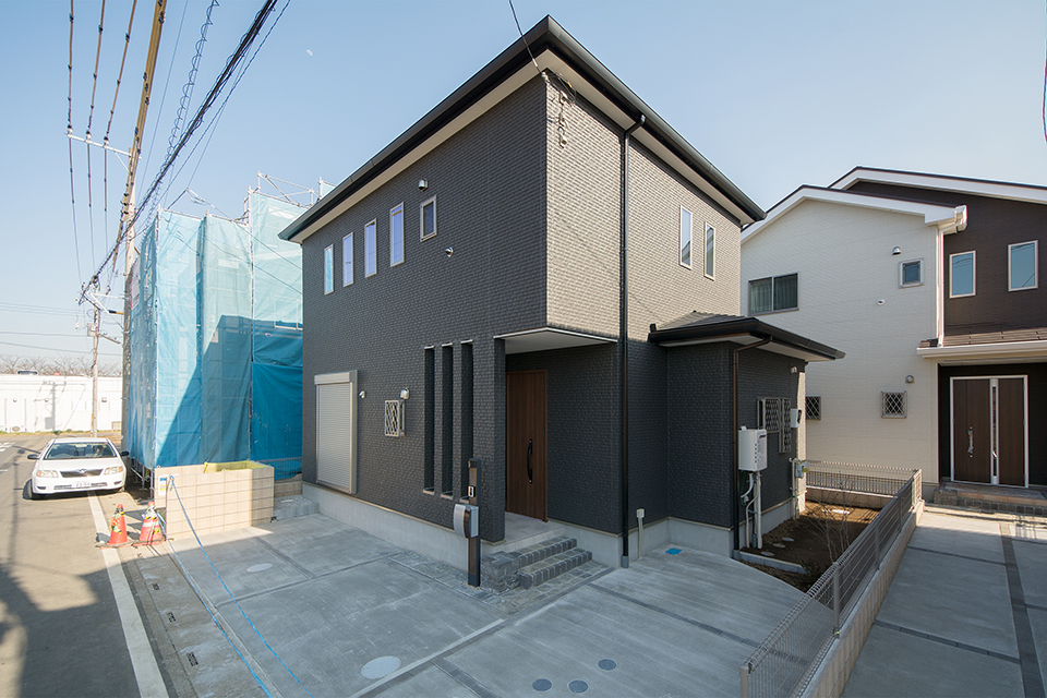整然と並ぶ窓や玄関ポーチのスリットがスタイリッシュさを演出。 黒一色の外壁と相俟って、モダンでシックな外観に仕上がりました。