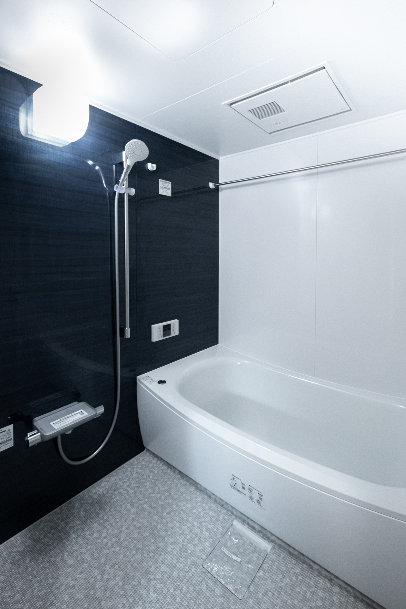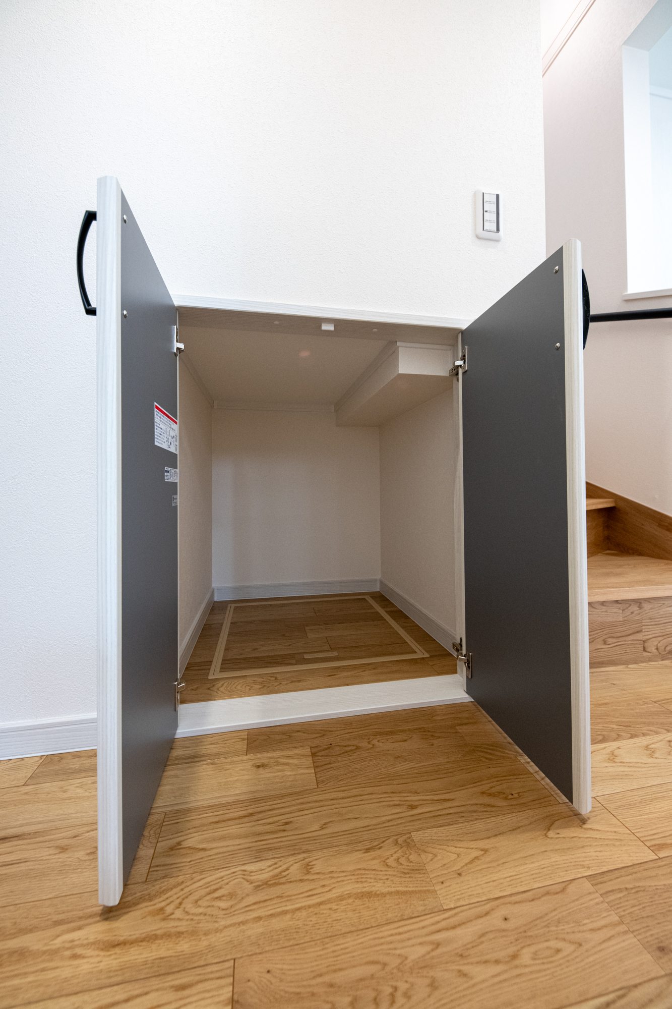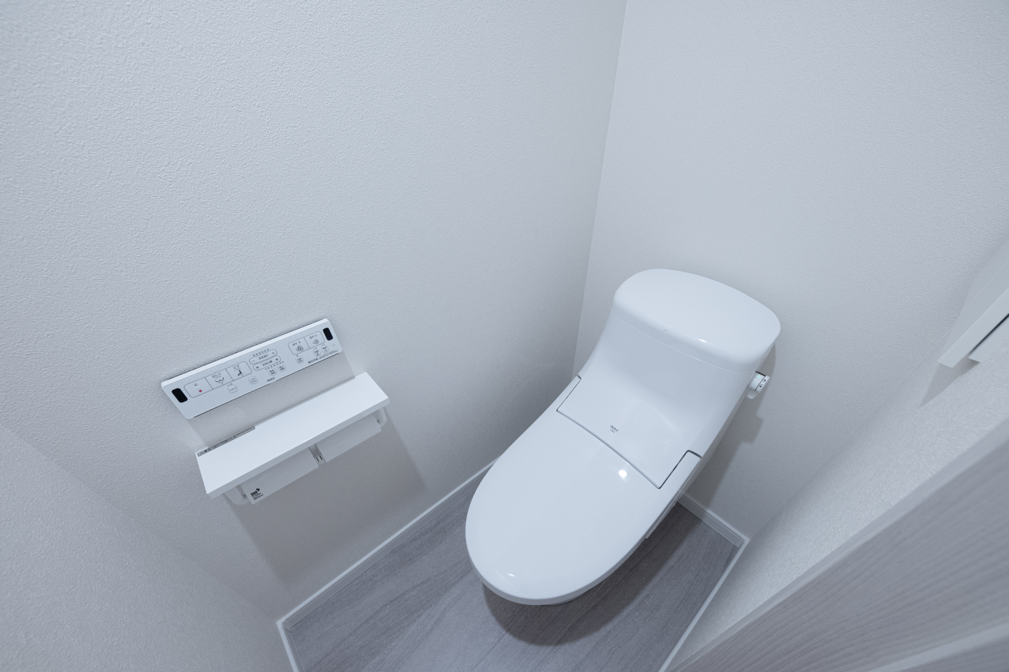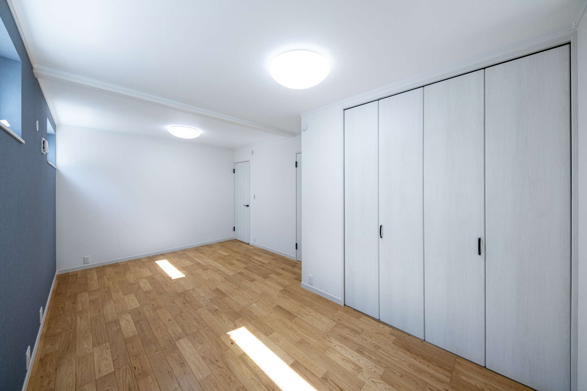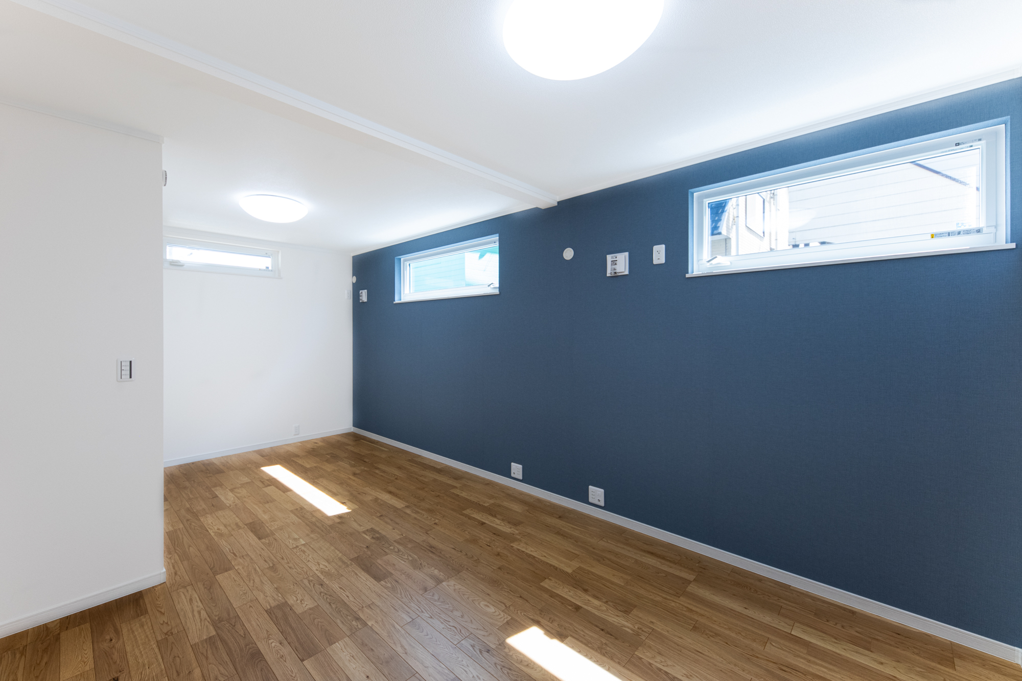 陽当りの良い2階リビングは勾配天井に梁をあしらいナチュラルで開放感のある空間に。ブルーグレーのクロスを所々アクセントに使い、モダンな雰囲気がプラスされたおしゃれなお家が完成しました。