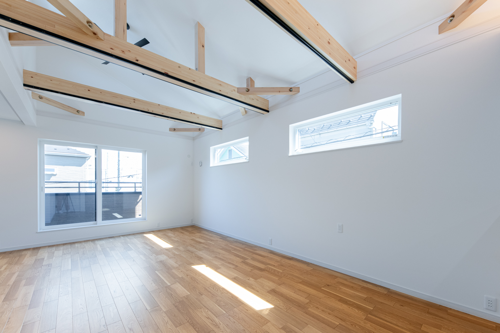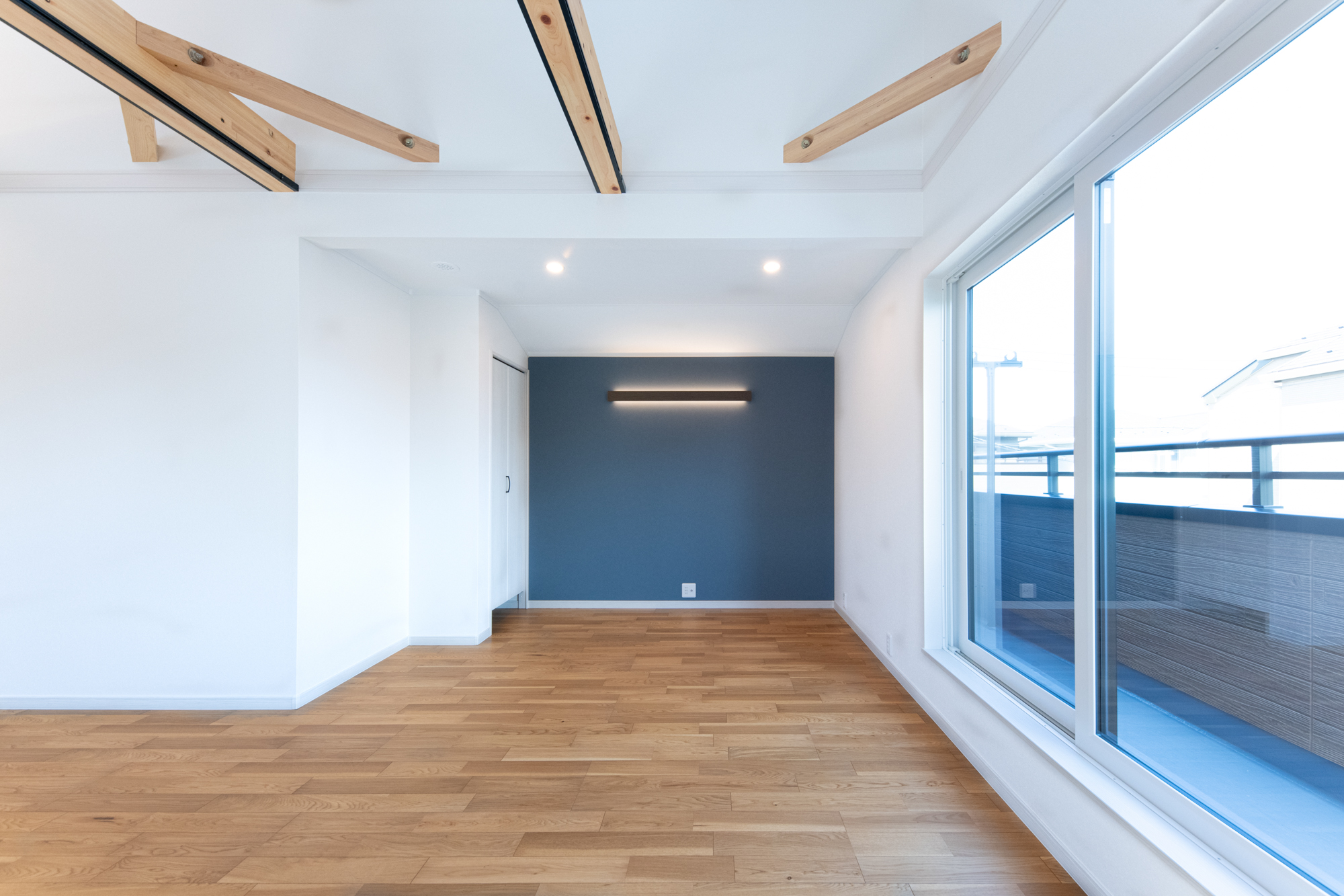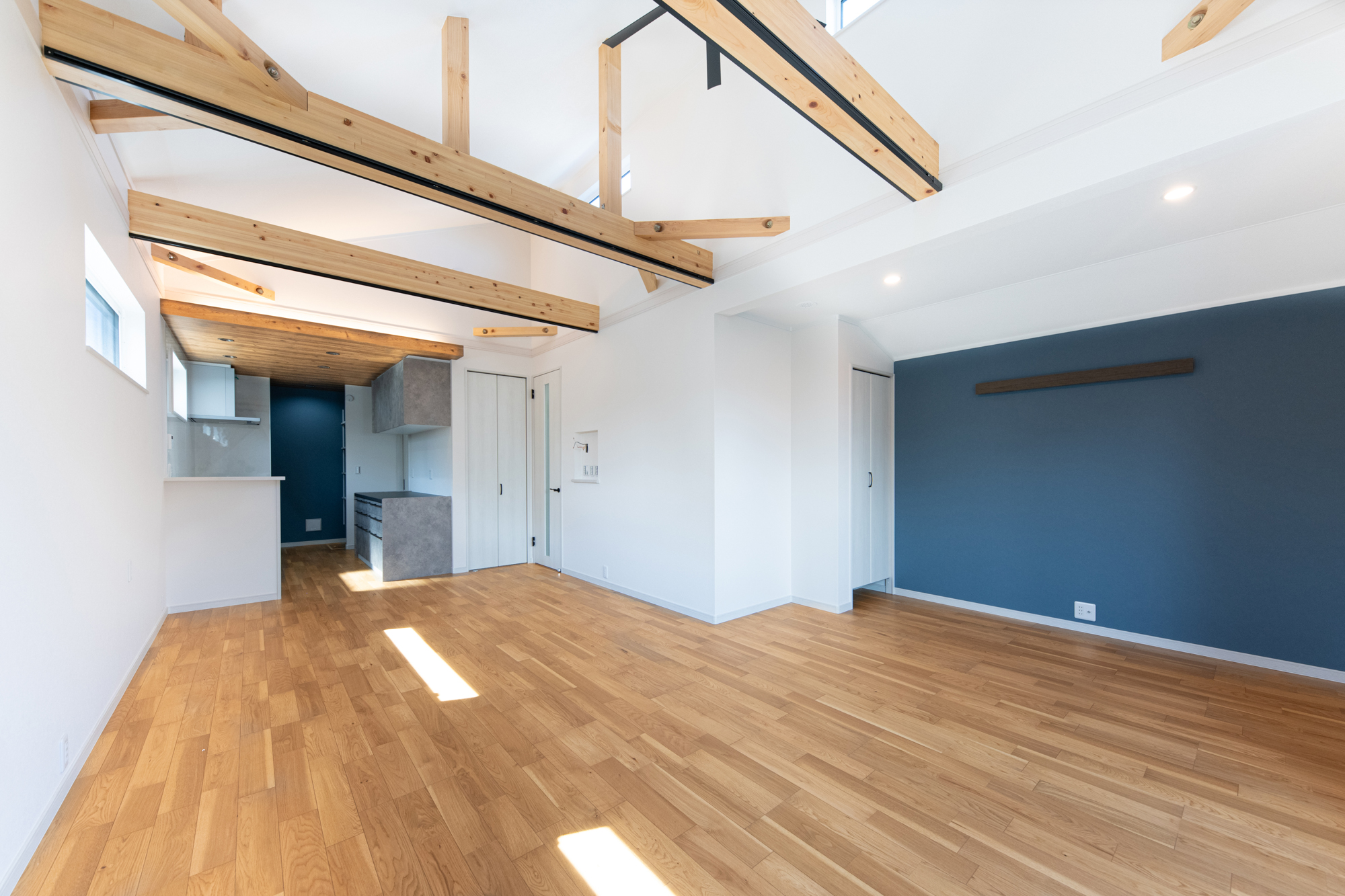 化粧梁と勾配天井。 アクセントカラーを統一させたナチュラルモダンなお家。