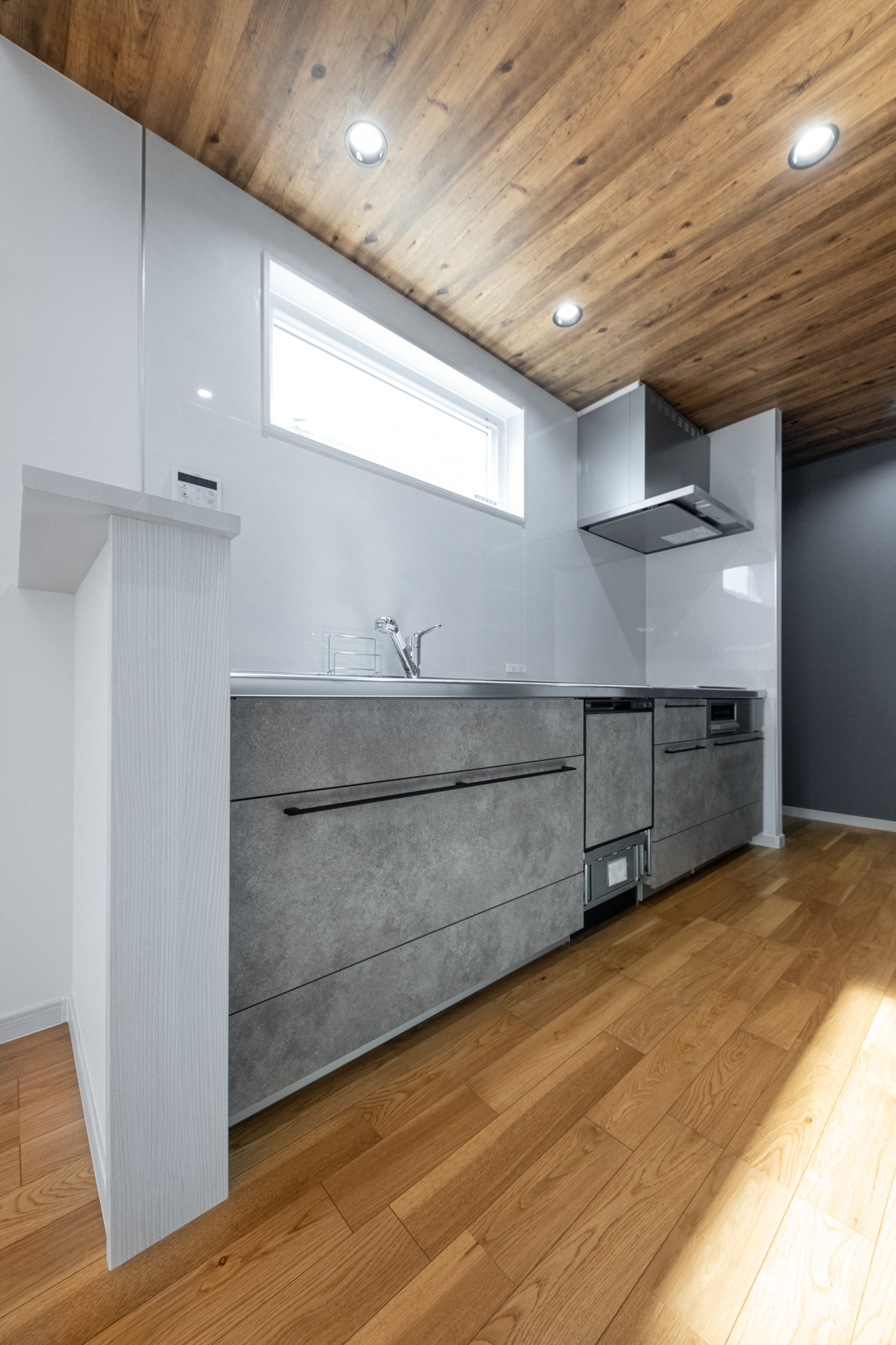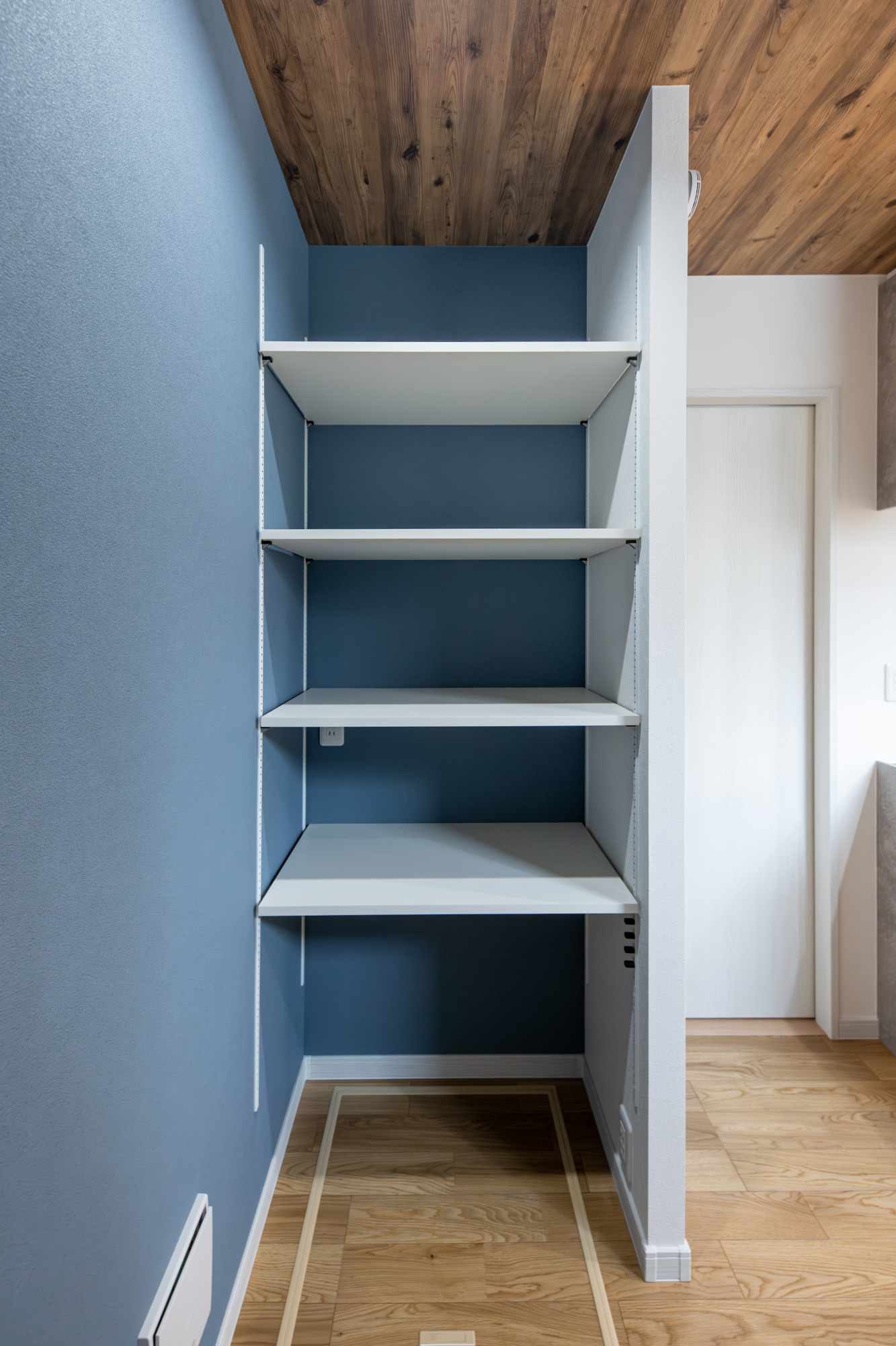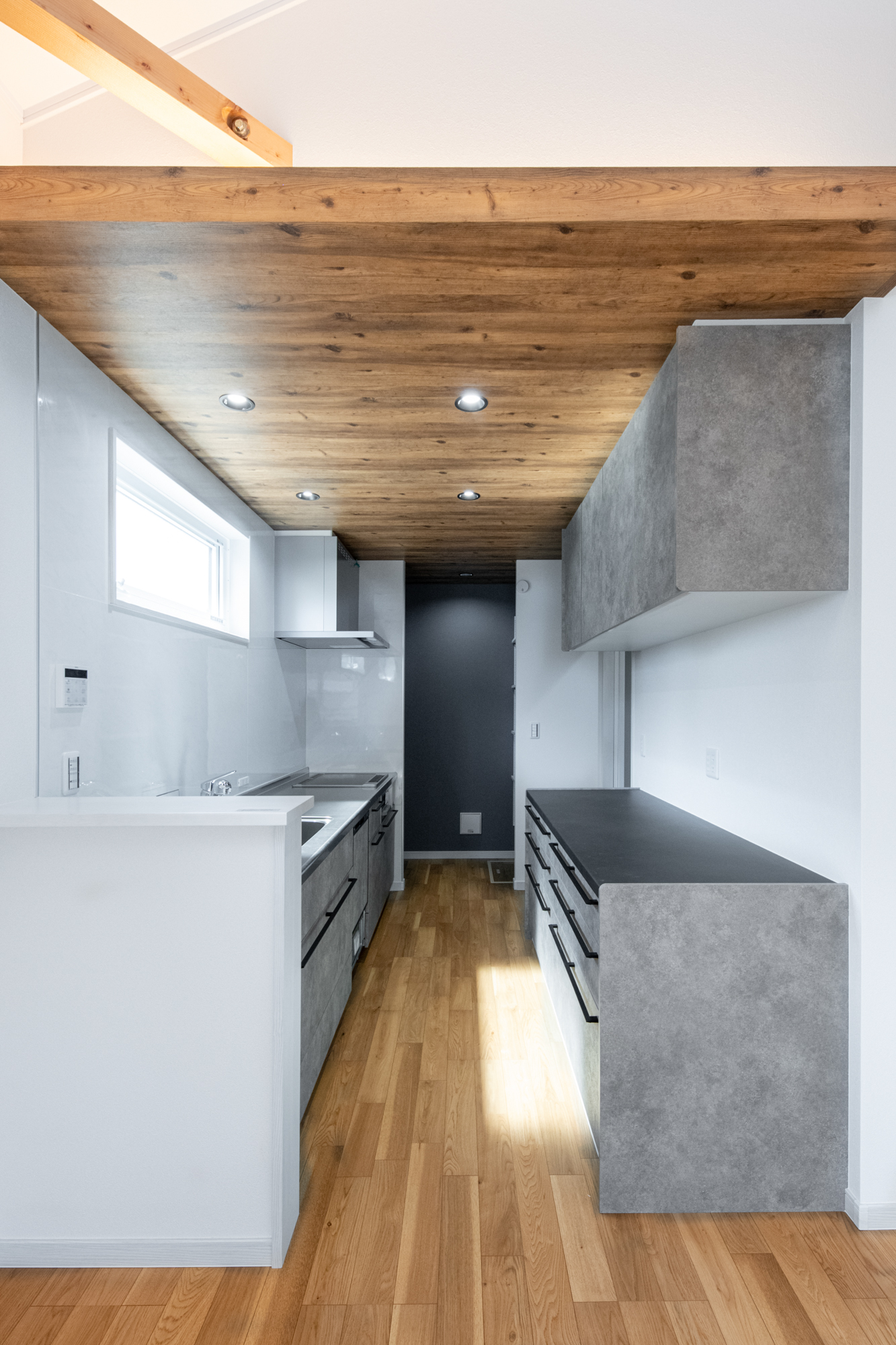 化粧梁と勾配天井。 アクセントカラーを統一させたナチュラルモダンなお家。