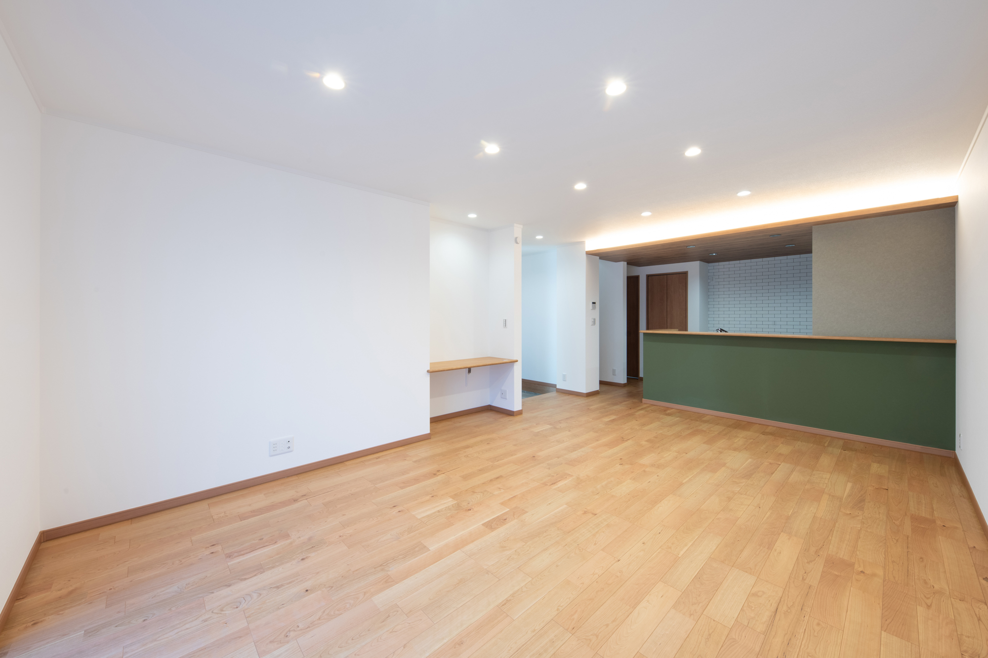 グリーンのアクセントクロスに深みのある木目の下がり天井。背面にはサブウェイタイル調のクロスをあしらったカフェスタイルのキッチンスペース。