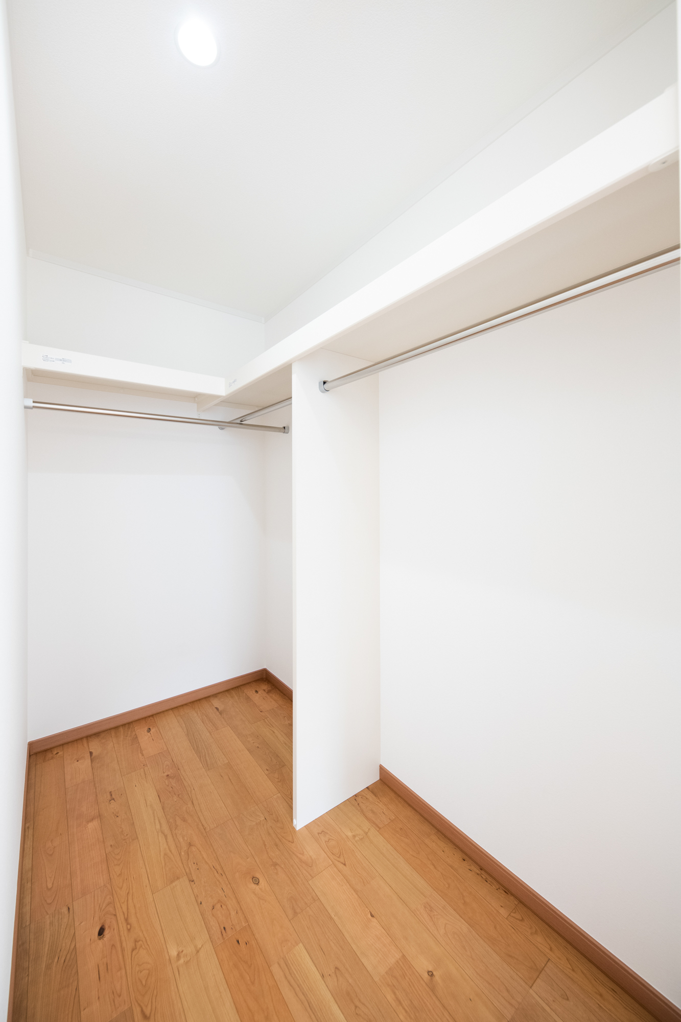 扉なしのウォークインクローゼットは通気性が良好。収納以外に書斎としての使い方もできたりと様々な活用が可能の便利なスペースです。