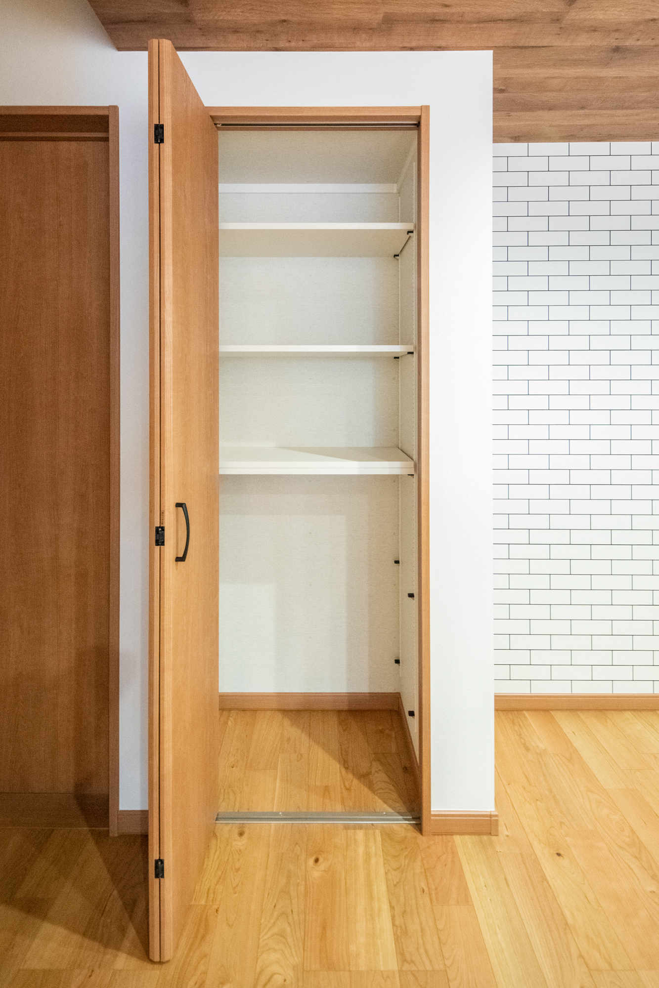 パントリースペース。買い物あとの片づけがスムーズにできます。収納したい物によって自由に高さを変えられるので便利です。