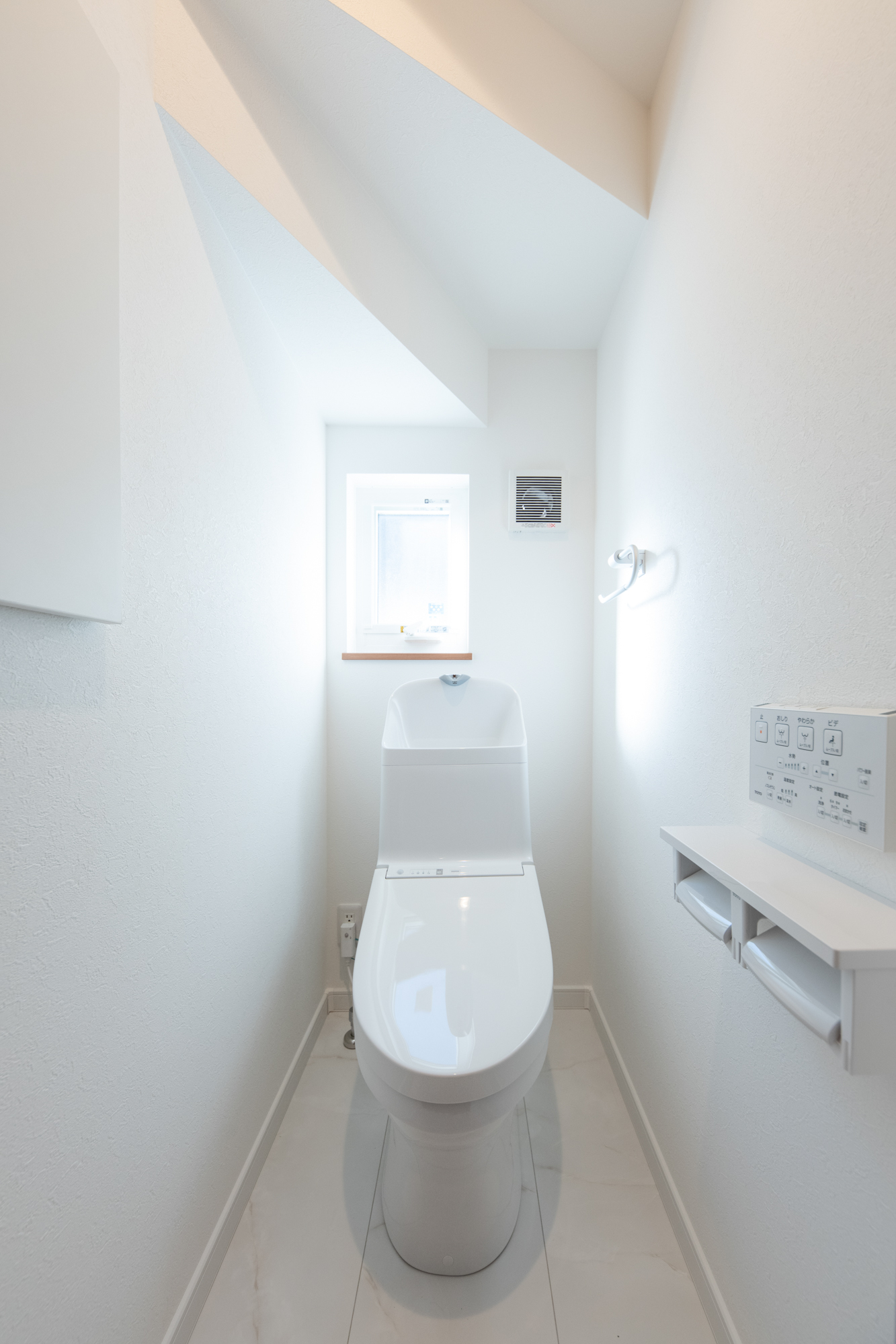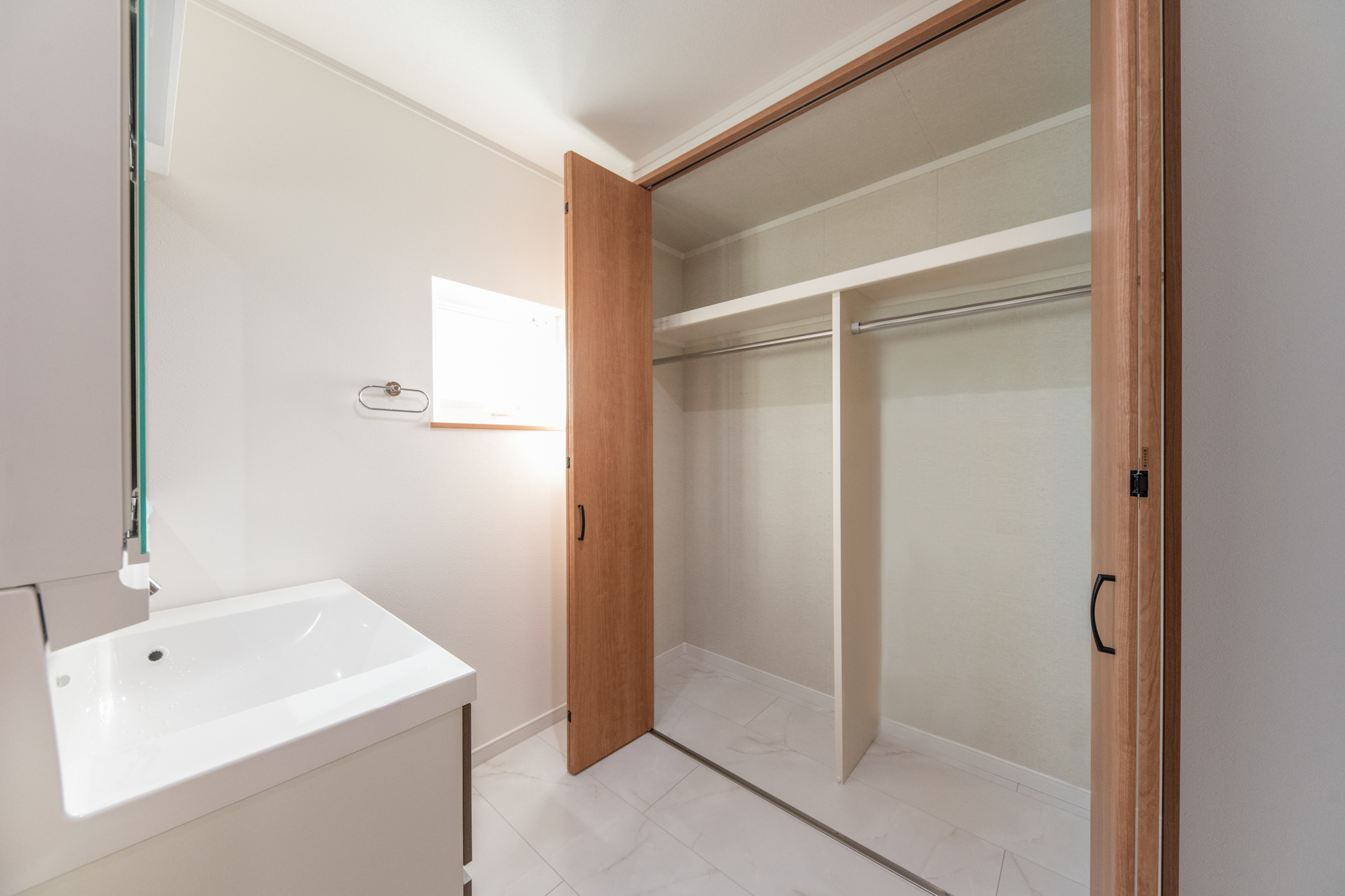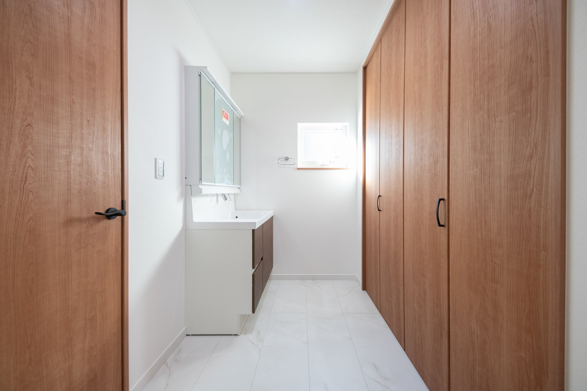 みんなが共有で使えるファミリークロゼット。サニタリールームは窓付きで明るい室内。脱衣所と別れているので、来客時にも手を洗ってもらうのに案内しやすいです。
