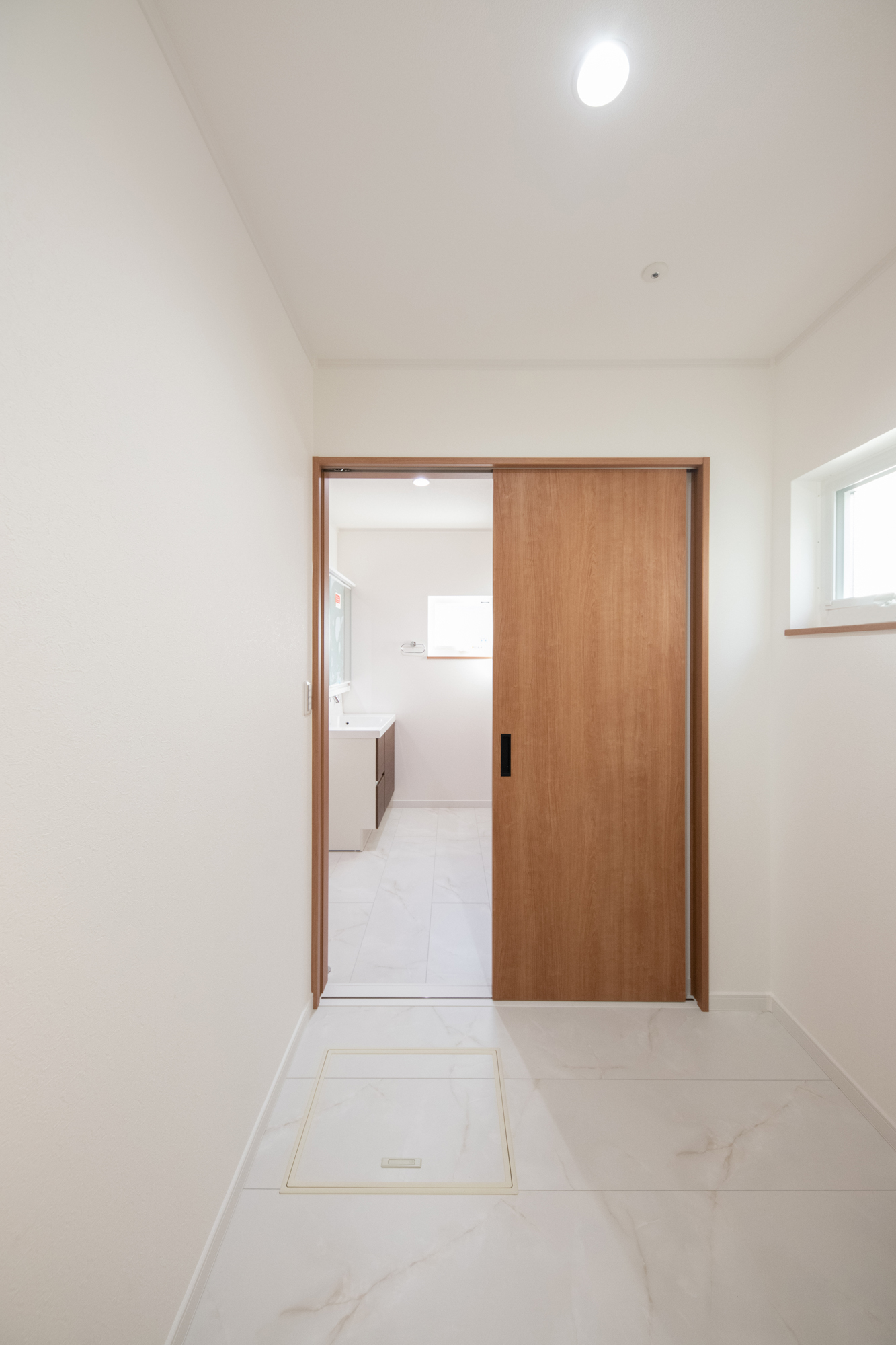 1階ランドリールーム・脱衣所。天井には室内物干し「ホスクリーン」を設置。乾いた洗濯物は隣の洗面室のクローゼットへ。洗濯作業はこの場所でほぼ完結することが可能です。