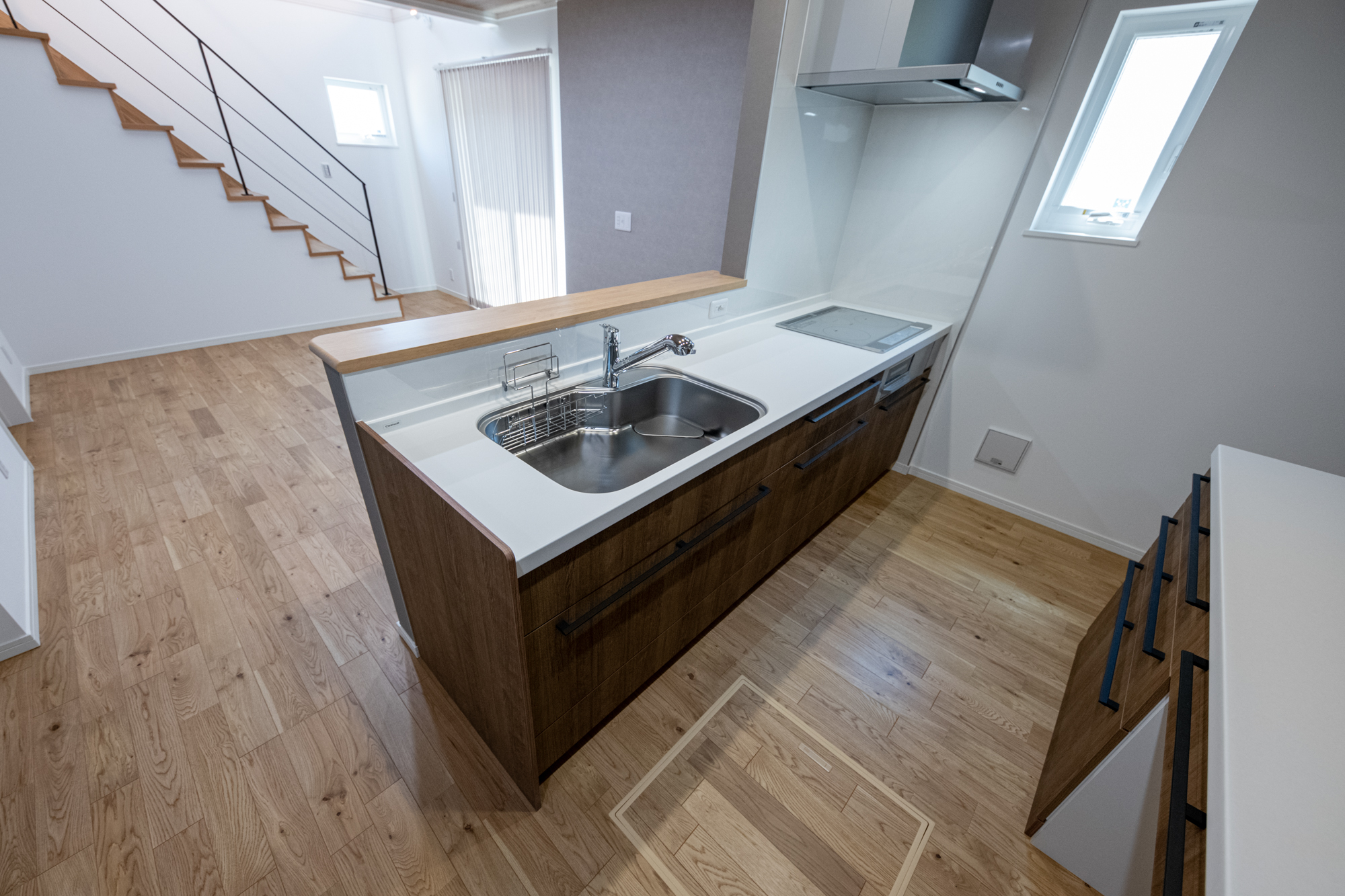 リビングを見渡せる対面式キッチン。家事をしながらご家族との会話も弾みます。