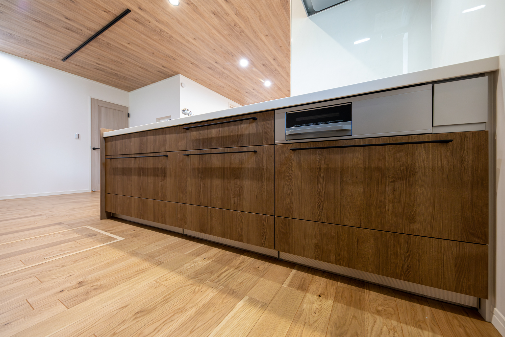 マットな質感が洗練された、インテリア性の高い木目柄の扉がおしゃれなキッチン。IHクッキングヒーターを採用し、すっきりとした印象です