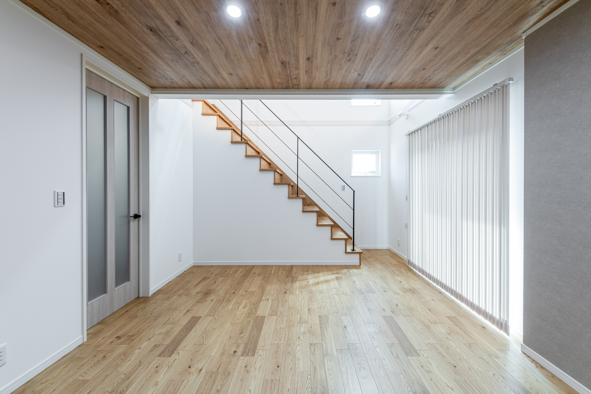 リビング階段×吹き抜けを組み合わせ、開放感のあるリビング。