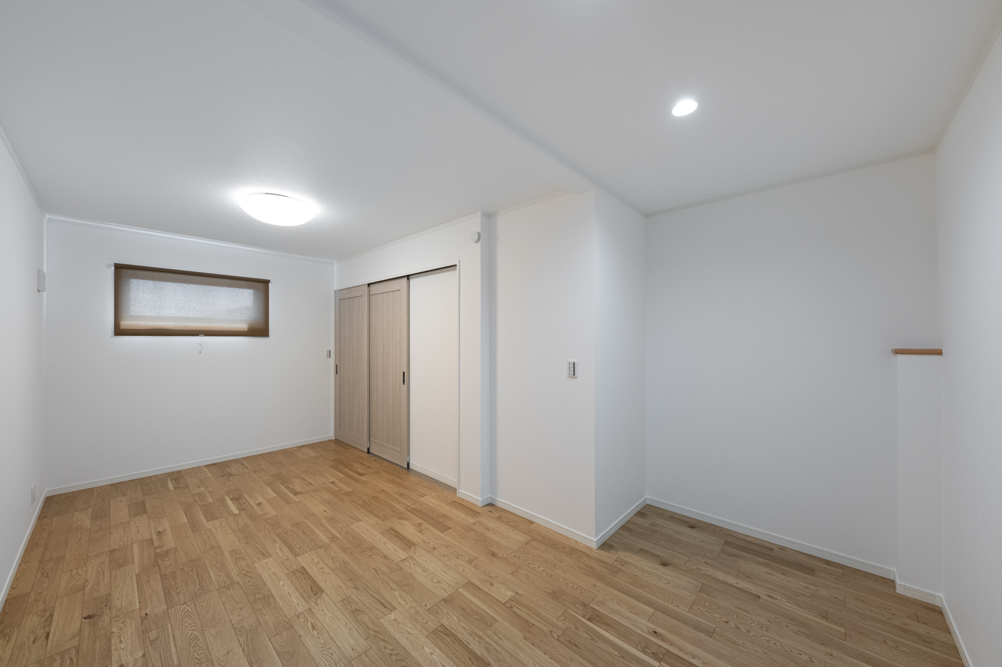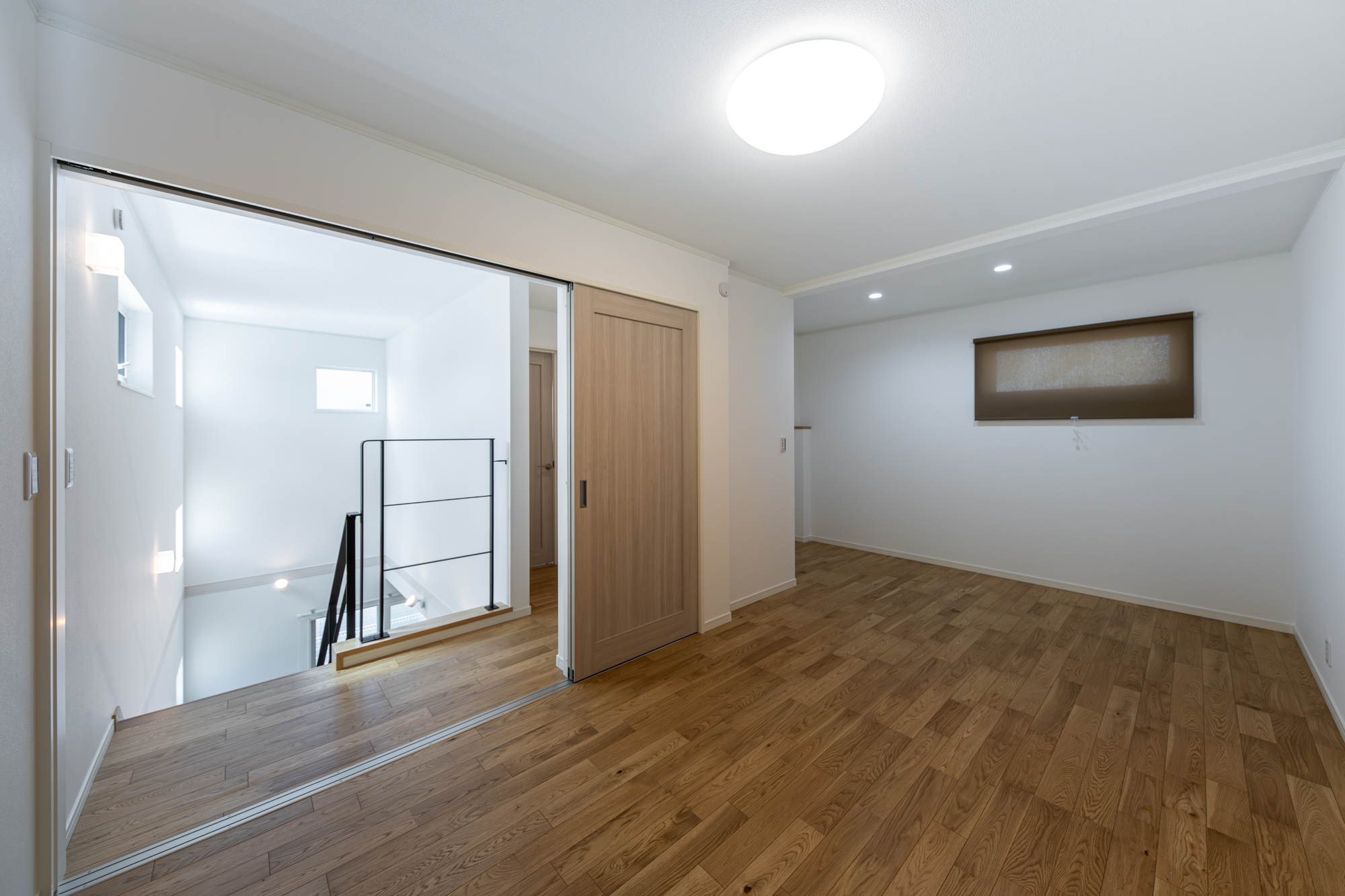 2階、9.5帖の洋室。2枚引き込み戸になっていて、吹抜けから光と風と取り込む開放的な空間です。