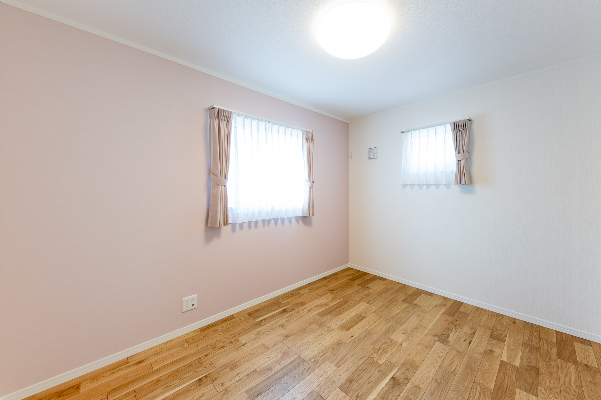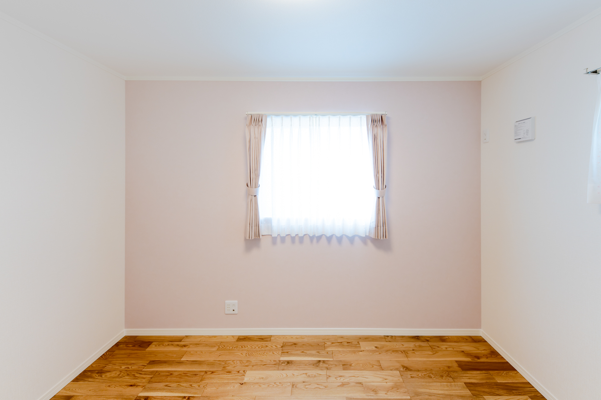 5.62帖洋室。ピンクのアクセントクロスが可愛らしい室内。