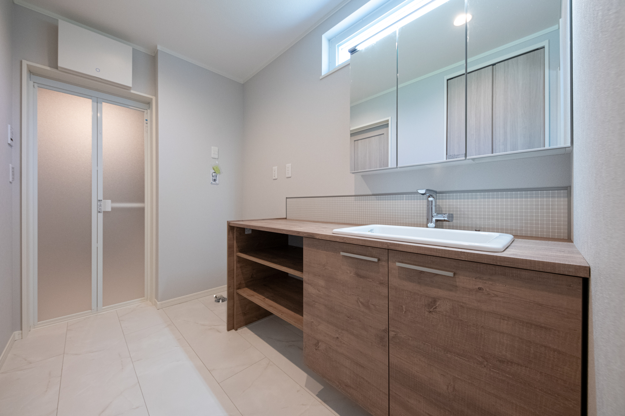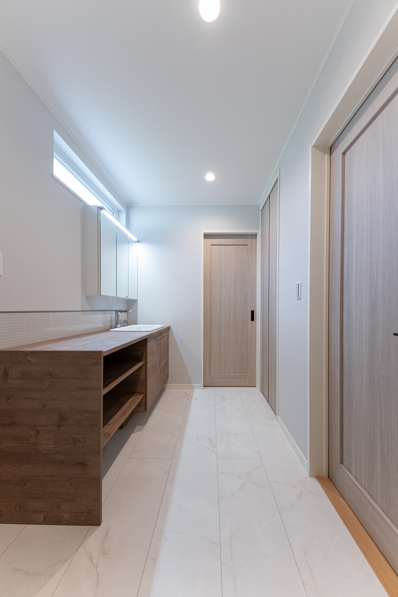 ワイドな洗面化粧台を設えたサニタリールーム。収納も豊富ですっきり片付きます。