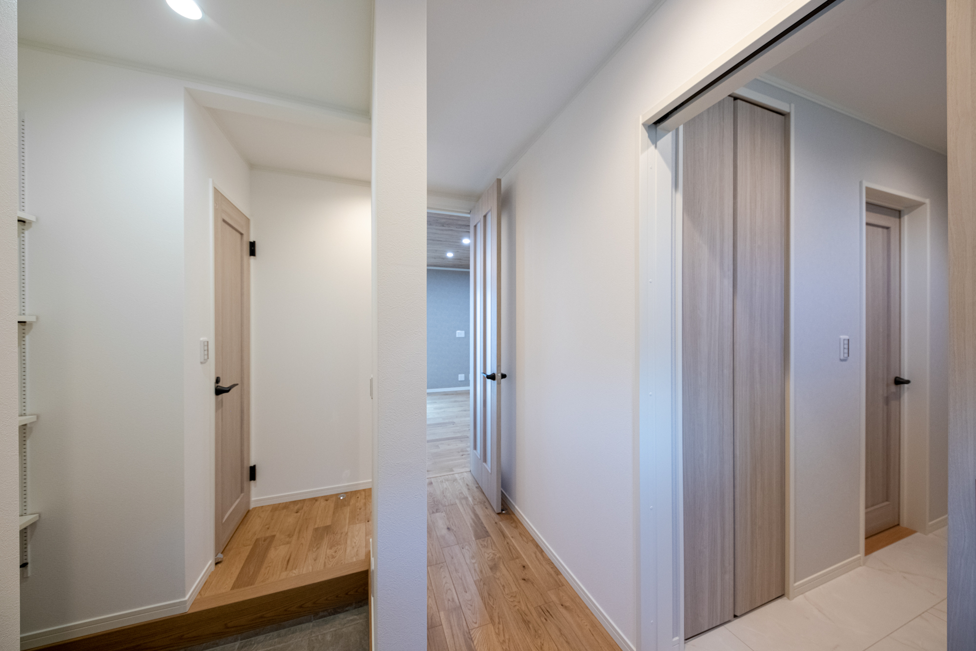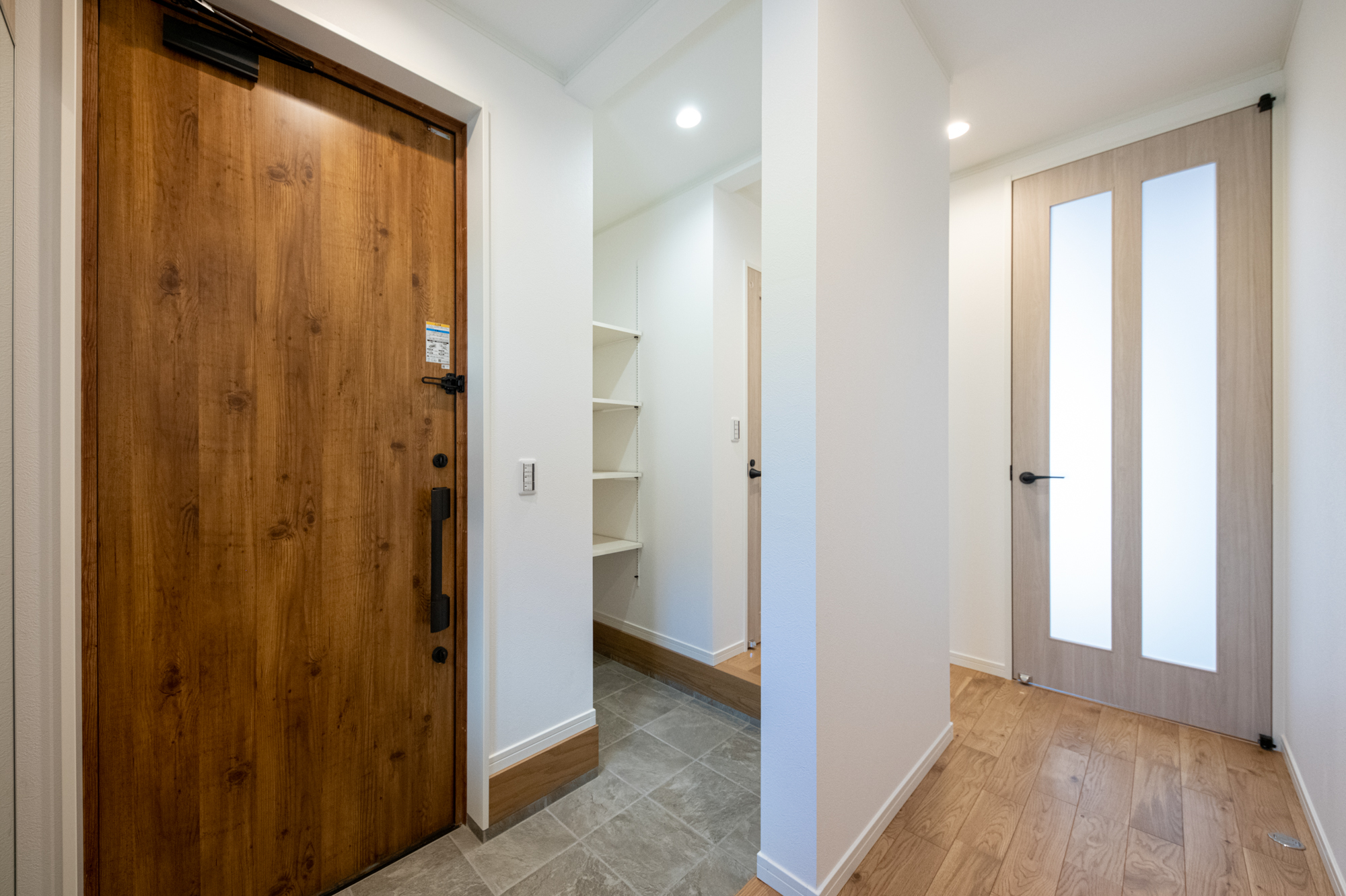 収納豊富な玄関。ロールスクリーンなどで仕切ればファミリーエントランスとして分けて使うこともできます。
