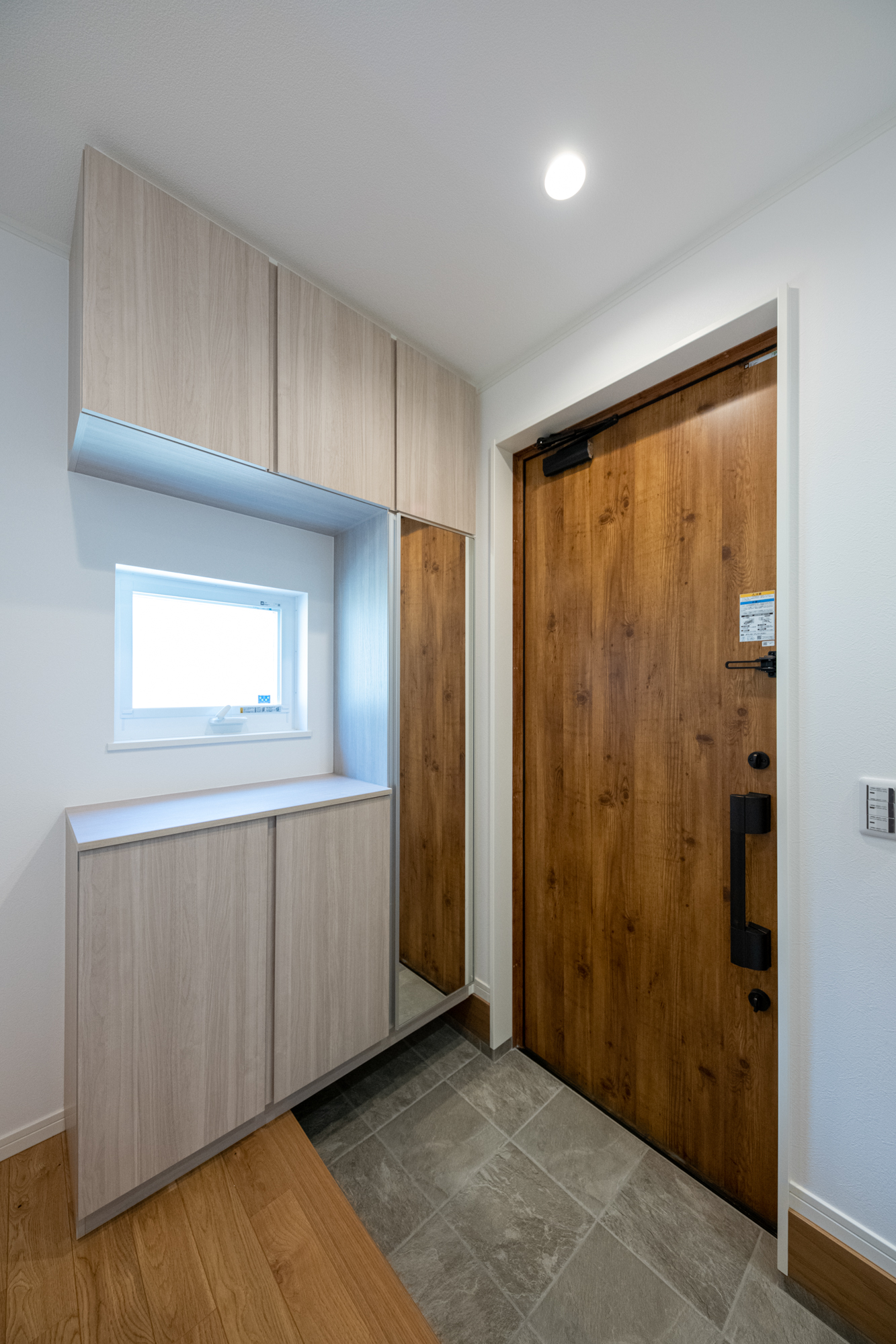靴を履いたまま全身チェックできるミラー付き収納を設えた玄関。