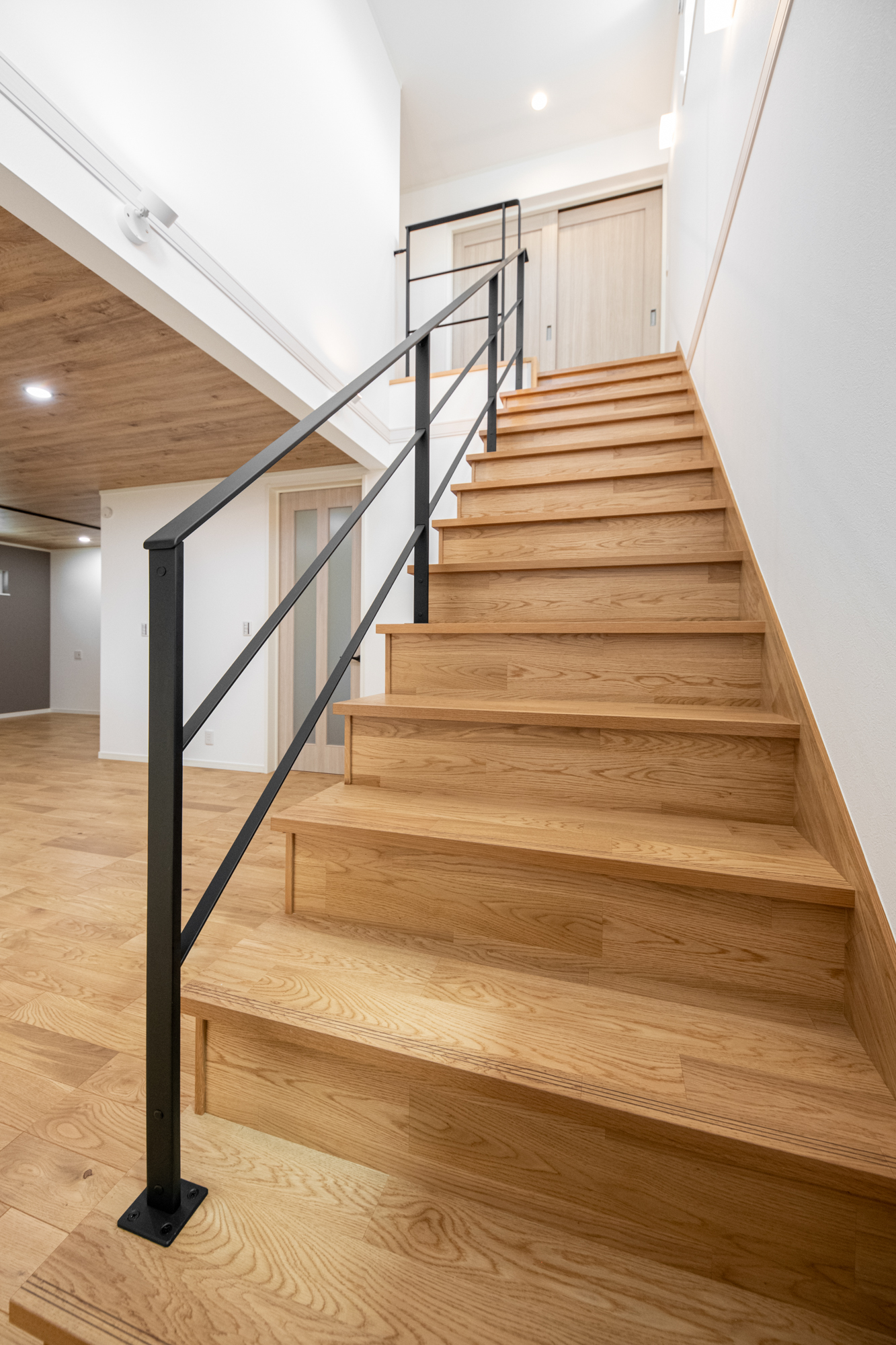 1階と2階を軽やかに繋ぐ階段。光に溢れた爽やかな印象の空間に。