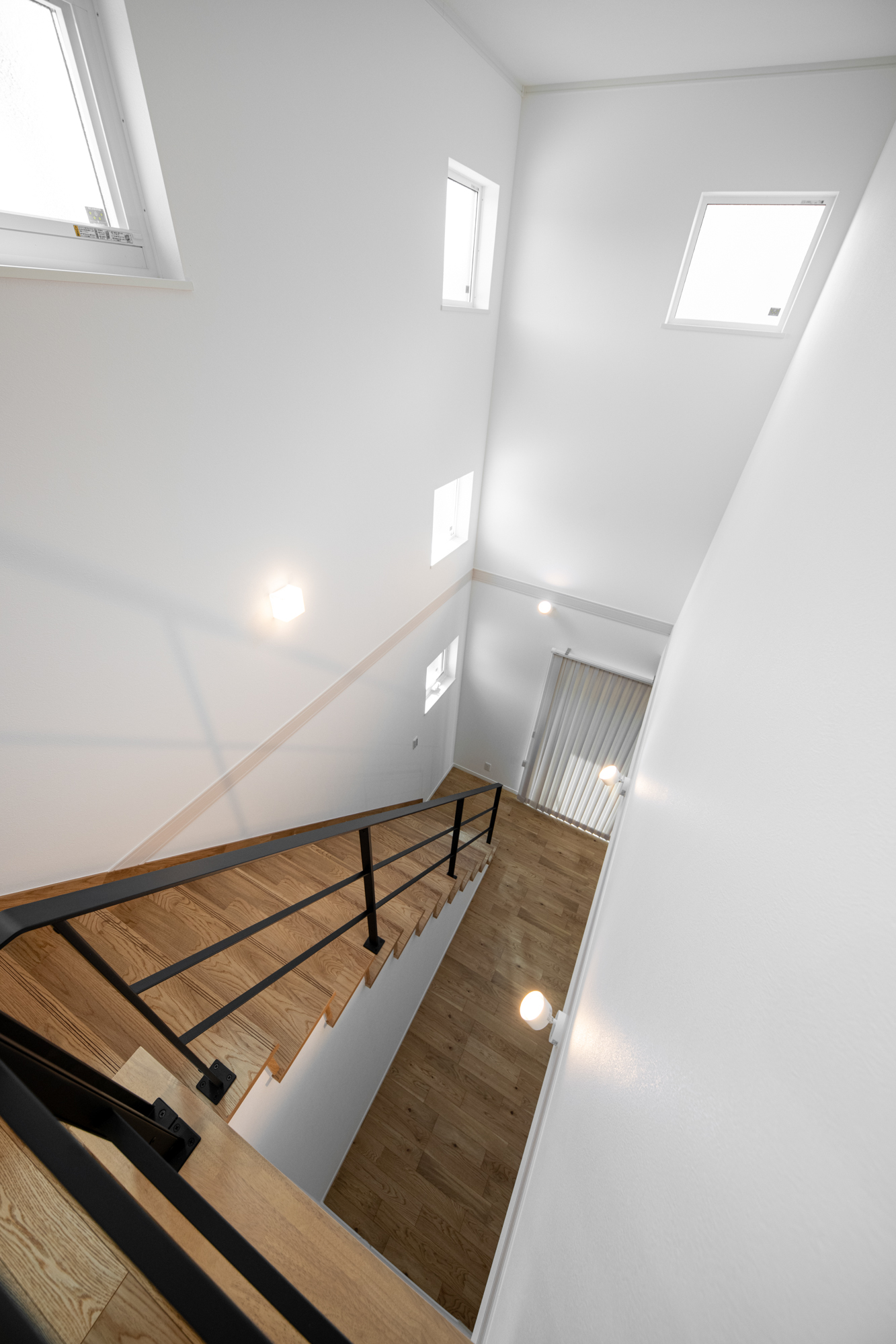 1階は行き止まりの無い回遊動線や豊富な収納を設え家事効率の良い間取となっています。1階、2階共に吹抜けからの心地よい光や風が感じられる安らぎのお家が完成しました。