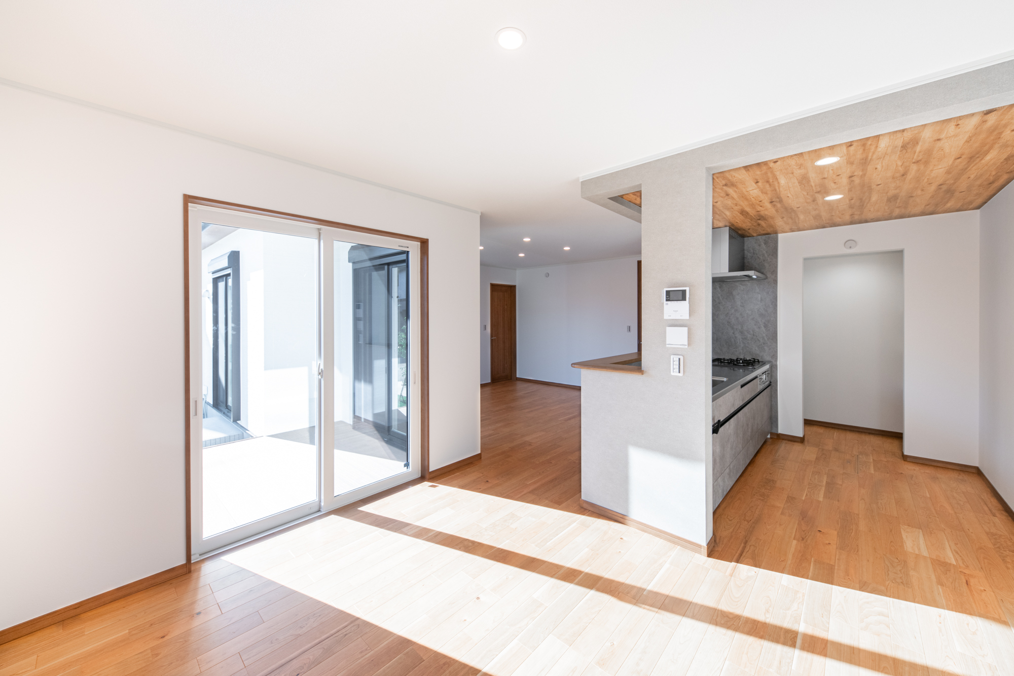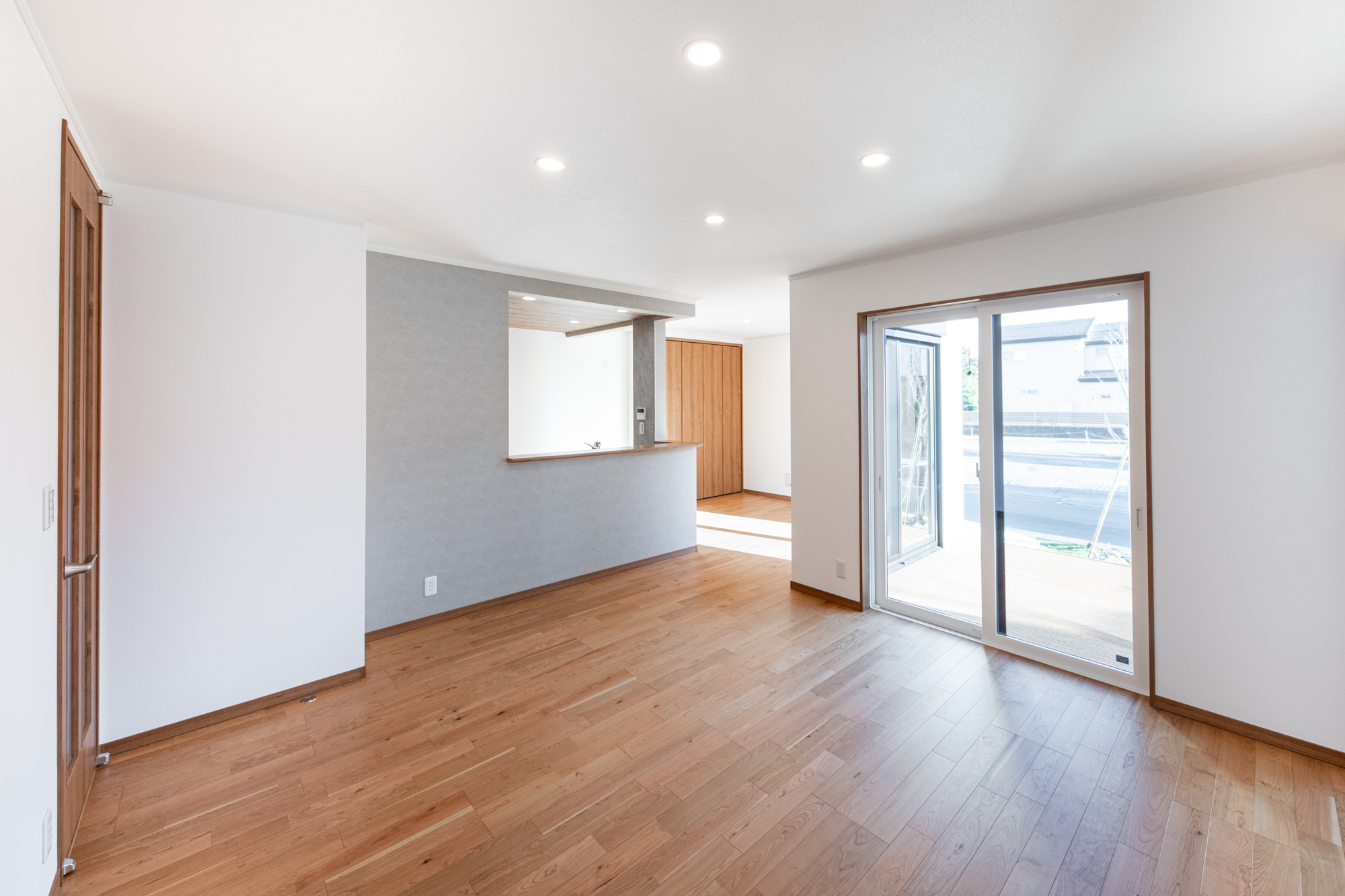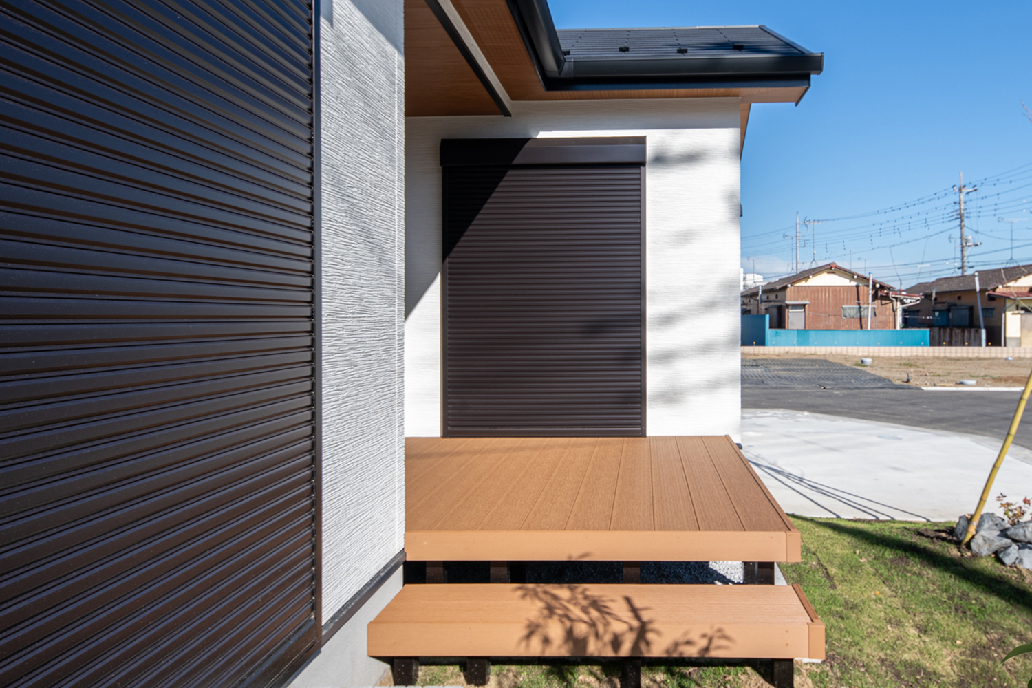 広い土地を活かしたゆとりのある平屋。開放感のあるLDKには「第二のリビング」ウッドデッキがあり、外・室内両方で寛げる癒しの空間となっています。また、シューズインクロークからパントリーへ繋がり、ウォークインクローゼットから洗面室に行き来できる便利な動線のある間取りで、長く快適に住み続けられるお家が完成しました。