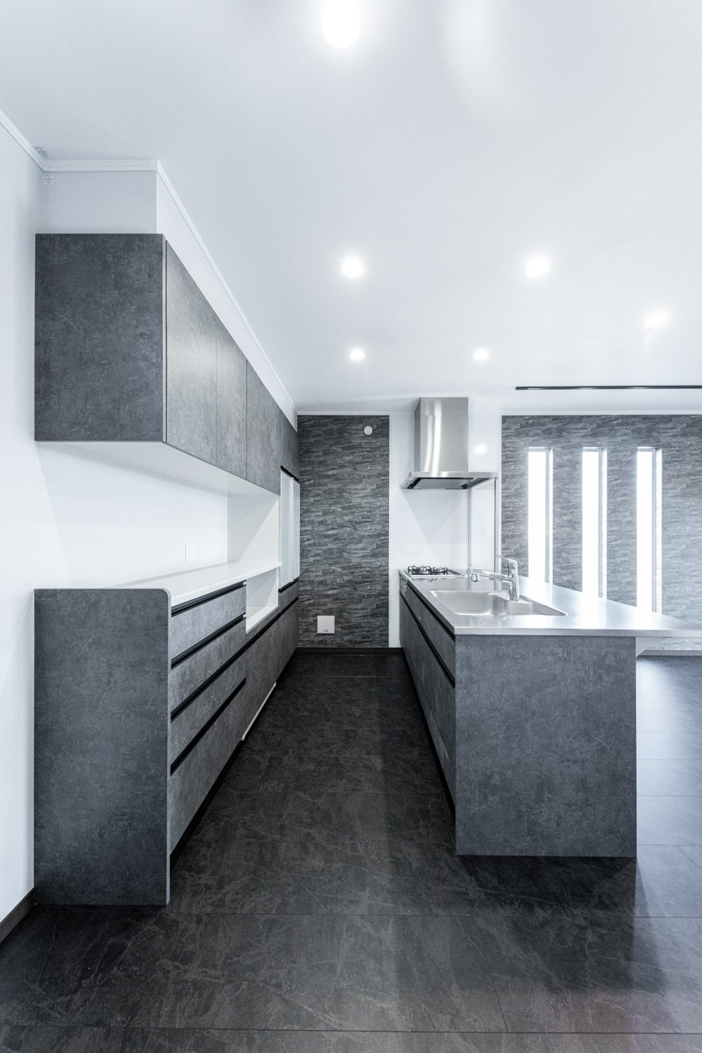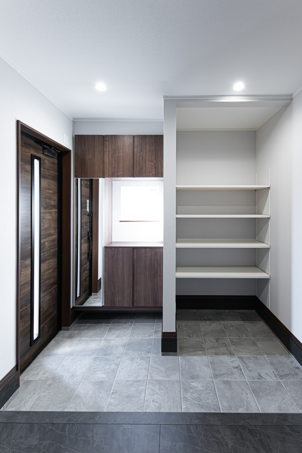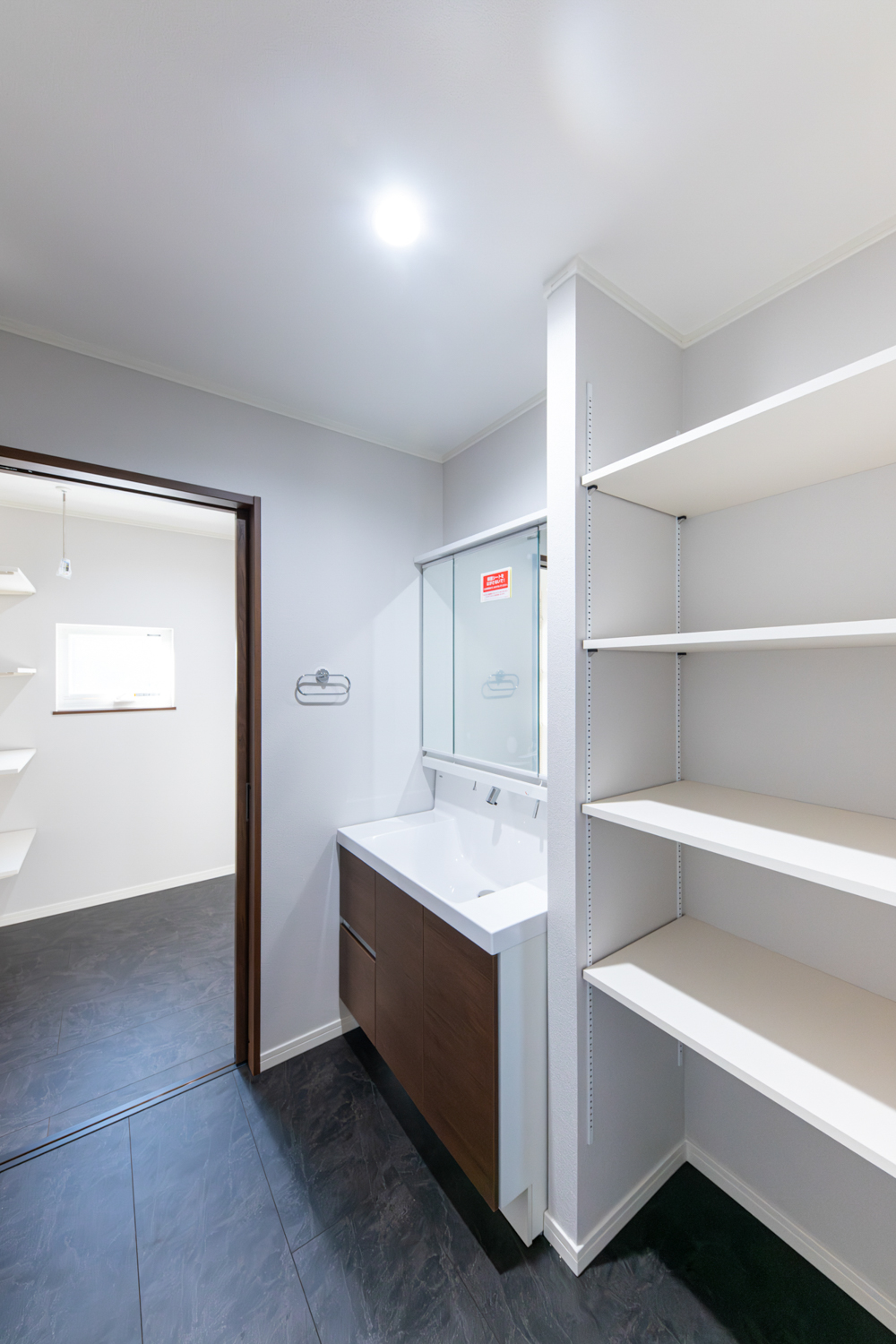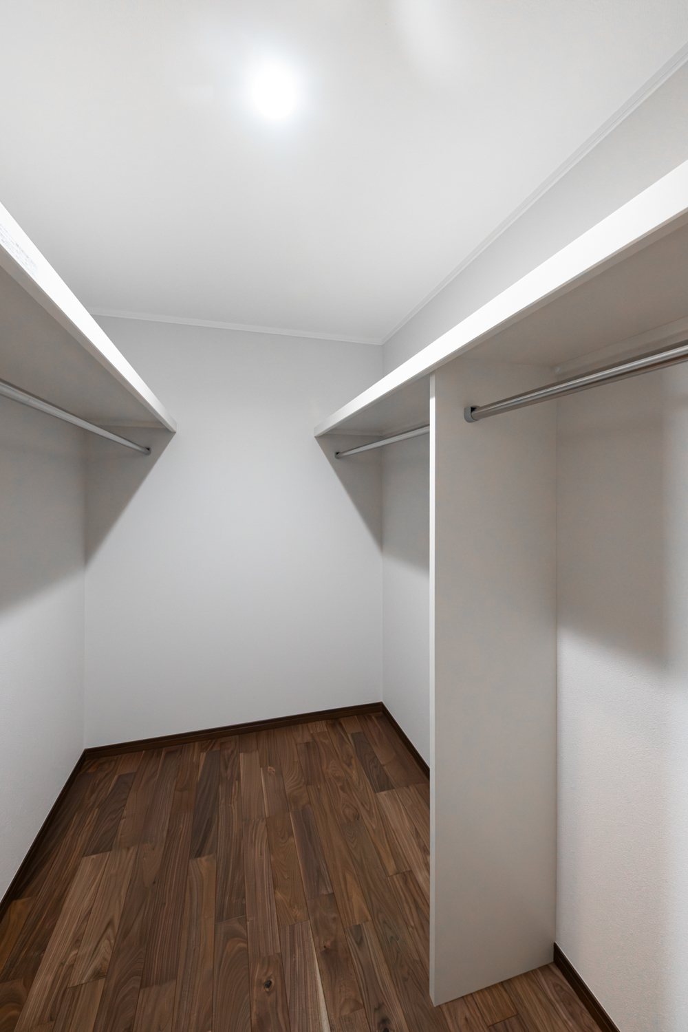 天井が高く、窓から沢山の光を取り込む開放的なリビング。1階はパントリーや洗面室への行き来がしやすい回遊動線を取り入れ家事のちょっとしたストレスを減らし効率の良い間取りに。2階には家族が共有で使えるファミリークローゼット設え、1つの場所で衣類が管理できるよう工夫し、「住みやすさと使いやすさ」が考えられたお家が完成しました。