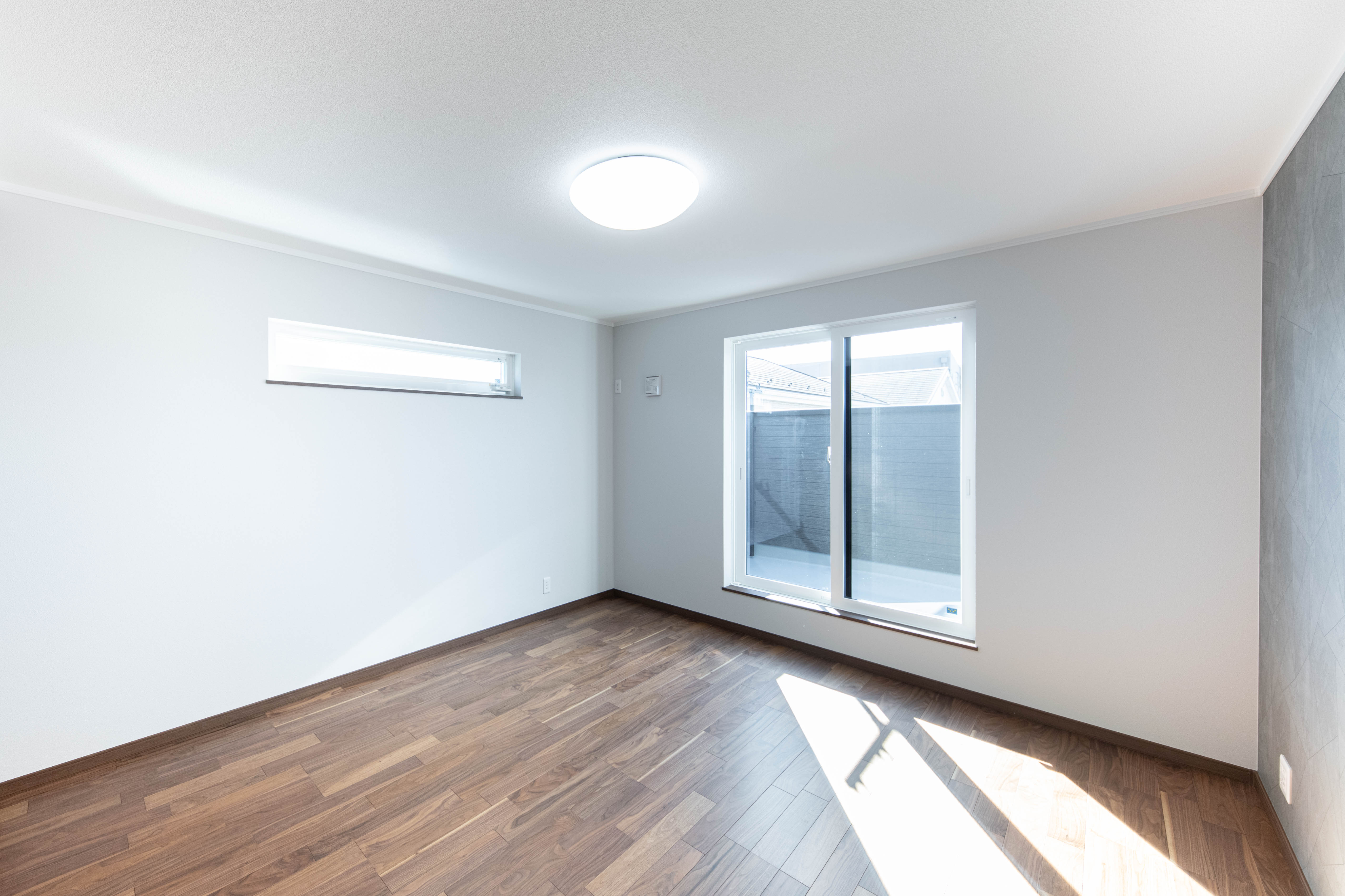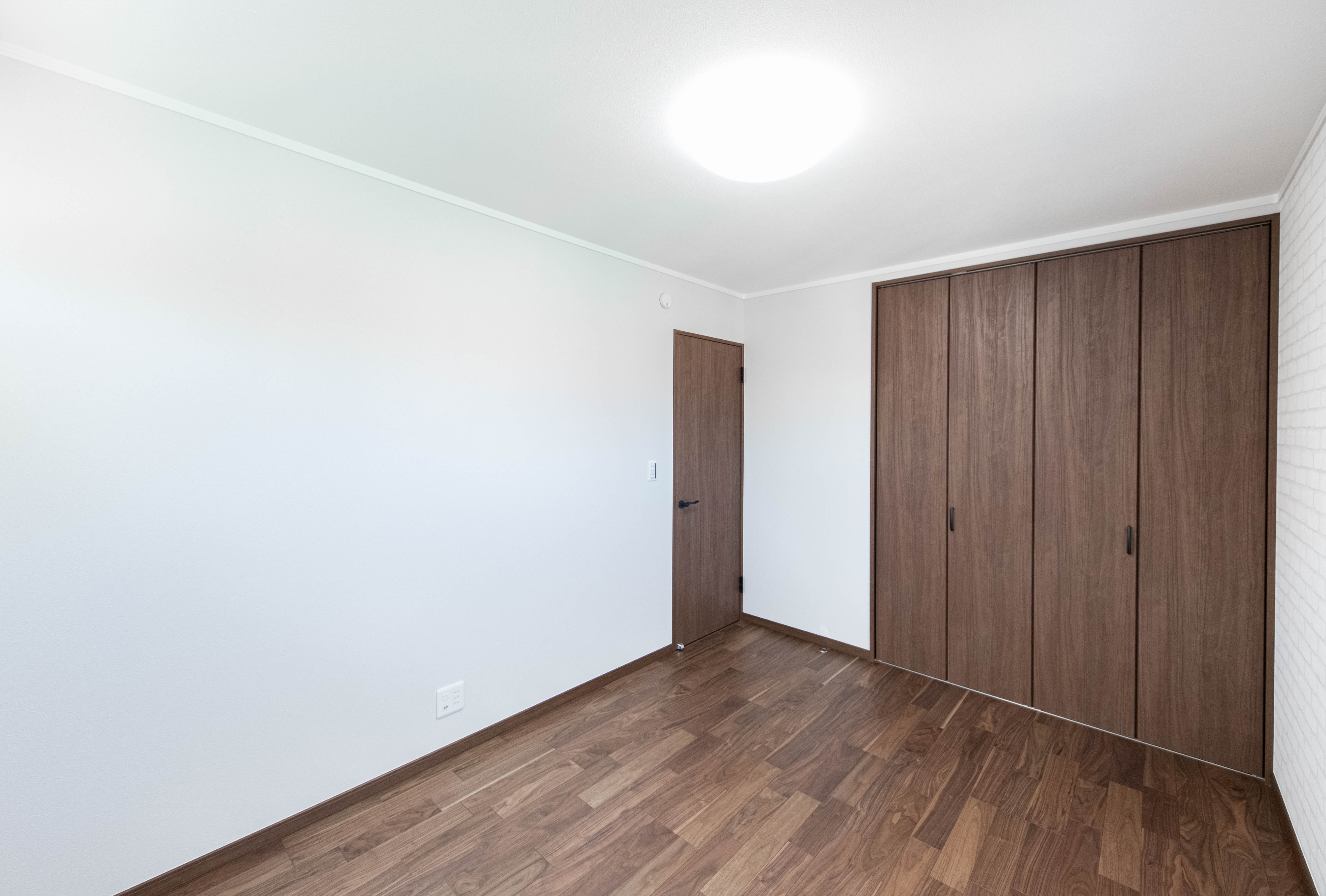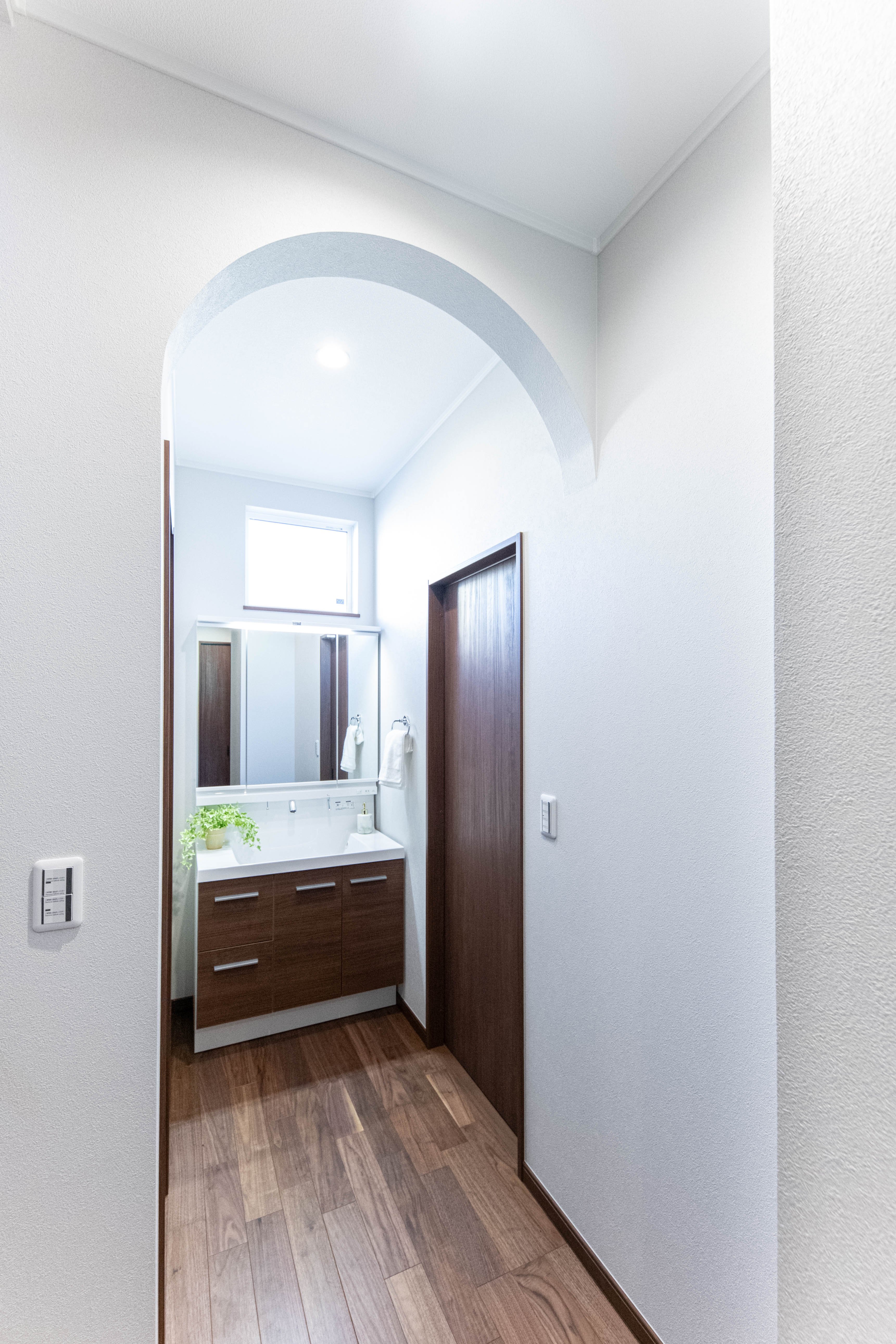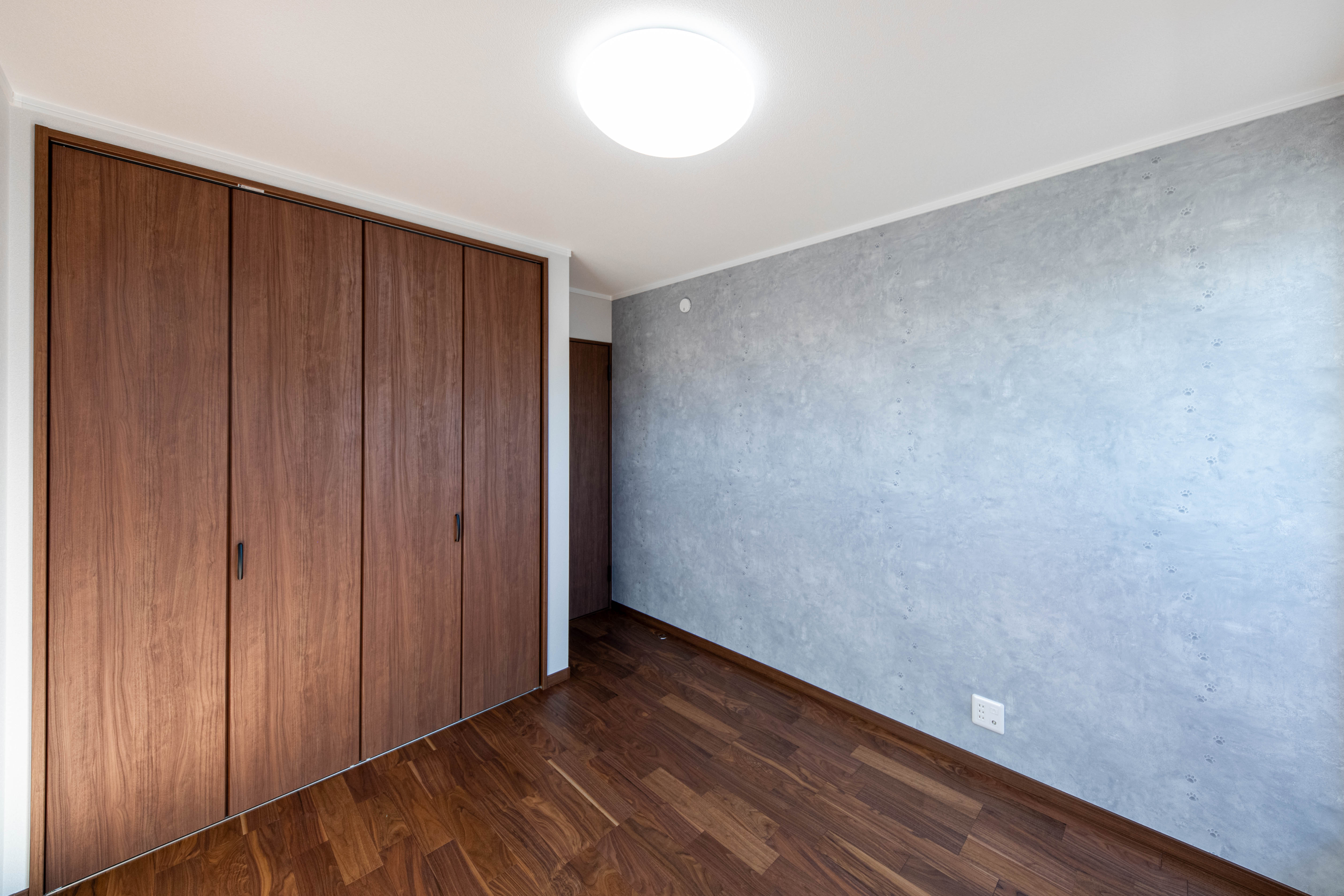リビングは脱衣室・廊下へ行き来可能で回遊動線のある便利な間取りになっています。洋室にレンガ調や猫の足跡がさりげなく入ったアクセントクロスを使い、洗面スペースはアール壁を施したりと所々に個性が感じられる素敵なお家が完成しました。