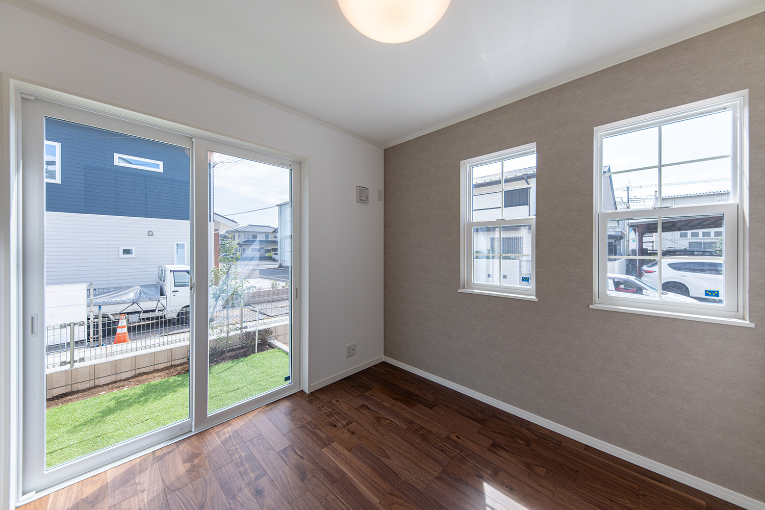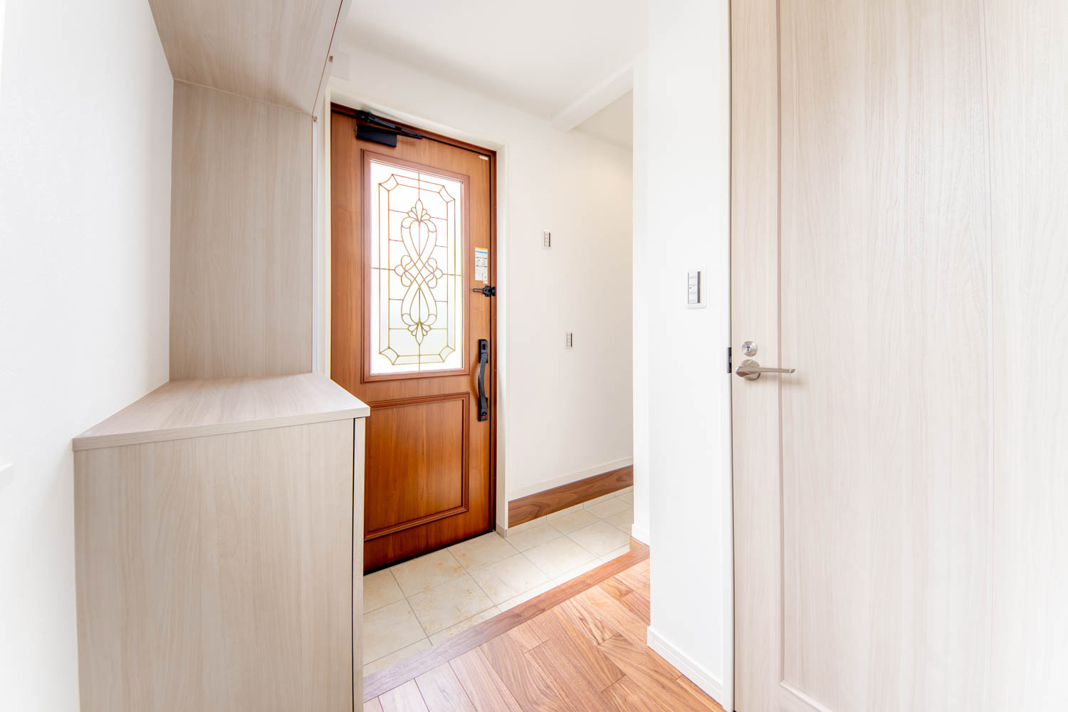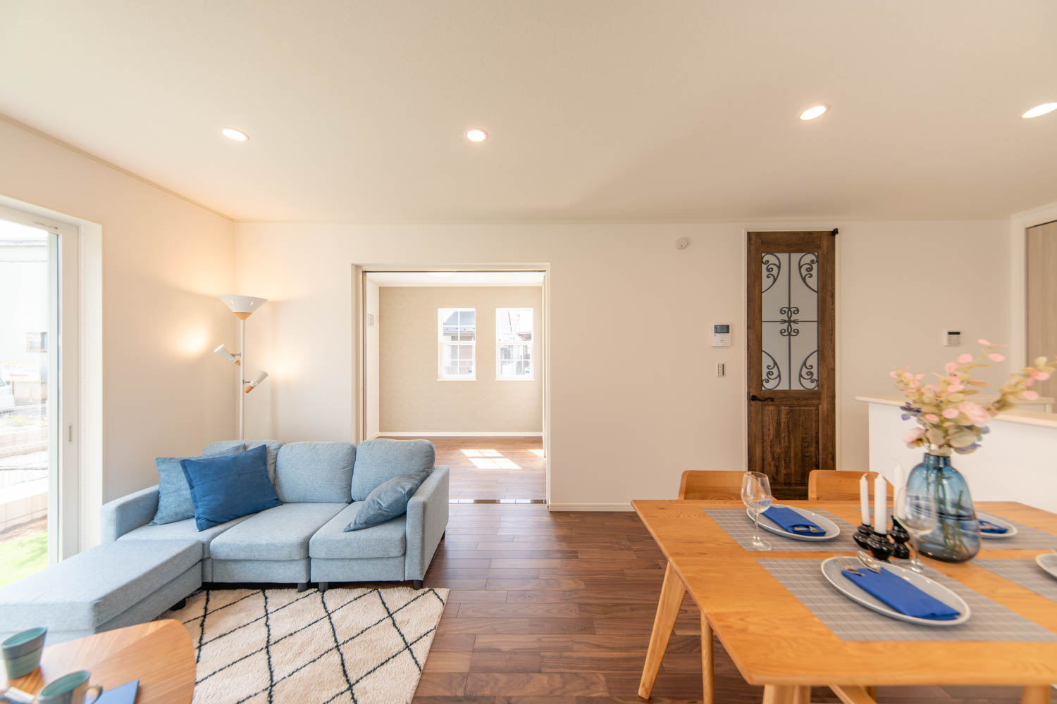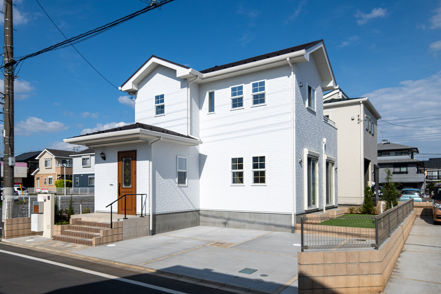 落ち着きと上品さを兼ね備えた空間に、優美なデザインのリビングドアや玄関扉がアクセントを添えています。洋室にはアッシュ系のやわらかな色味を取り入れ、穏やかで居心地の良い雰囲気に。真っ白な外壁と格子付きの上げ下げ窓が印象的な外観は、青空によく映える爽やかな佇まい。細部までデザインにこだわった、やさしい上質感のある住まいが完成しました。