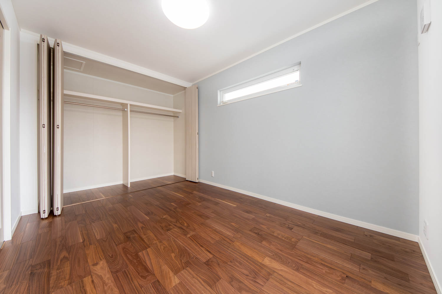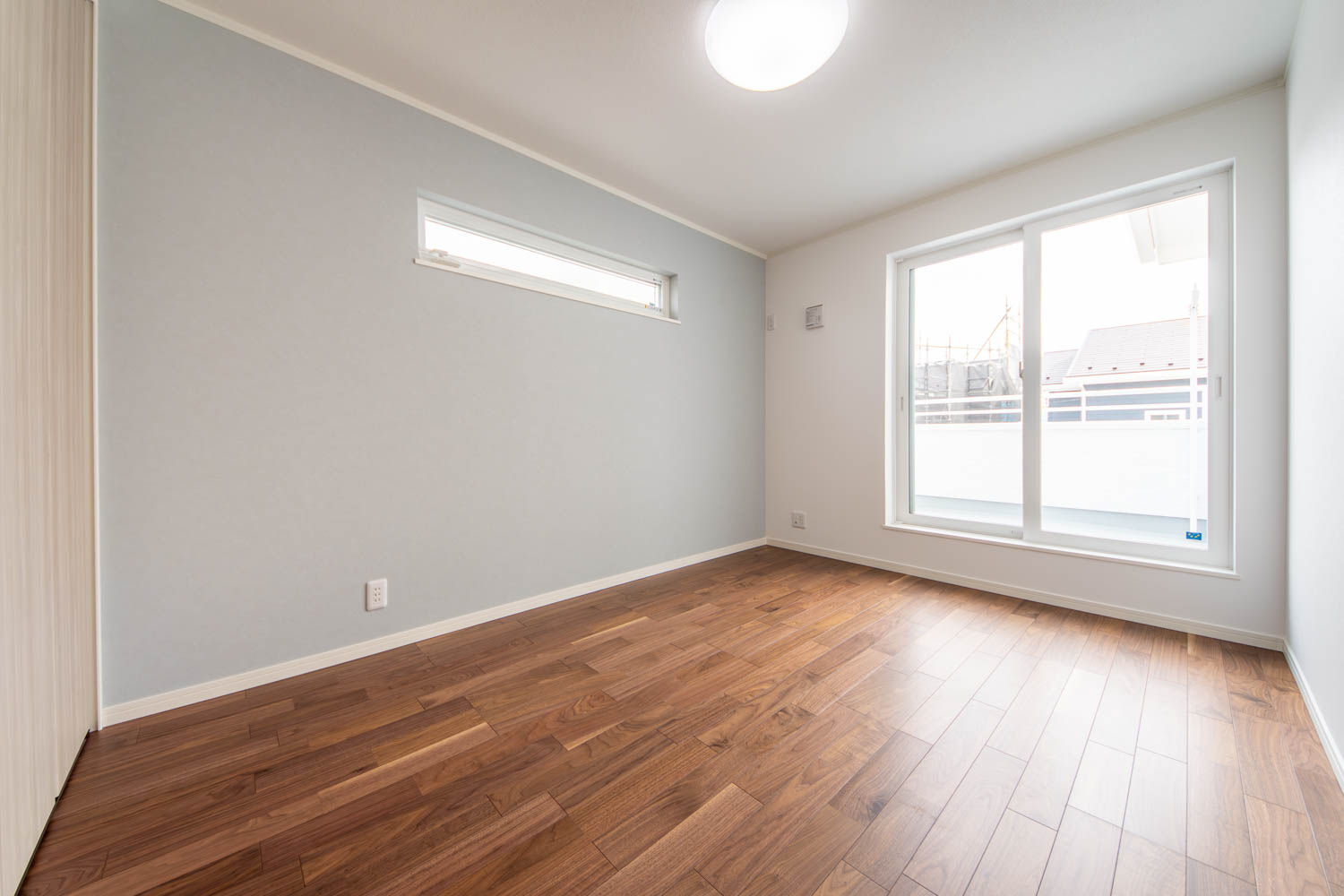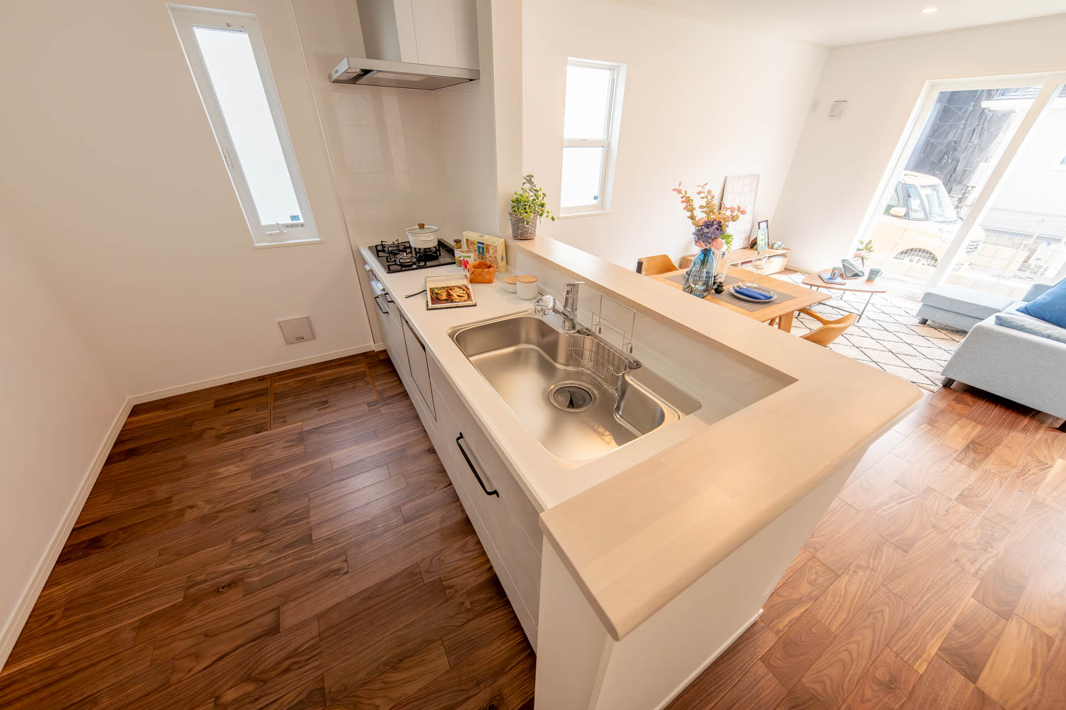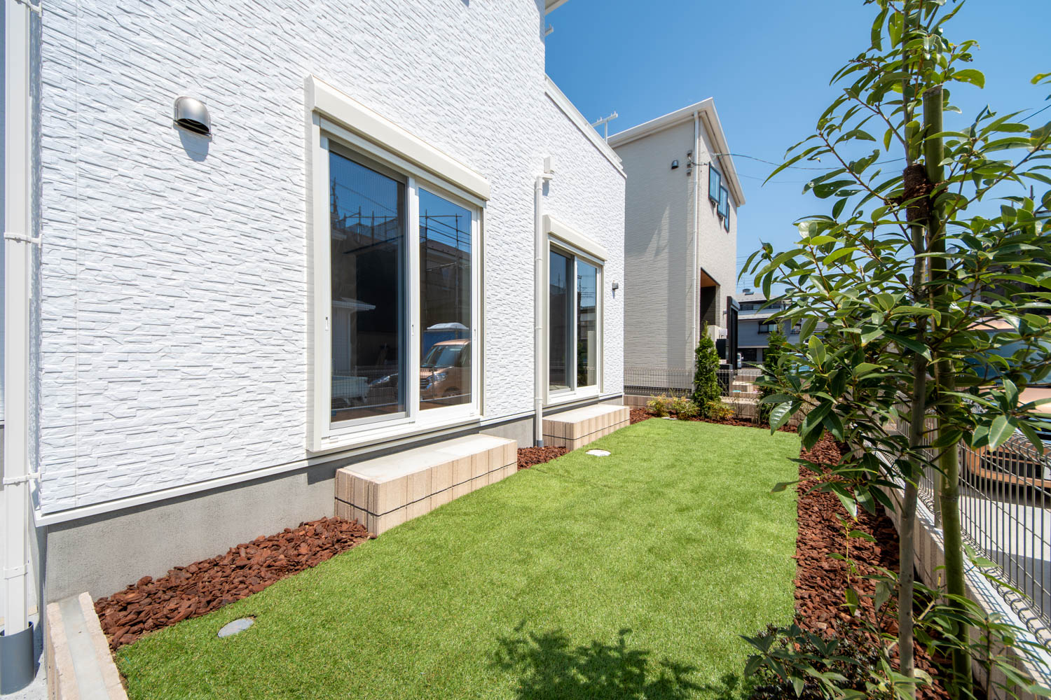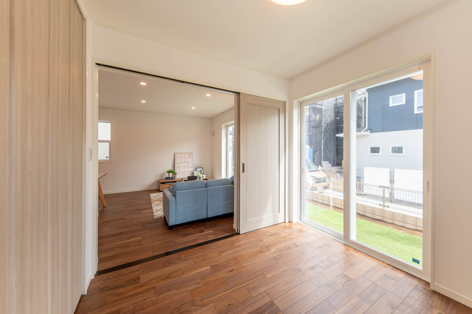 落ち着きと上品さを兼ね備えた空間に、優美なデザインのリビングドアや玄関扉がアクセントを添えています。洋室にはアッシュ系のやわらかな色味を取り入れ、穏やかで居心地の良い雰囲気に。真っ白な外壁と格子付きの上げ下げ窓が印象的な外観は、青空によく映える爽やかな佇まい。細部までデザインにこだわった、やさしい上質感のある住まいが完成しました。