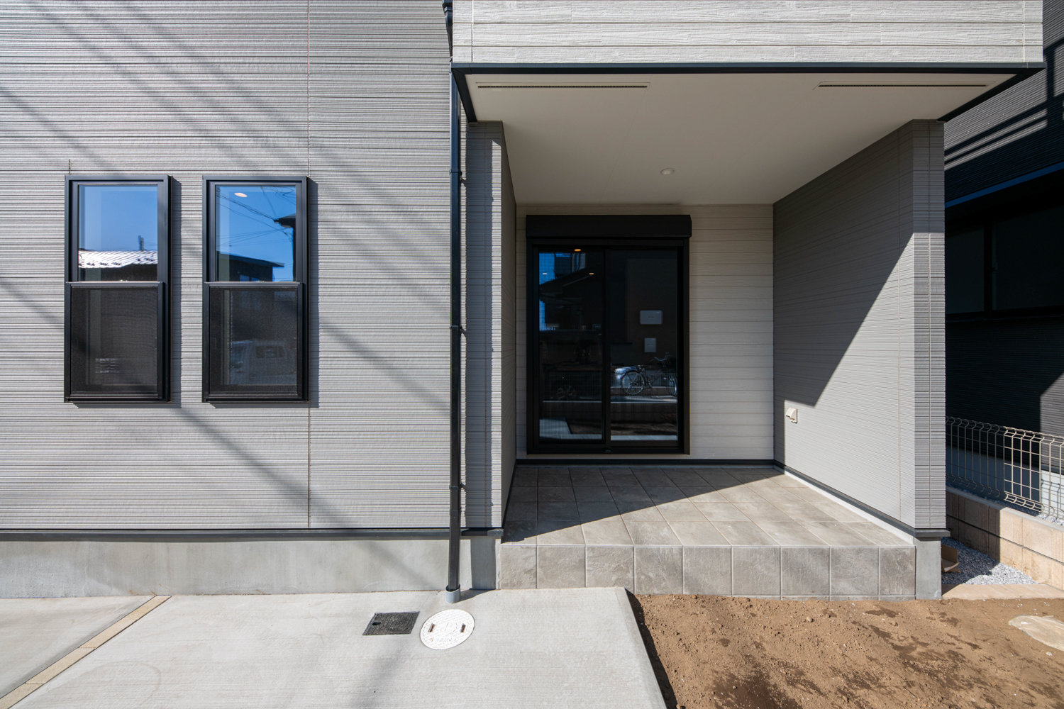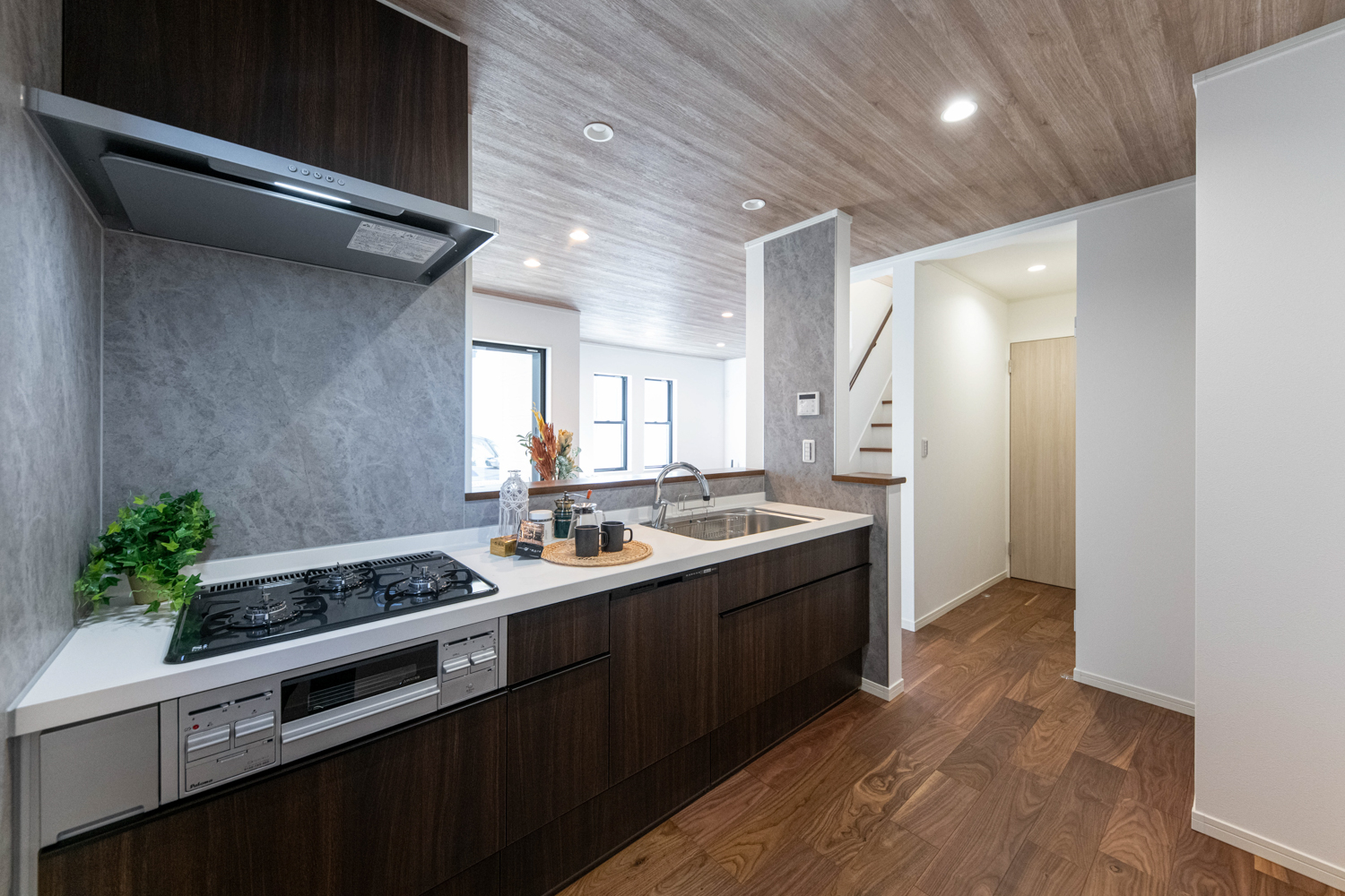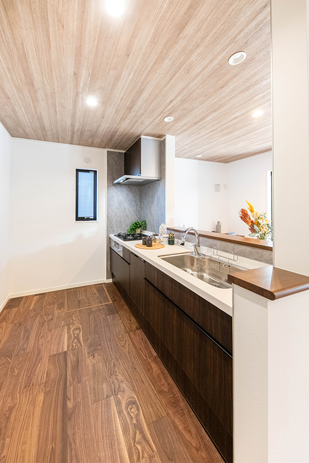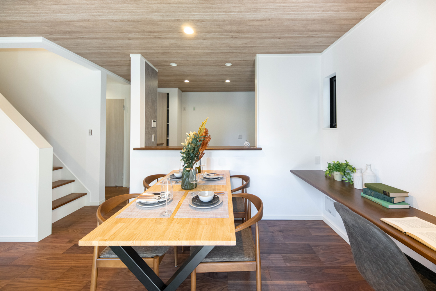 深みのあるブラックウォルナットの床と、グレイッシュな天井クロスが調和する上品なリビング。リビングイン階段や回遊動線が、家族の動きに寄り添った暮らしやすさを叶えます。ダイニング横のカウンターは、勉強や作業スペースとして活躍。テラスでは、季節の風を感じながらティータイムも楽しめ家の中も外も心地よく過ごせるお家が完成しました。