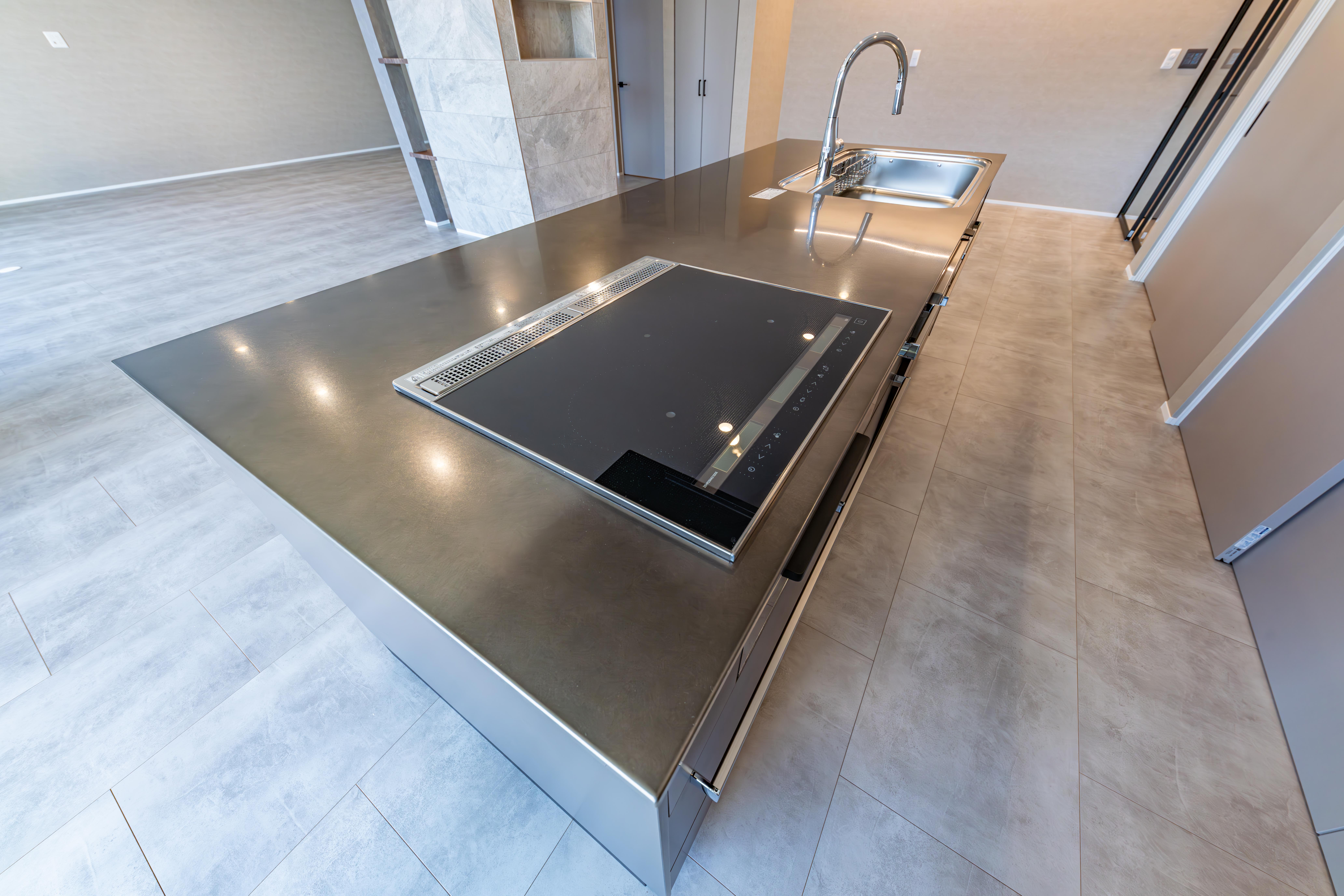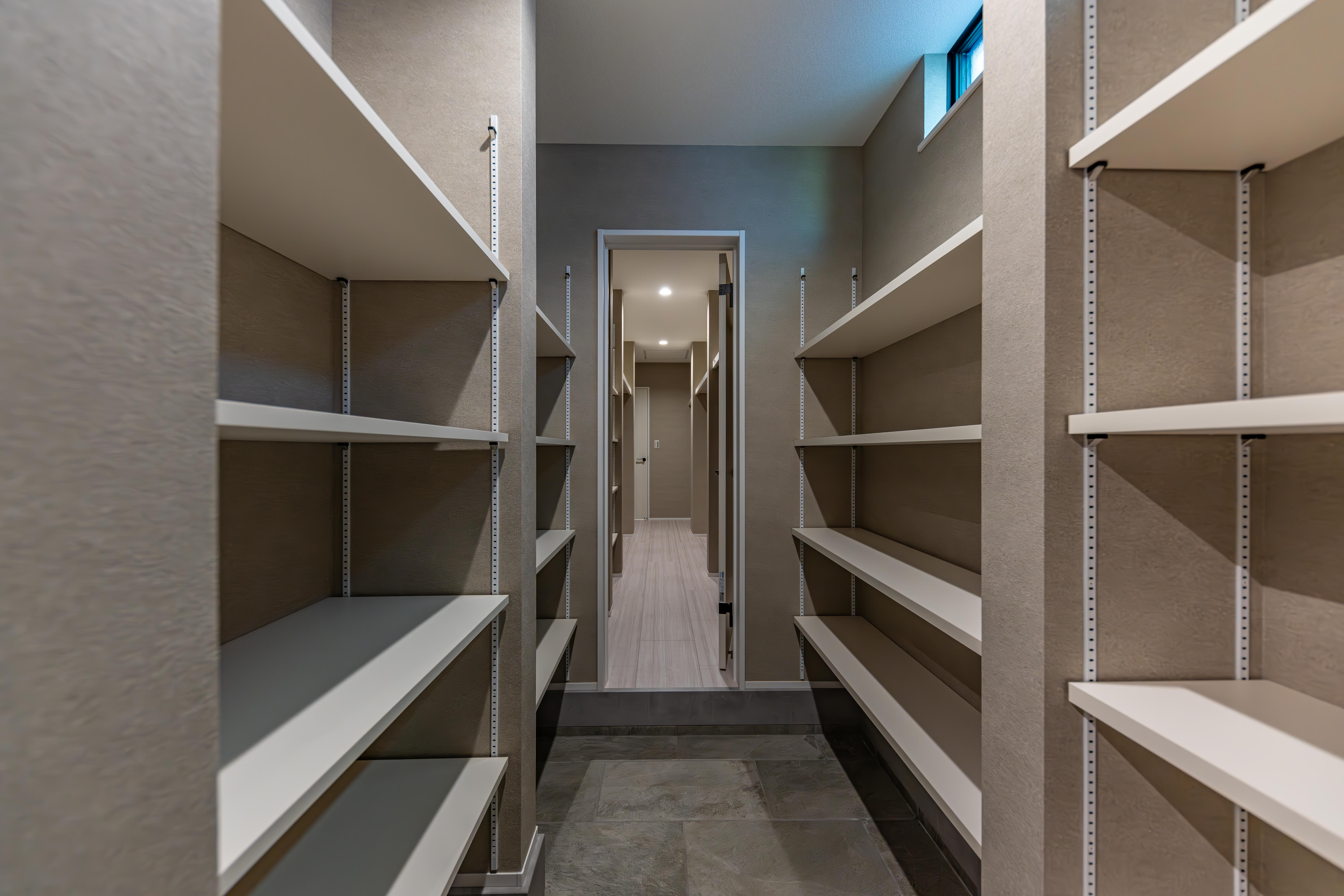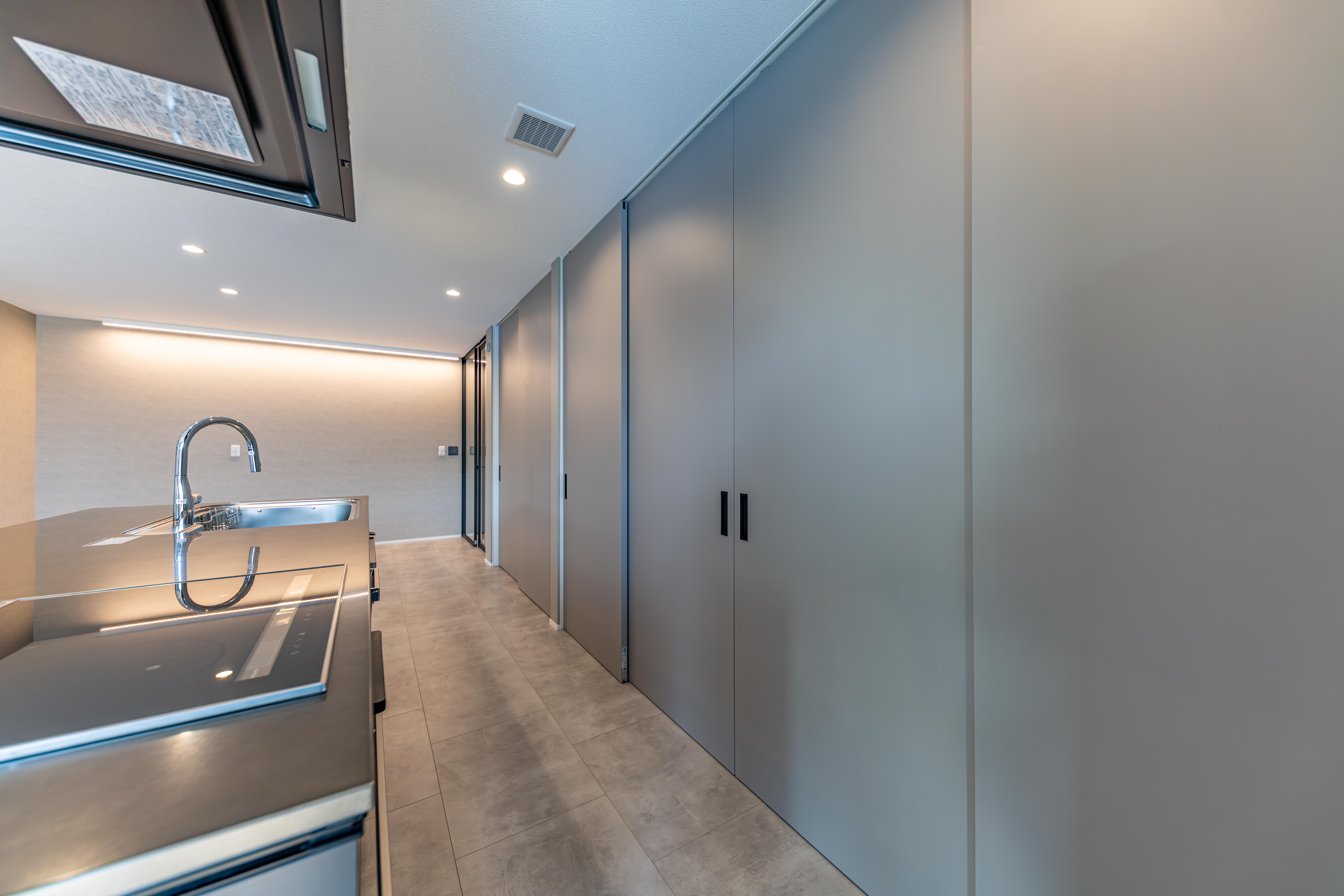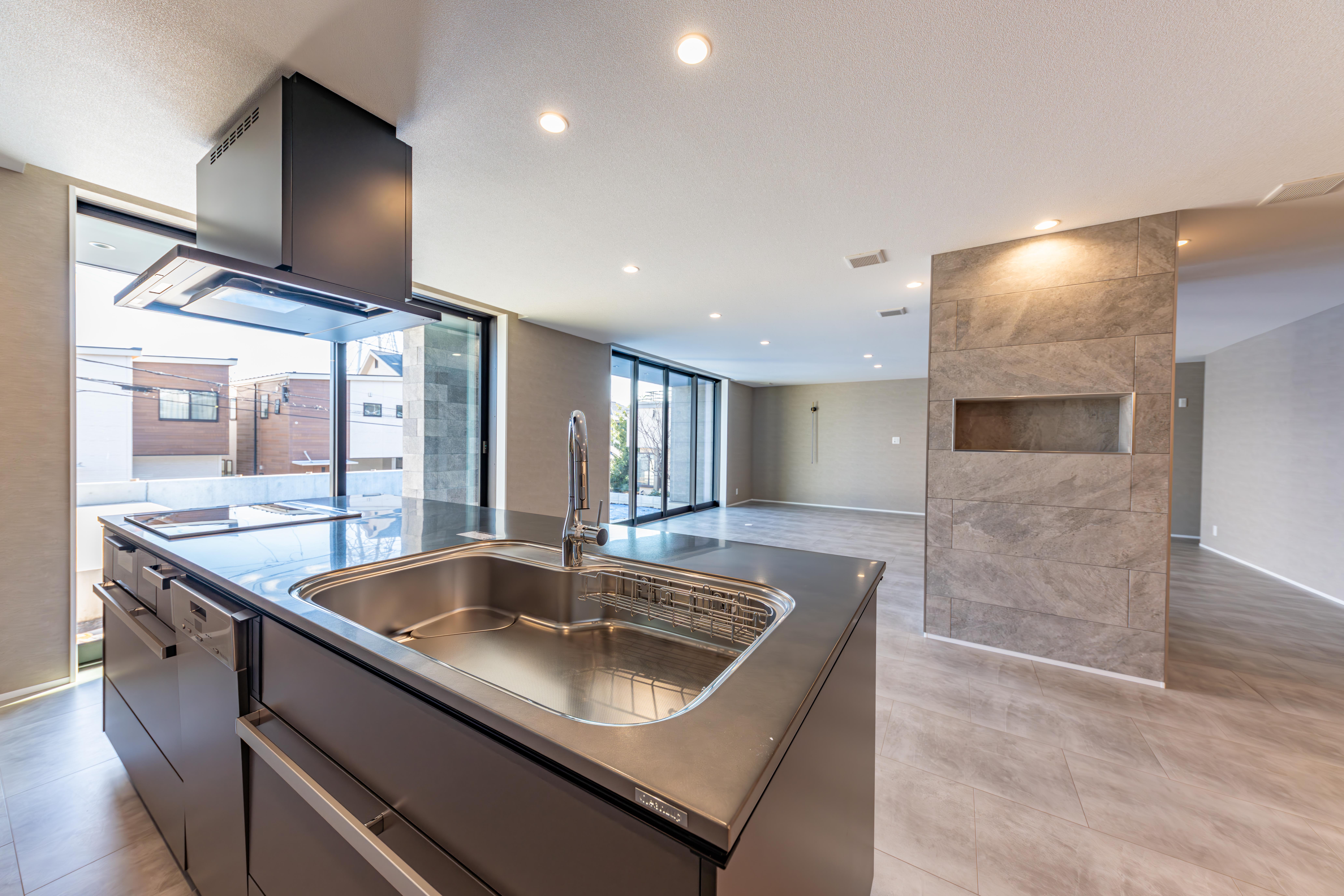 開放感溢れる41.75帖の広々としたLDKに、すっきりと美しく整えられた暮らしが広がる空間。アイランドキッチンには大容量のパントリーを備え、冷蔵庫も扉の中に収めて生活を感じさせない工夫が。玄関ホールのオープン階段やハイドアがより一層室内に開放感をもたらします。洗練された日常を叶えるこだわりのお家が完成しました。