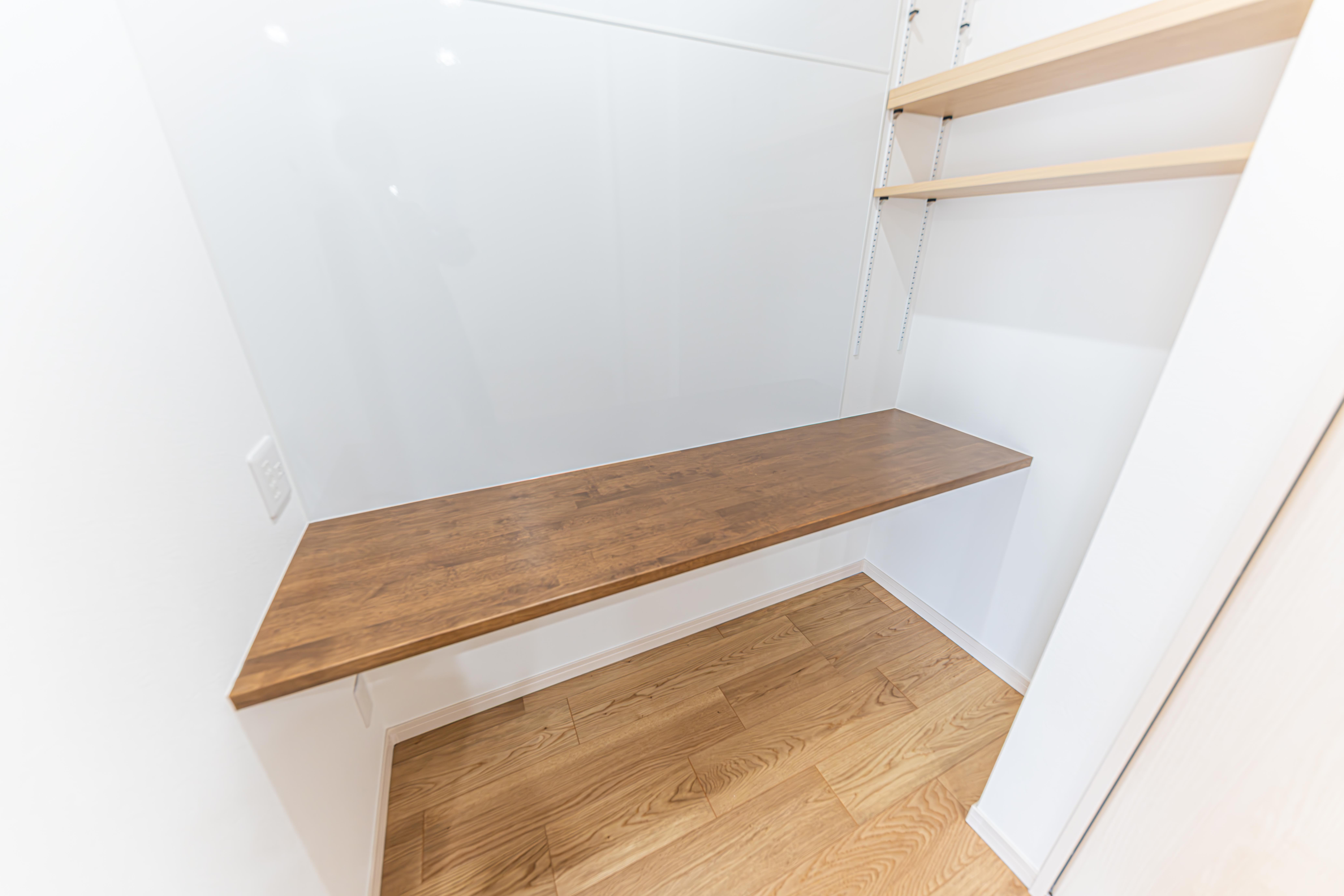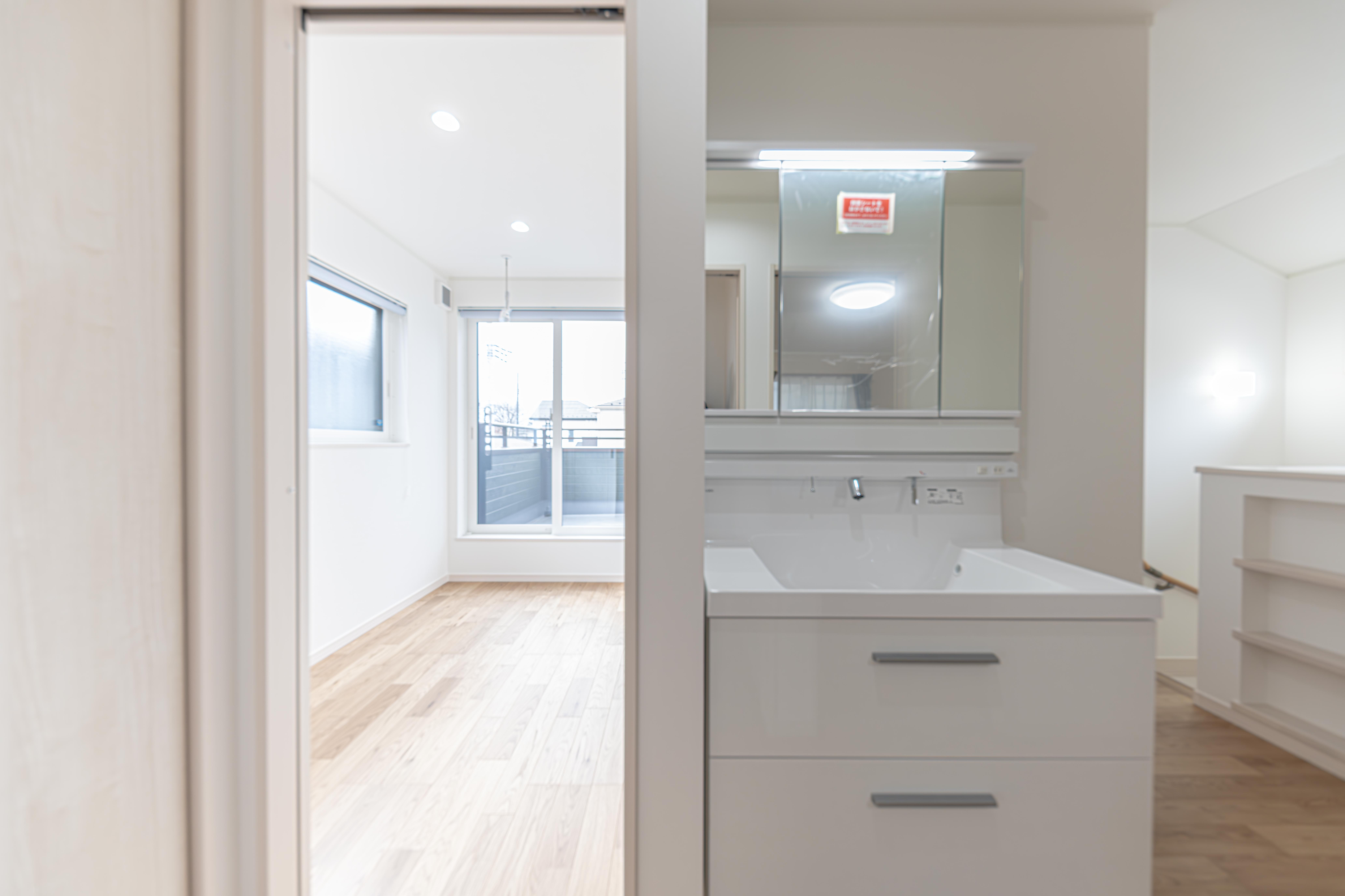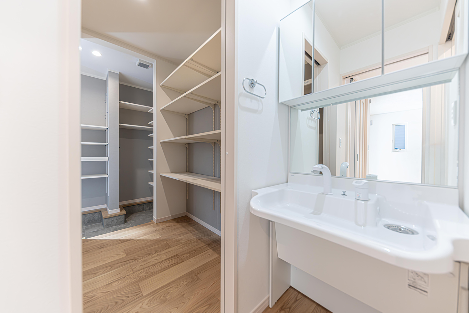 玄関にはシューズインクローゼットとファミリークローゼットが並び、身支度がスムーズに。また、独立洗面台をはじめ、脱衣室や2階ホールにも洗面台を設け忙しい朝の時間も快適に。ちょっとした収納や作業ができるカウンターがあり、家族それぞれの時間が大切にできるお家が完成しました。