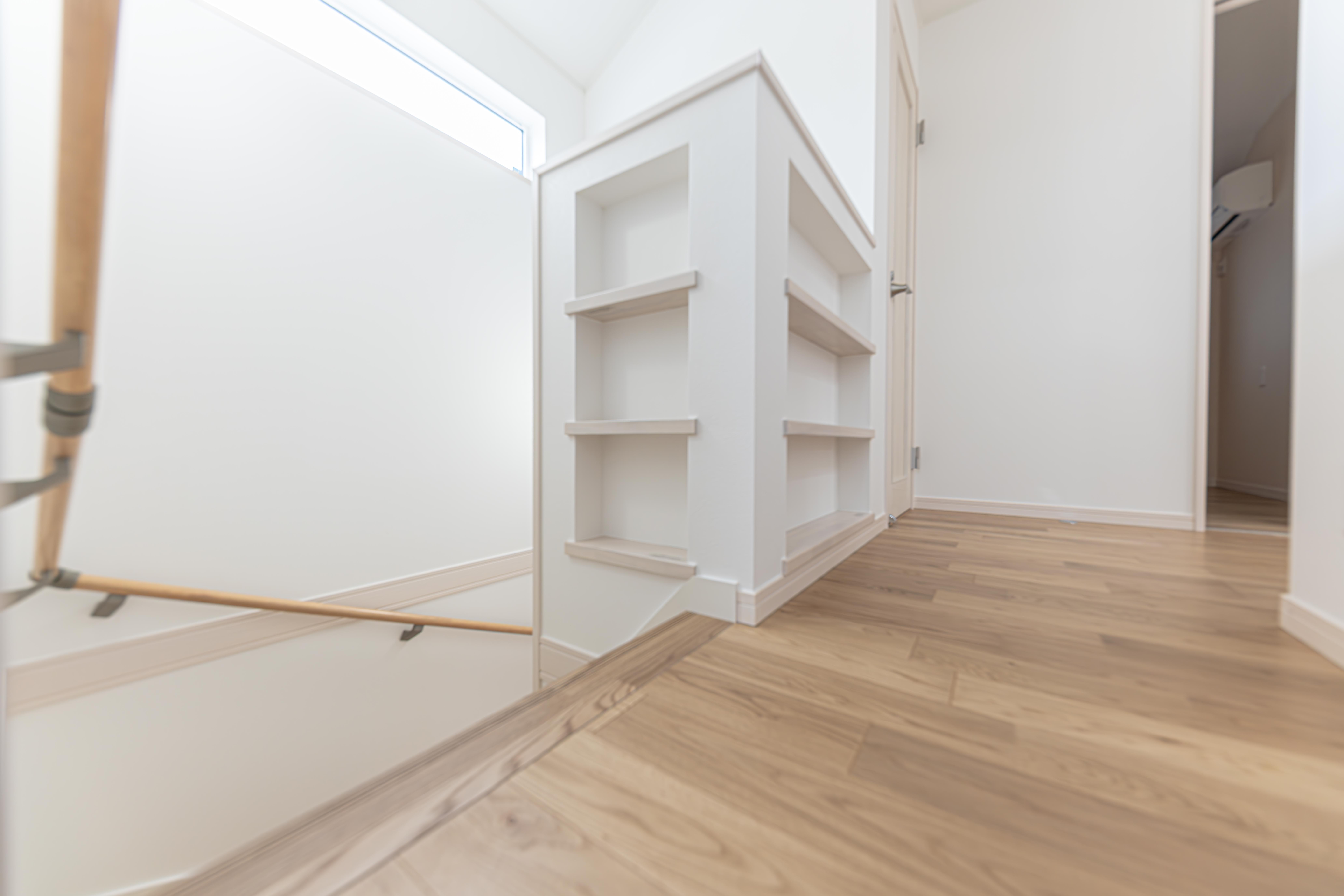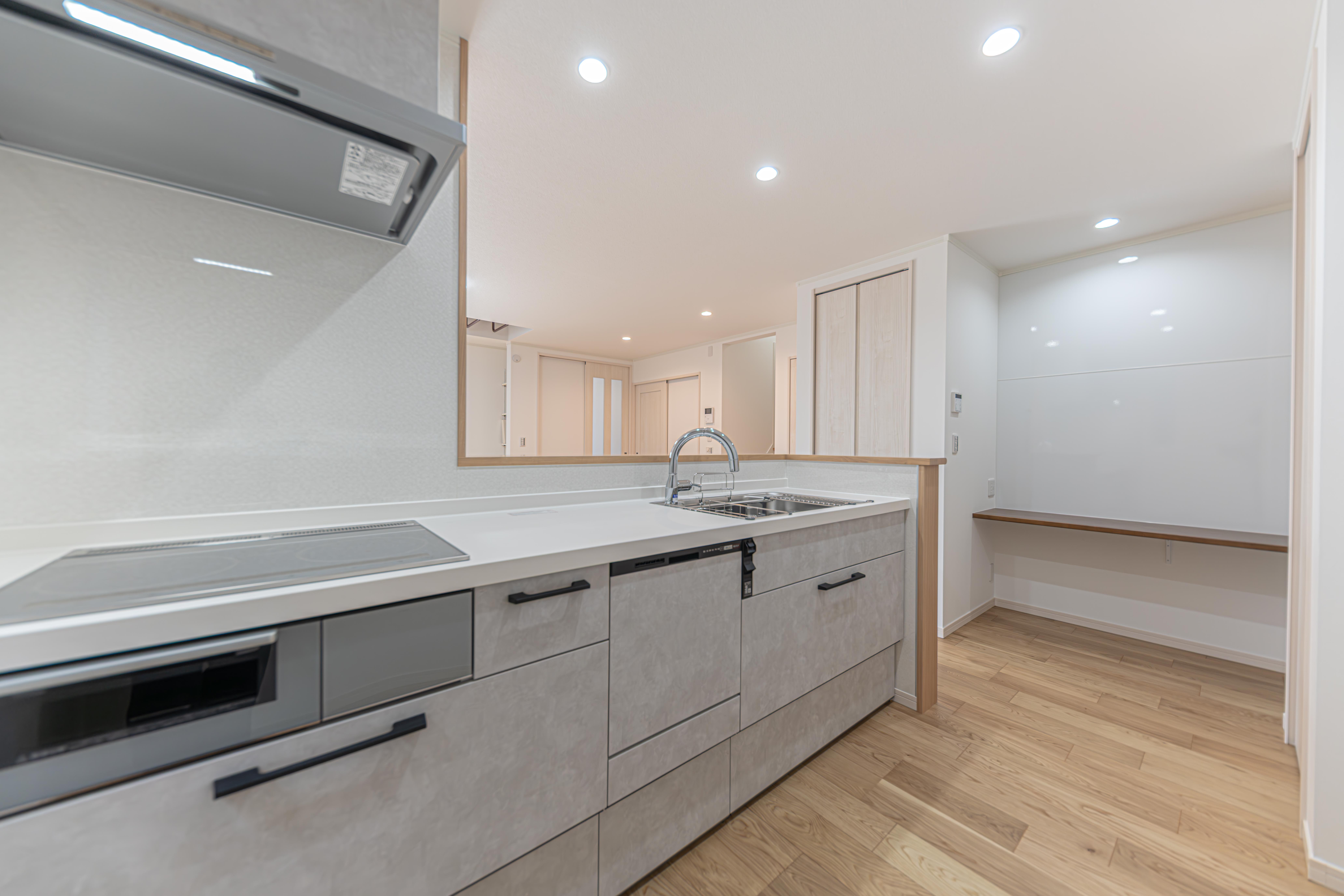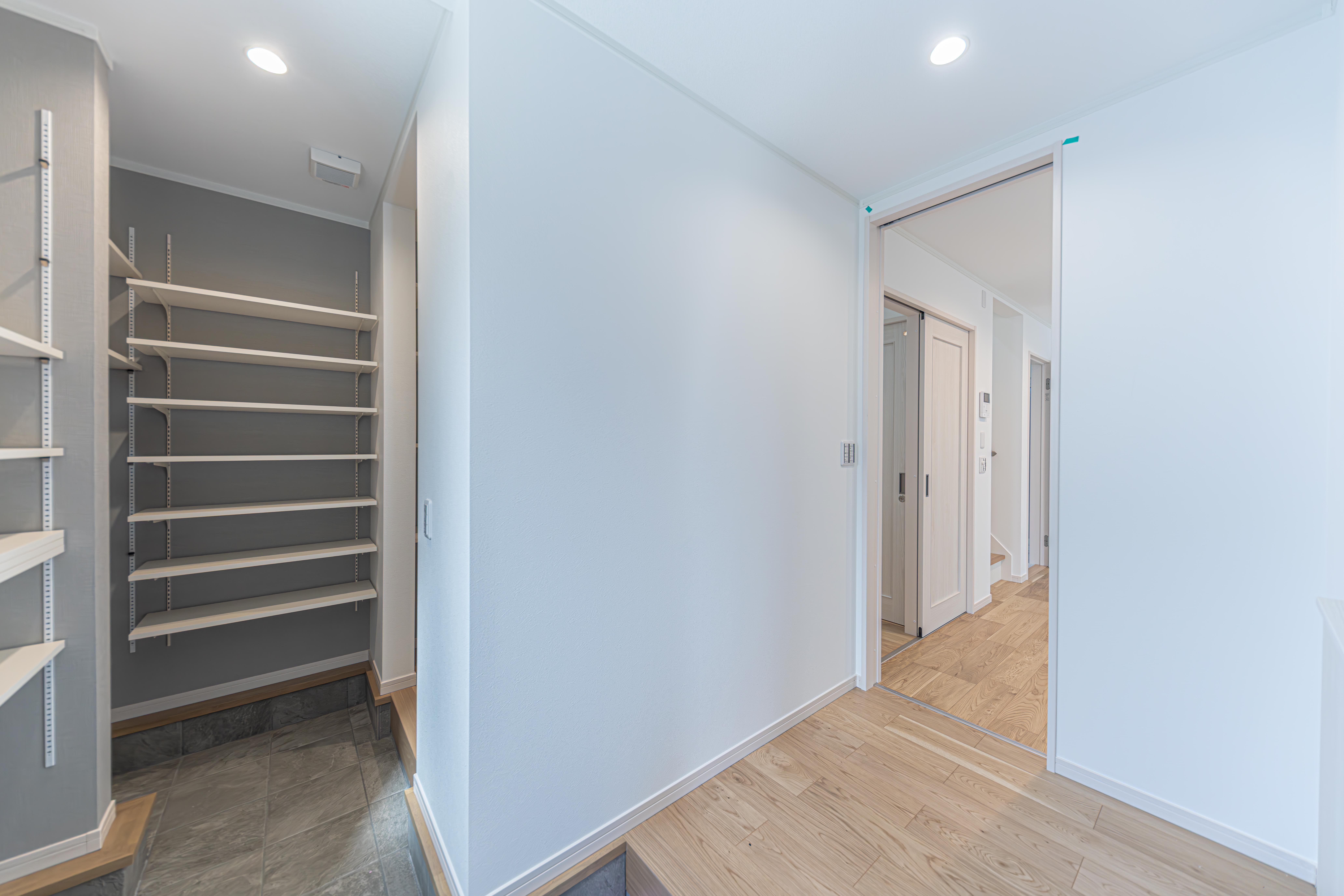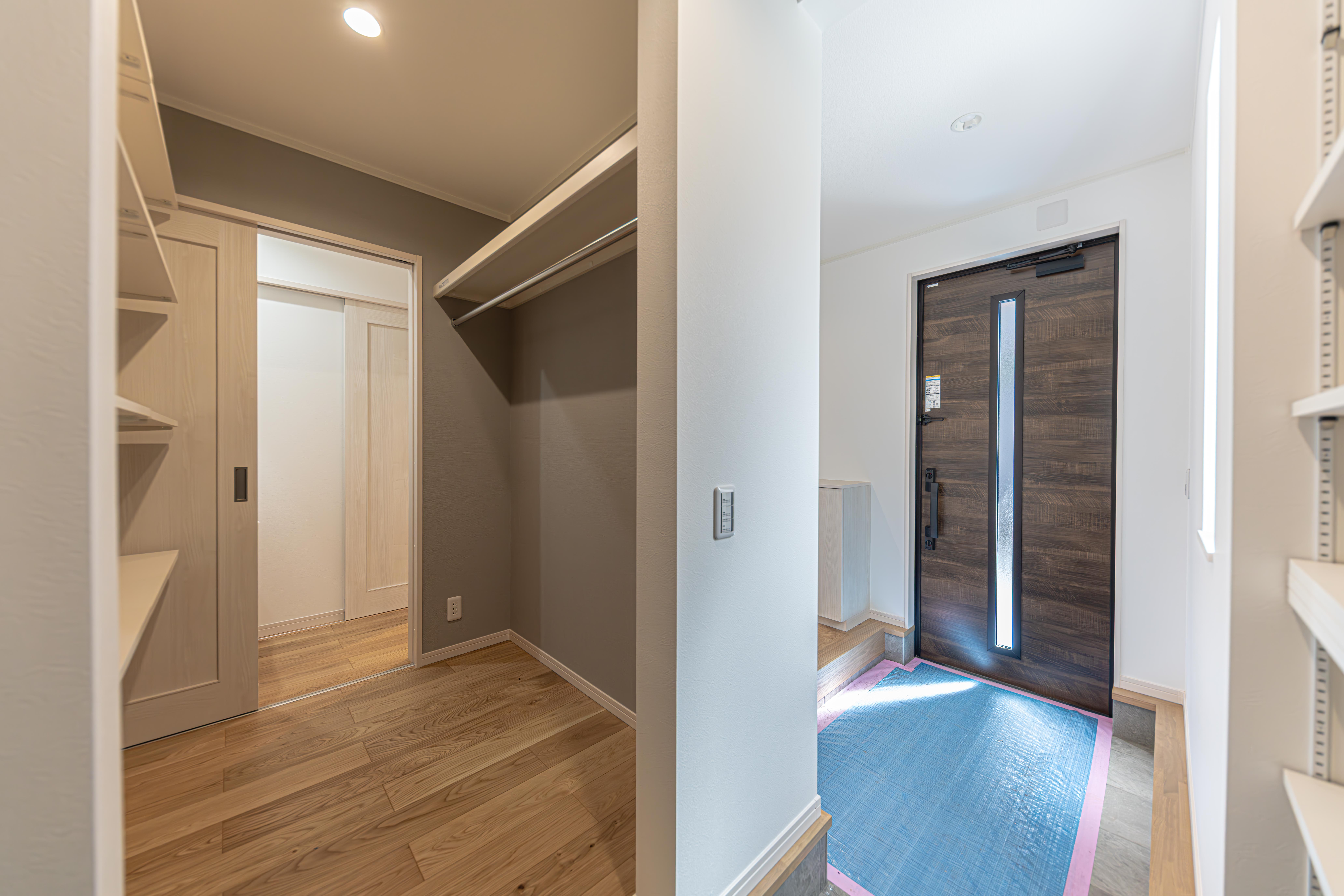 玄関にはシューズインクローゼットとファミリークローゼットが並び、身支度がスムーズに。また、独立洗面台をはじめ、脱衣室や2階ホールにも洗面台を設け忙しい朝の時間も快適に。ちょっとした収納や作業ができるカウンターがあり、家族それぞれの時間が大切にできるお家が完成しました。