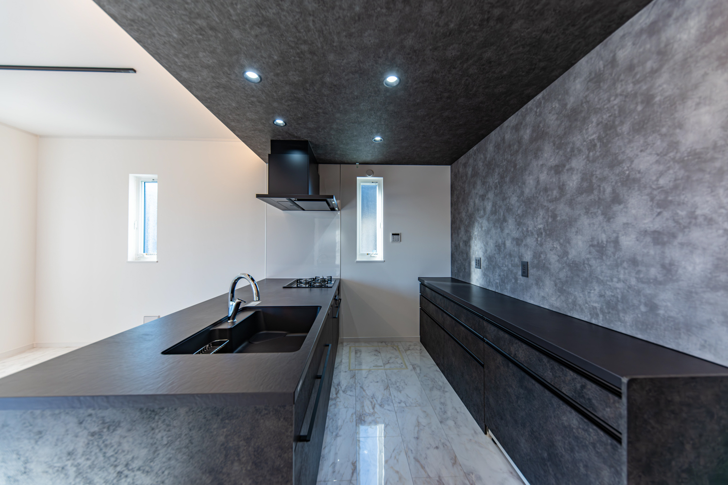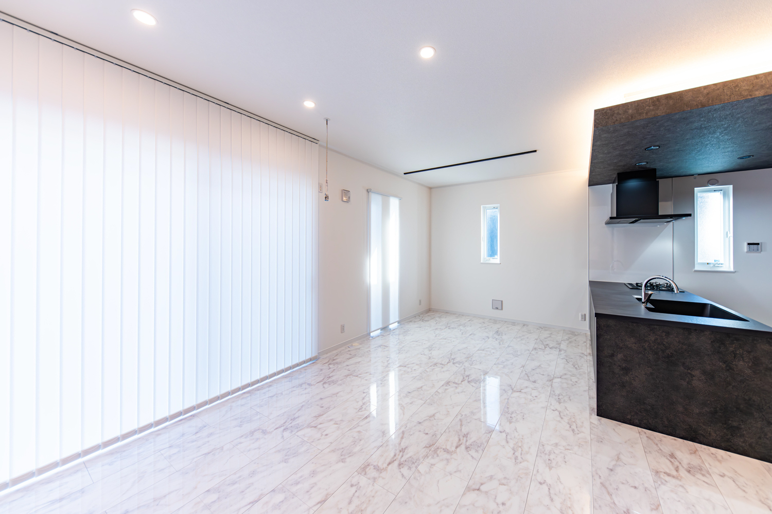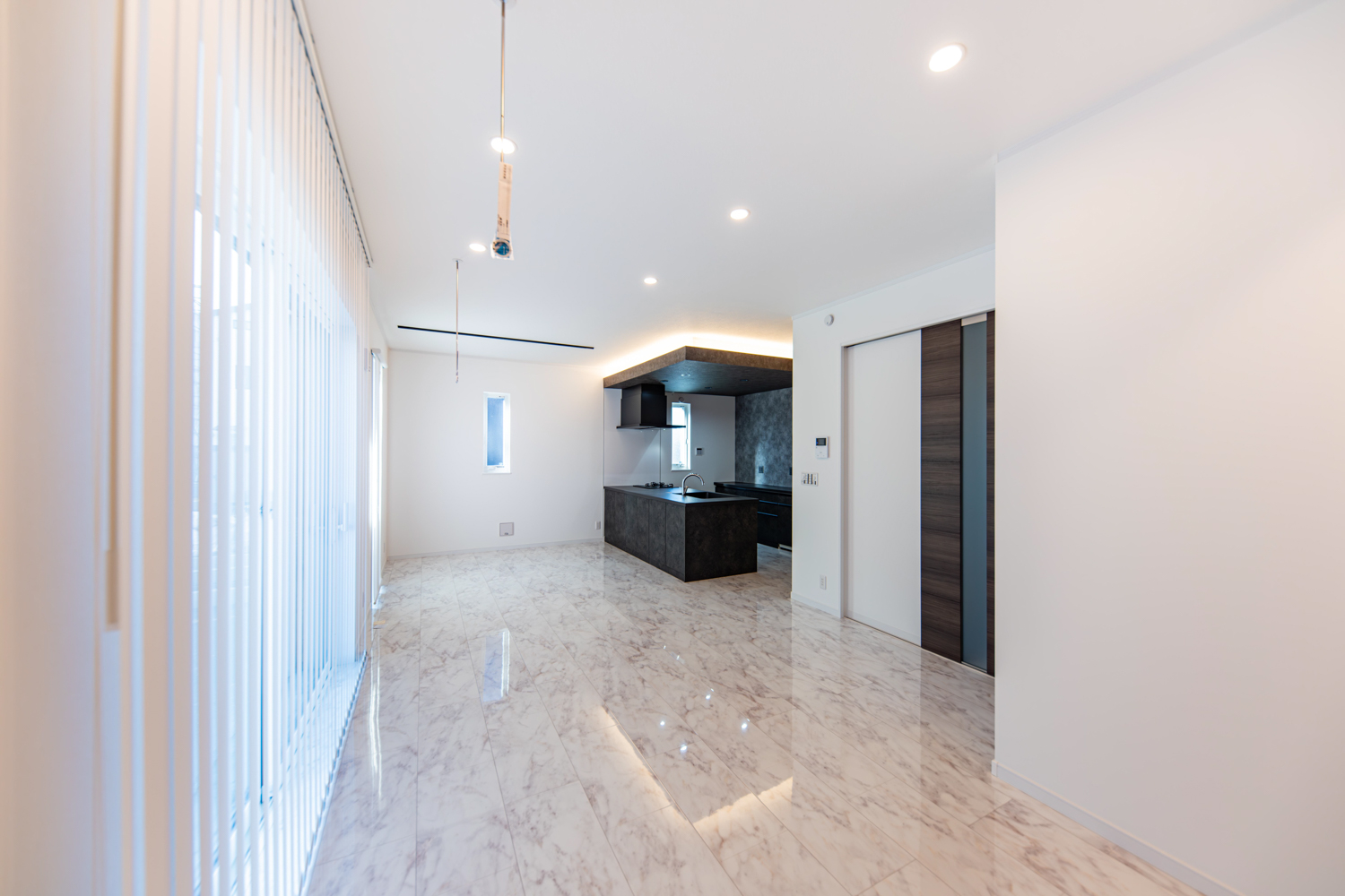 石目柄の光沢フロアが上品に輝く、開放的なリビング。ハイスタッドとダウンライトが生む広がりのある空間に、黒い石目柄のキッチンと統一感のあるカップボードが洗練された雰囲気を演出します。2階には、大容量のクローゼットや、スマートな室内物干し付きのお部屋を完備。デザインと機能性が調和した、心地よい暮らしが叶うお家が完成しました。